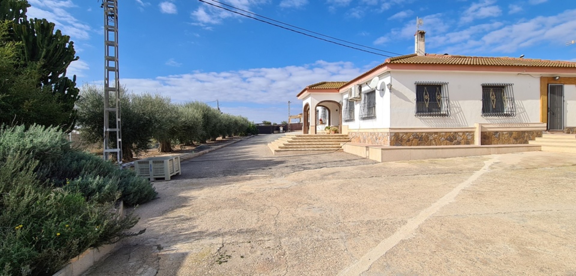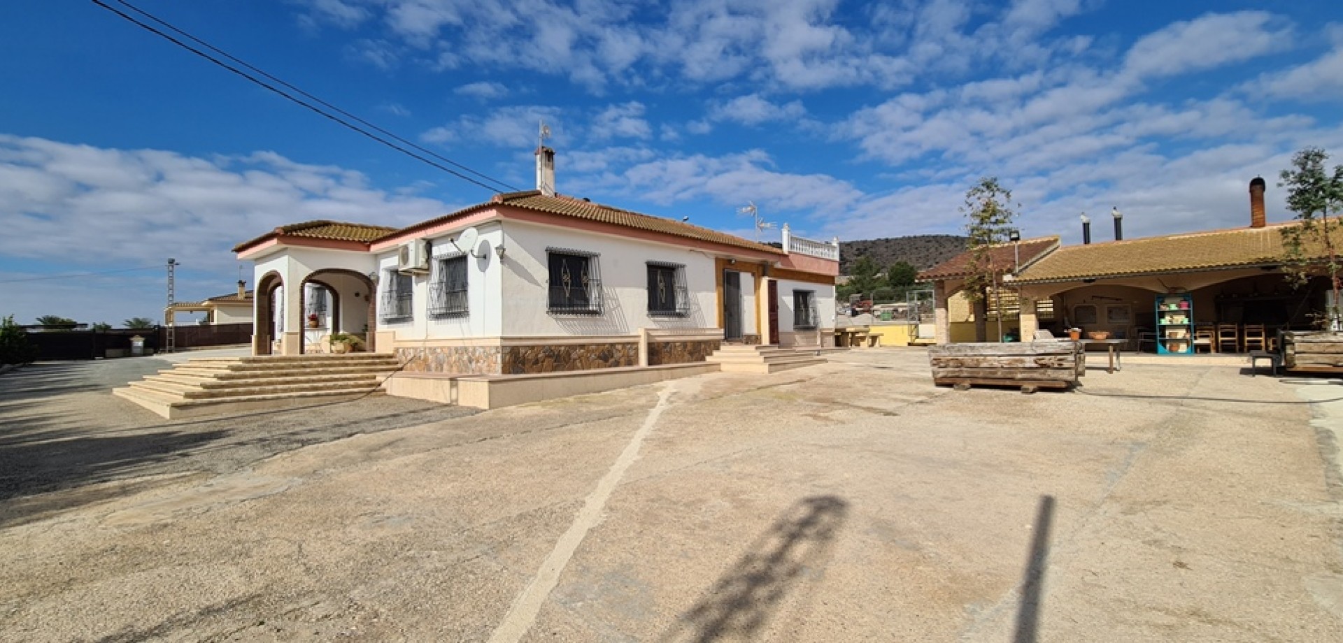 Ta urocza typowa hiszpańska willa położona jest na dużej działce o powierzchni 10 000 m² i jest idealna na przykład dla przedsiębiorcy, który potrzebuje dużo miejsca do pracy, ale chce też być blisko domu i rodziny. Całkowicie zamknięta przestrzeń robocza o powierzchni 400 m², zadaszony warsztat na zewnątrz, liczne pomieszczenia magazynowe i obszary składowania, .. krótko mówiąc, za dużo, aby wymieniać, ale zdecydowanie warto! Jeśli nie potrzebujesz tych przestrzeni roboczych, możesz je również przekształcić w dodatkowy dom, jeśli chcesz. Prywatny dom ma całkowitą powierzchnię użytkową 330 m², wszystko na jednej kondygnacji i składa się z bardzo przestronnej kuchni z zamkniętym kominkiem, dużego pomieszczenia gospodarczego/pralni, pokoju dziennego, jadalni, 2 holi wejściowych (z przodu i z tyłu), 2 łazienek, 3 sypialni, dużej garderoby i pięknego zadaszonego tarasu. Obiekt posiada ogrzewanie centralne. Dom ma wyjątkowo dużą piwnicę, którą można wykorzystać do wielu celów. Pomieszczenie techniczne na basen znajduje się w oddzielnej części piwnicy. Prywatny teren zewnętrzny zawiera również piękną kuchnię zewnętrzną z autentycznymi piecami opalanymi drewnem, rusztem, kominkiem itp. A za nim znajduje się piękna ogrodzona strefa relaksu z podgrzewanym basenem z wbudowanymi elementami jacuzzi przy schodach i wodospadem z dyszami. Jest również zadaszony teren zewnętrzny i łazienka/garderoba z prysznicem i toaletą. Teren obiektu zabezpieczony jest systemem alarmowym z kamerami. Cały majątek opisany jest w 2 aktach notarialnych. Całkowity roczny podatek gruntowy wynosi około 1000 € W razie jakichkolwiek pytań lub chęci obejrzenia towaru, prosimy o kontakt.
