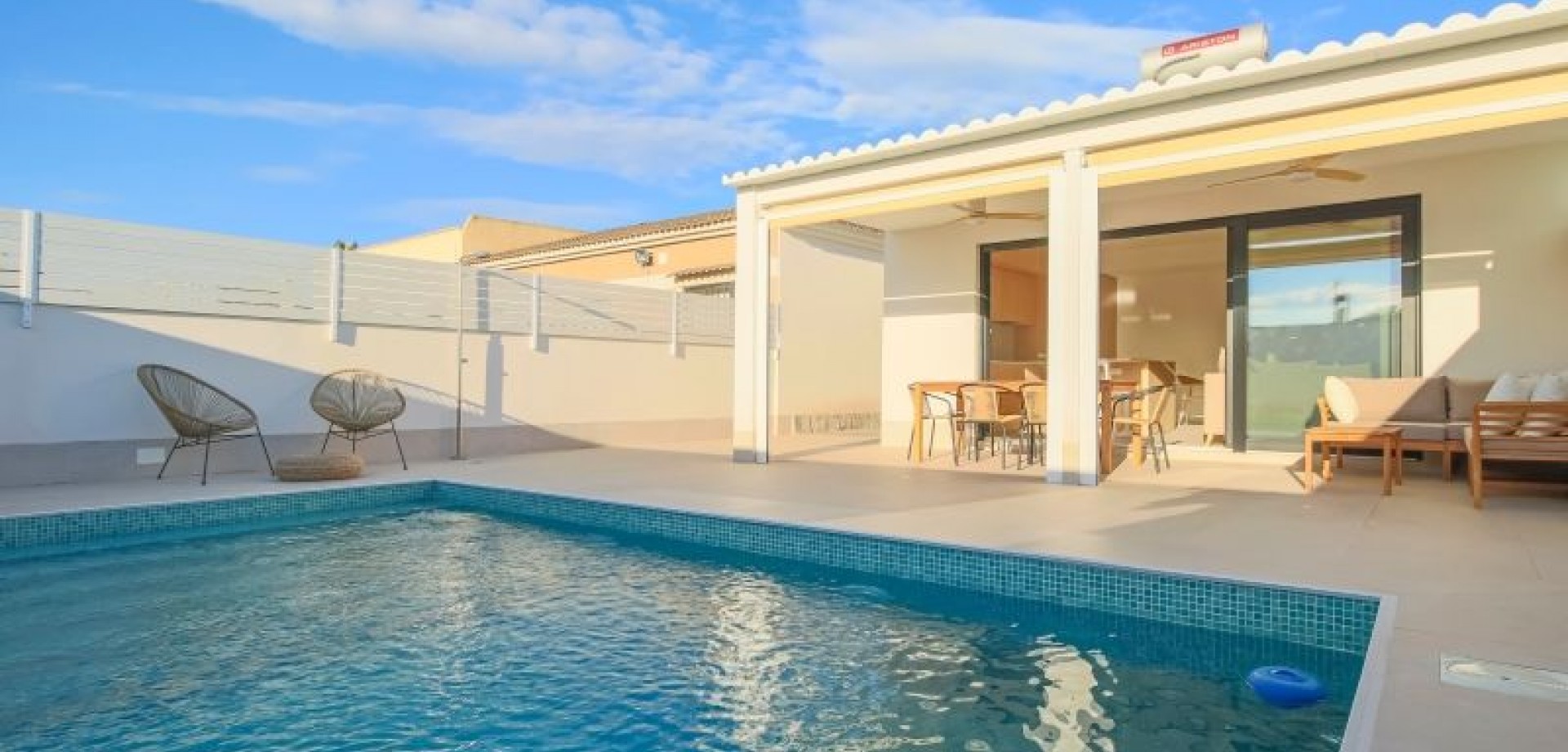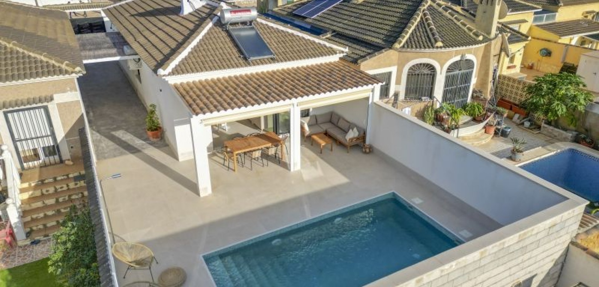 Incredibly beautiful and completely renovated semi-detached house with a villa-like feel in the popular area of El Chaparral, just north of Torrevieja. The house is on one level and consists of three bedrooms, two bathrooms, and a spacious living room with an open kitchen and plenty of light. From the living room, you can access the grounds with the beautiful patios and the inviting pool area. The house was completely renovated in 2024 and has a bright, modern, and very elegant design. The entire house is truly welcoming, and here the whole family can enjoy everything Torrevieja has to offer. In the vicinity of the residence, there are several restaurants, bars, and services such as banks, grocery stores, gas stations, and the like. Here you can take pleasant walks along the salt lake. Torrevieja and its surroundings offer fun for the whole family and all ages, including golf, bowling, a cinema, shopping, and beach hangouts. The city's largest shopping center can be reached in about 5 minutes by car, and the nearest beach in about 10 minutes. San Luis is perfectly located between Torrevieja, Los Montesinos, and Ciudad Quesada. If you're looking for a completely renovated home with a unique, modern style, you've found the right place.