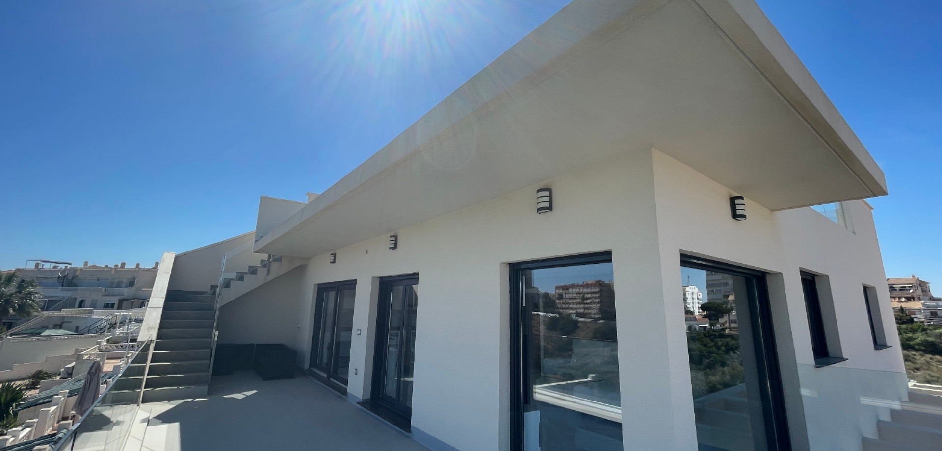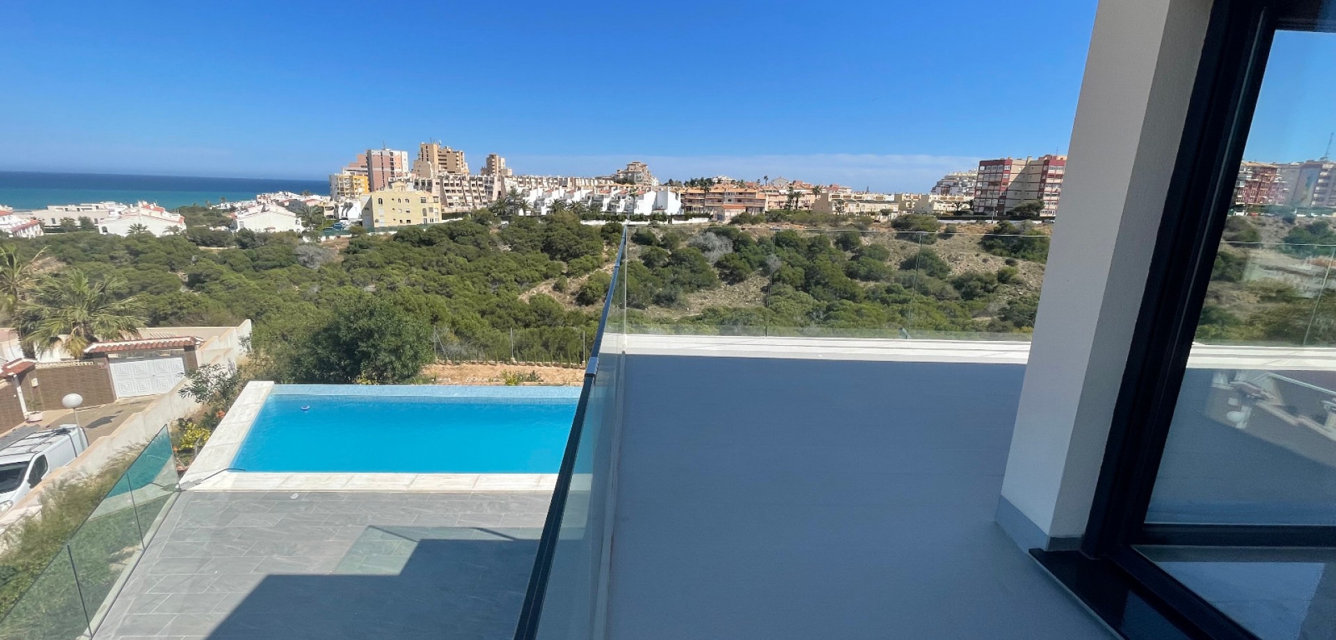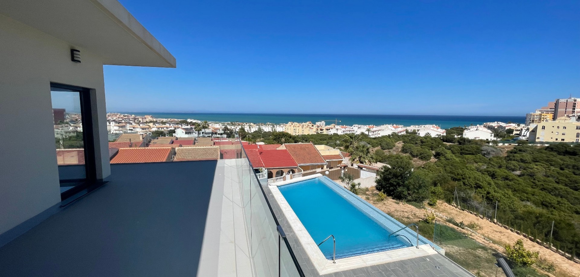 A semi-detached house with a private pool, all nearly new, recently built, stunning views, near La Mata beach in Torrevieja, independent access to the first-floor house. The house has two separate units. 2 fully equipped kitchens, sold furnished, has a spacious garage.