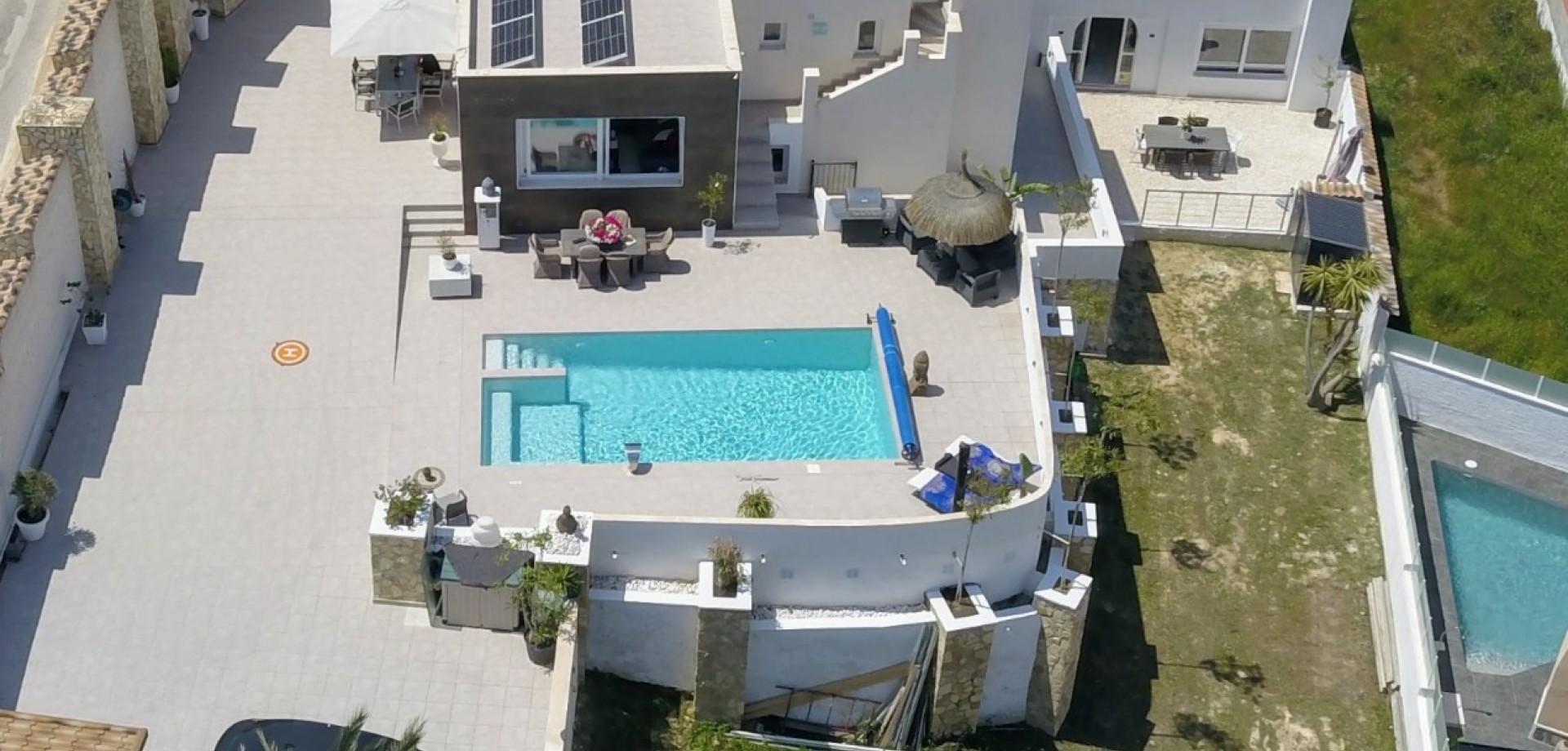 Luxury villa for a large familyProperty comprising 4 buildings, a main villa and 3 flats on 1,000 m2 of land1)With a spacious villa of 150m² with large living room and full view of the valley and pool and open kitchen with island, 2 bedrooms, both with en suite bathrooms.2)Corner studio behind the villa with 1 bedroom and breakfast area, bathroom, TV, fridge, air conditioning and infrared heating and terrace.3)Apartment under the side of the villa with terrace and living room, small kitchen, bathroom and double bedroom, TV, fridge, air conditioning and infrared heating. Hot and cold air conditioning throughout and heating with infrared panels.4)Ground floor flat with large garden, living room, kitchen, bathroom, bedroom, air conditioning and beautiful views, 100m garden with bar.Equipment detailsRoof terrace with solar panel installation and sufficient terrace for a living room and panoramic sea views.Parking for 3 cars with possibility of extension, automatic gate.Swimming pool with special tiling, fountain, heating and jacuzzi in the pool. All with LED lighting.Beautiful plants and decoration and outdoor kitchen with fridge and freezer.Come and visit this opportunity