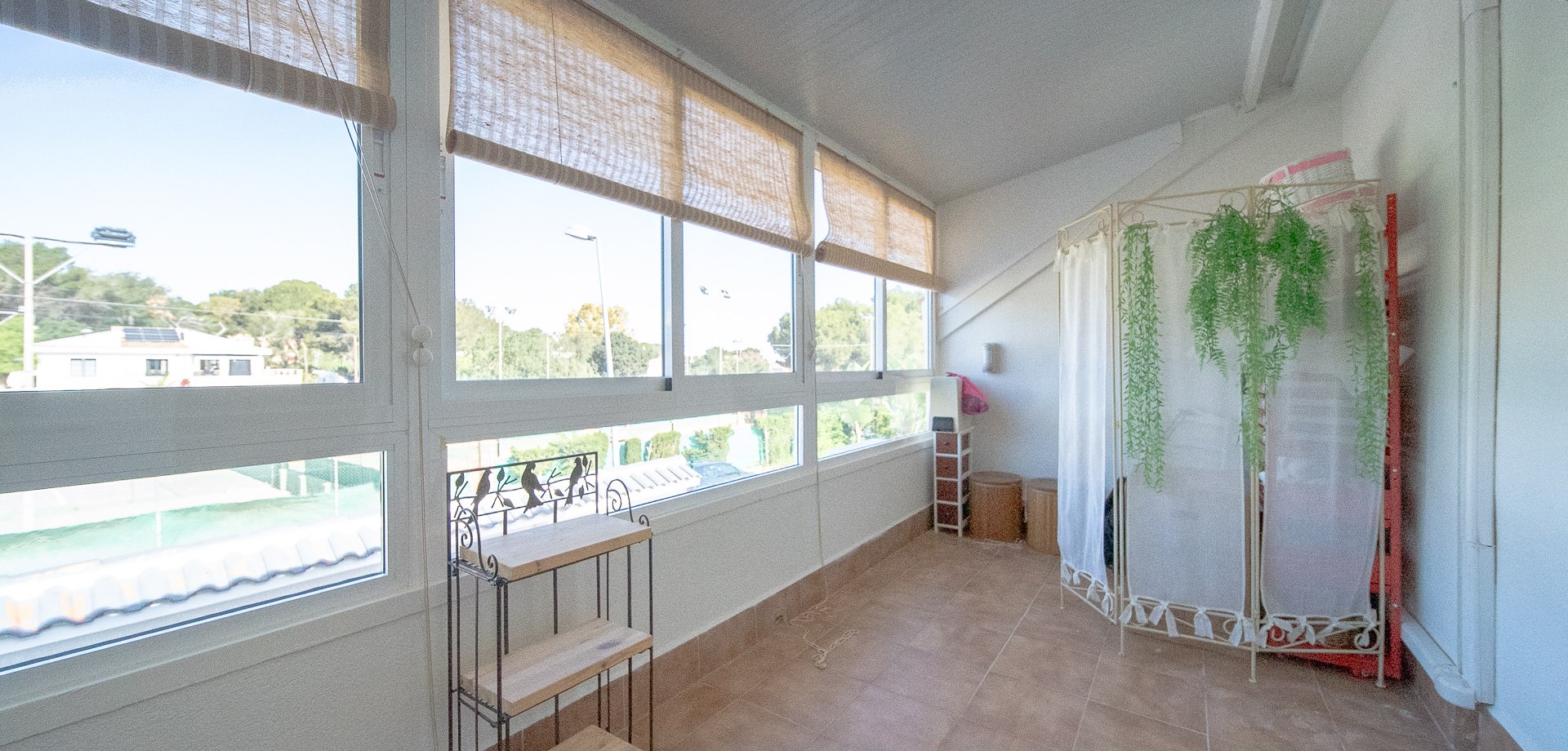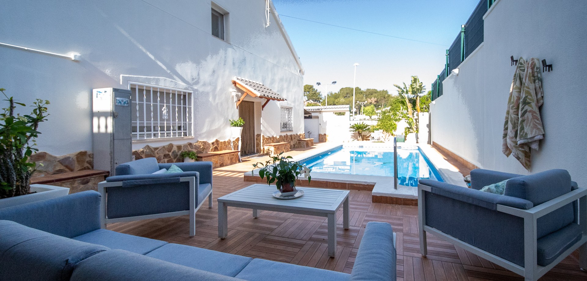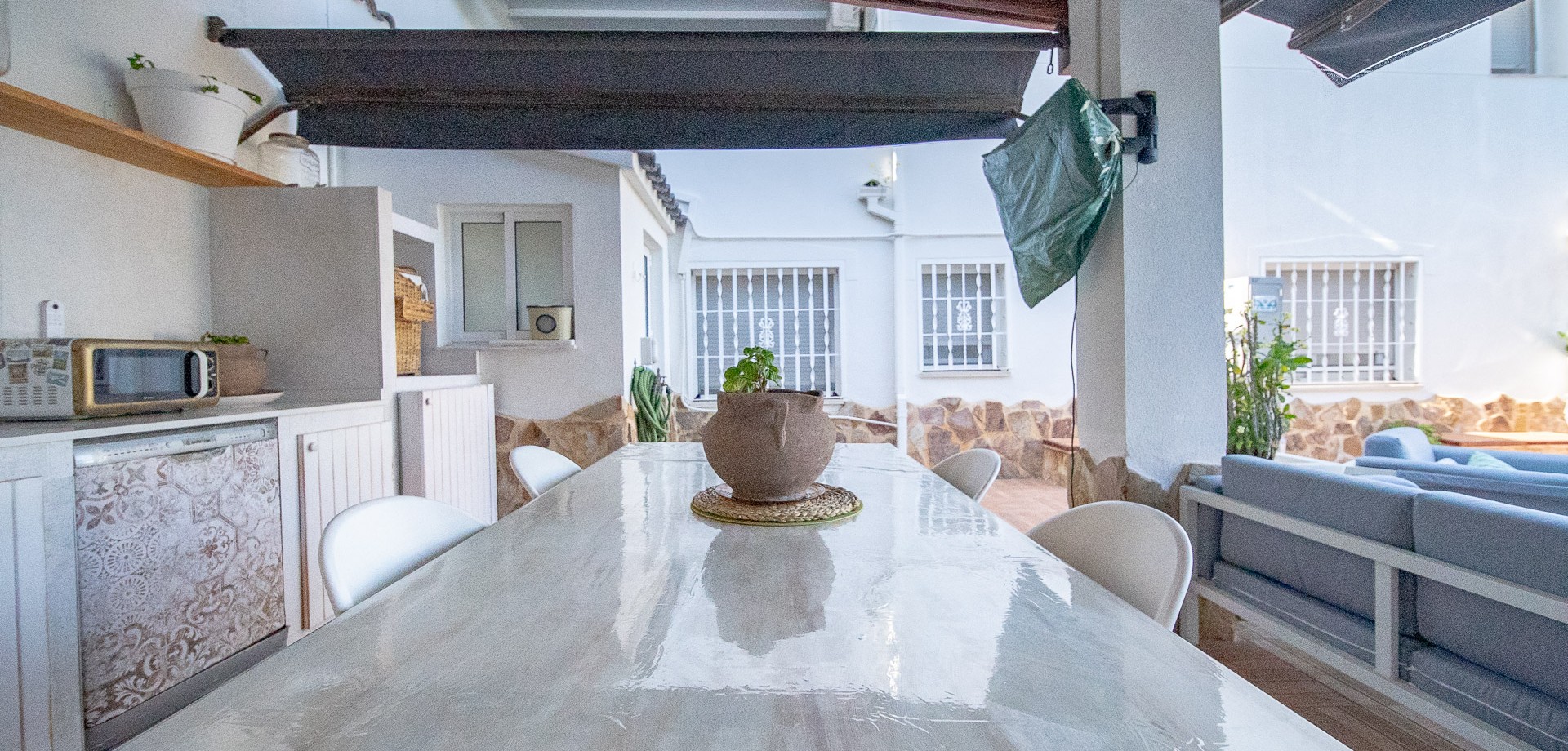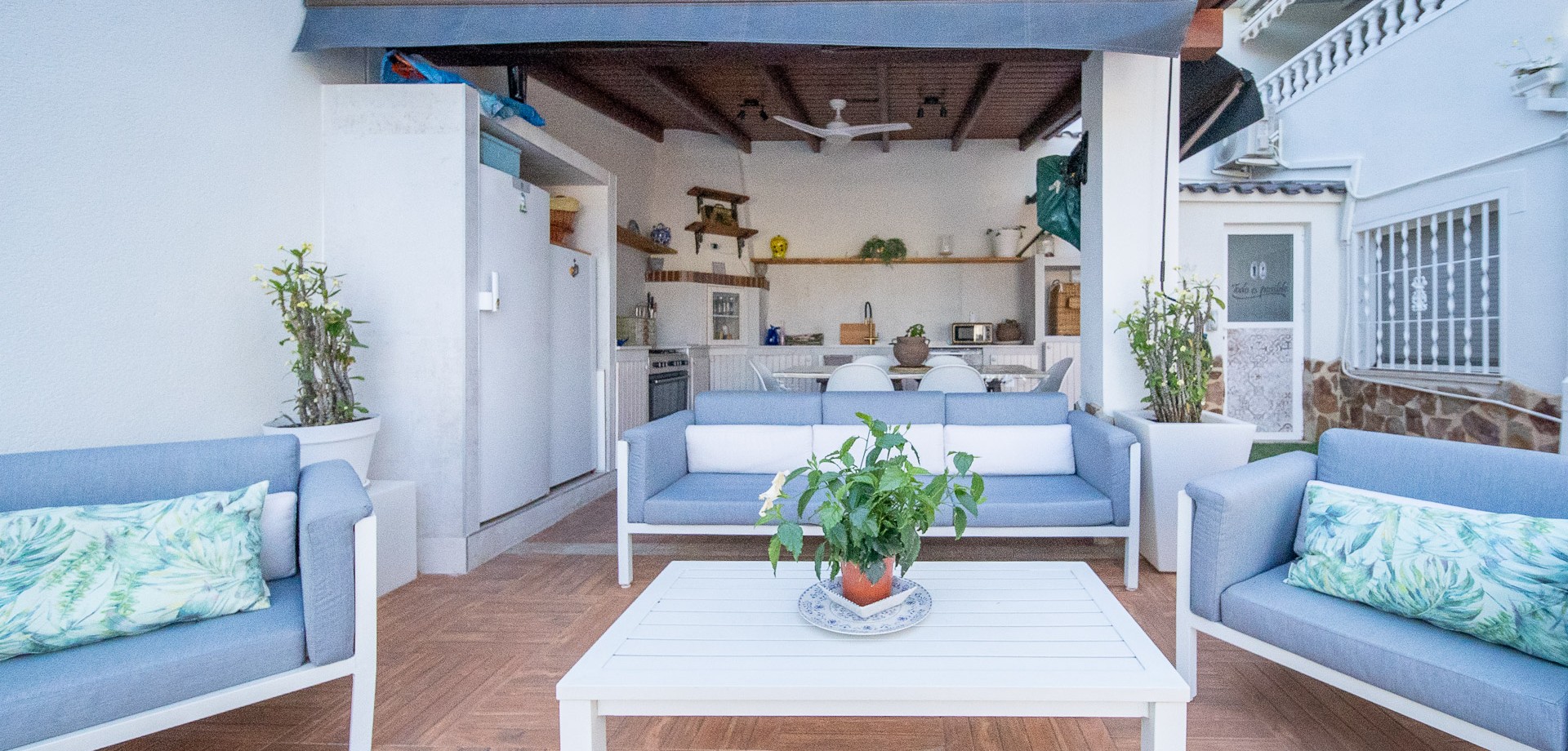 Semi-detached Villa with 4 Bedrooms in Los Balcones, Torrevieja. Semi-detached property located in one of Torrevieja’s most exclusive neighbourhoods: Los Balcones. The home offers 130 m² built over two floors. The ground floor includes a living-dining room, an independent kitchen, one bedroom and one bathroom. Upstairs, you'll find three bedrooms, one bathroom and a glazed terrace. It also features a 161 m² garden with a covered summer kitchen, a guest toilet, chill-out area and private pool. Prime location, right across from the Torrevieja Tennis Club, which offers tennis and padel courts, gym, swimming pool and a multi-purpose room. Within walking distance you’ll find bars, restaurants and shops. The Torrevieja University Hospital is less than five minutes away by car, and Zenia Boulevard shopping centre is just 10 minutes away. Key features: 4 bedrooms, 2 bathrooms and 1 guest toilet Independent kitchen Renovated Furnished Summer kitchen Chill-out area Private pool