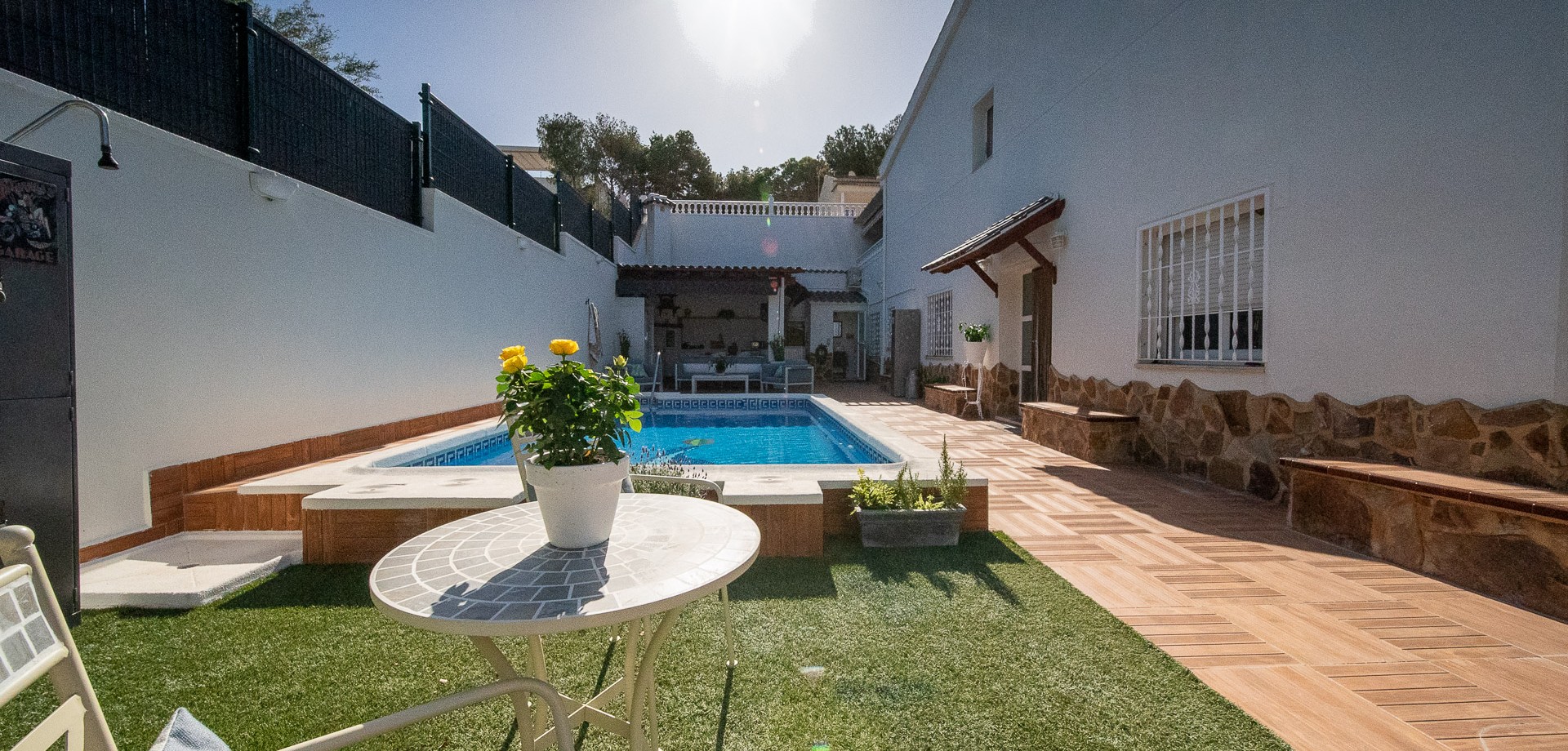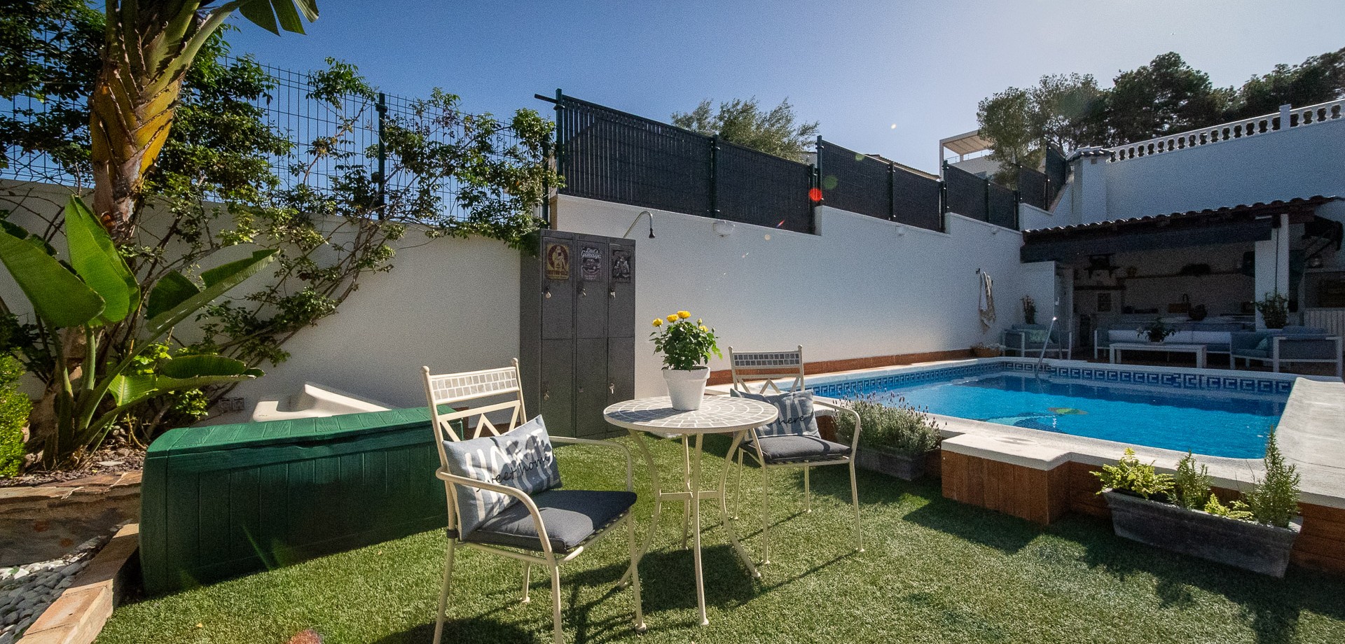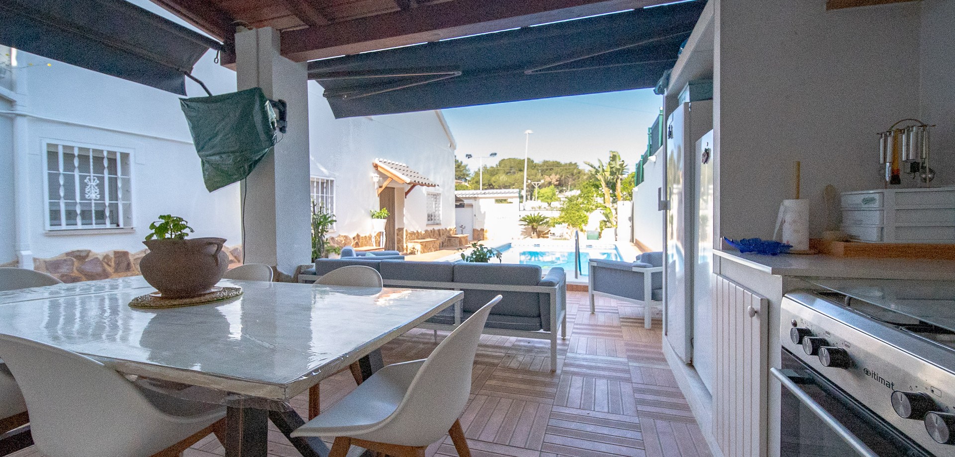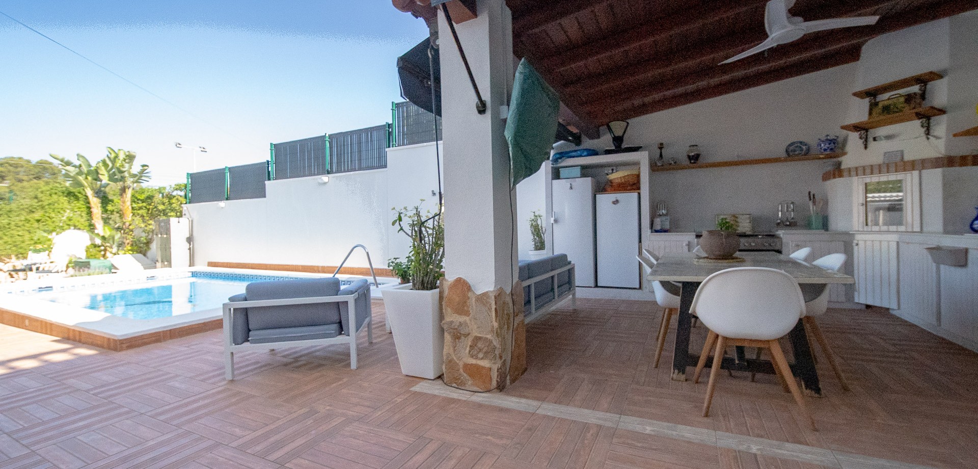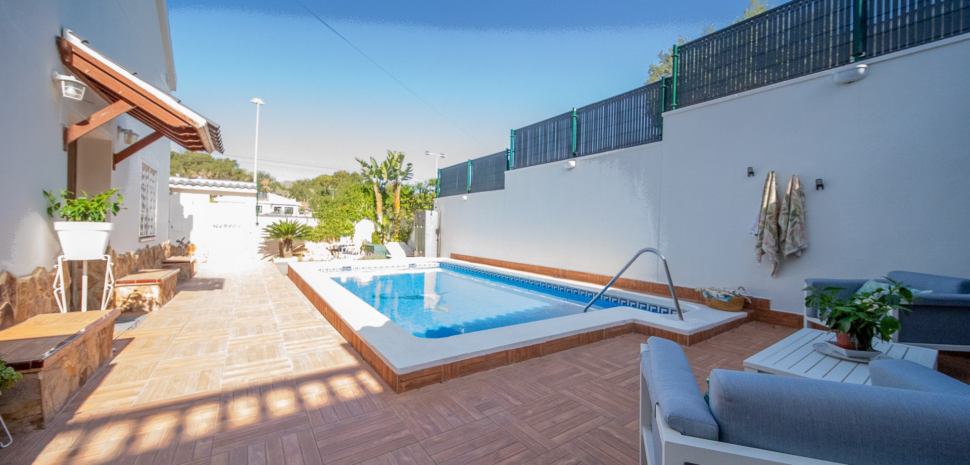 Semi-detached Villa with 4 Bedrooms in Los Balcones, Torrevieja. Semi-detached property located in one of Torrevieja’s most exclusive neighbourhoods: Los Balcones. The home offers 130 m² built over two floors. The ground floor includes a living-dining room, an independent kitchen, one bedroom and one bathroom. Upstairs, you'll find three bedrooms, one bathroom and a glazed terrace. It also features a 161 m² garden with a covered summer kitchen, a guest toilet, chill-out area and private pool. Prime location, right across from the Torrevieja Tennis Club, which offers tennis and padel courts, gym, swimming pool and a multi-purpose room. Within walking distance you’ll find bars, restaurants and shops. The Torrevieja University Hospital is less than five minutes away by car, and Zenia Boulevard shopping centre is just 10 minutes away. Key features: 4 bedrooms, 2 bathrooms and 1 guest toilet Independent kitchen Renovated Furnished Summer kitchen Chill-out area Private pool