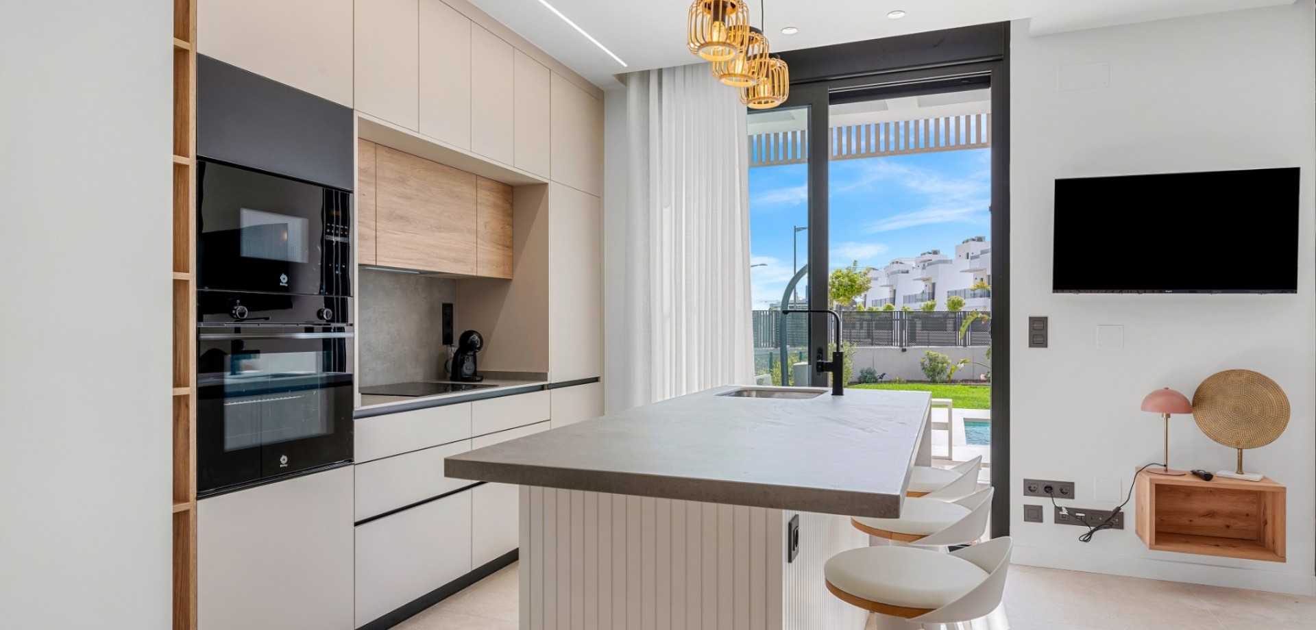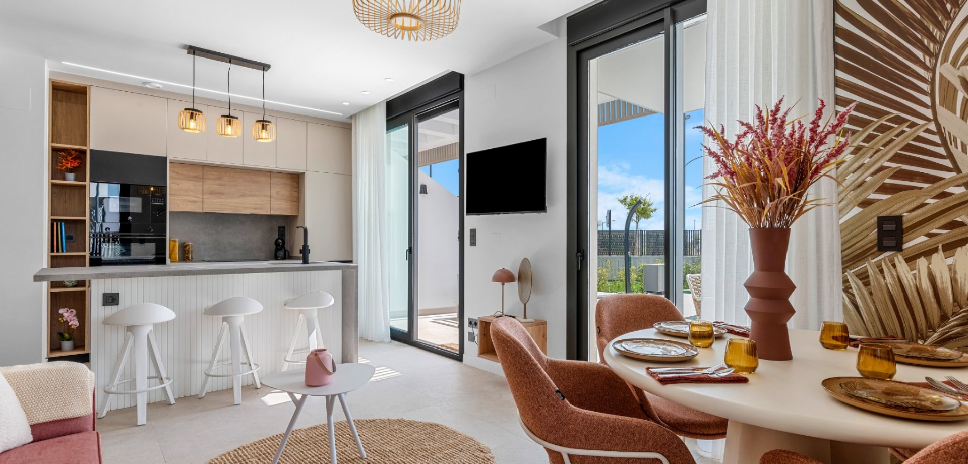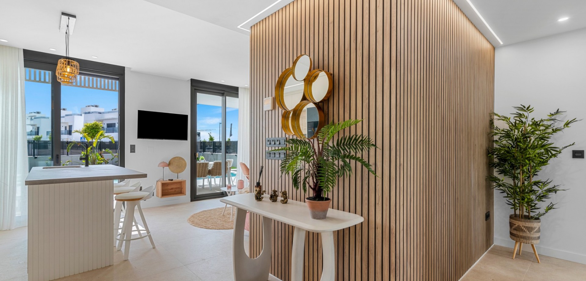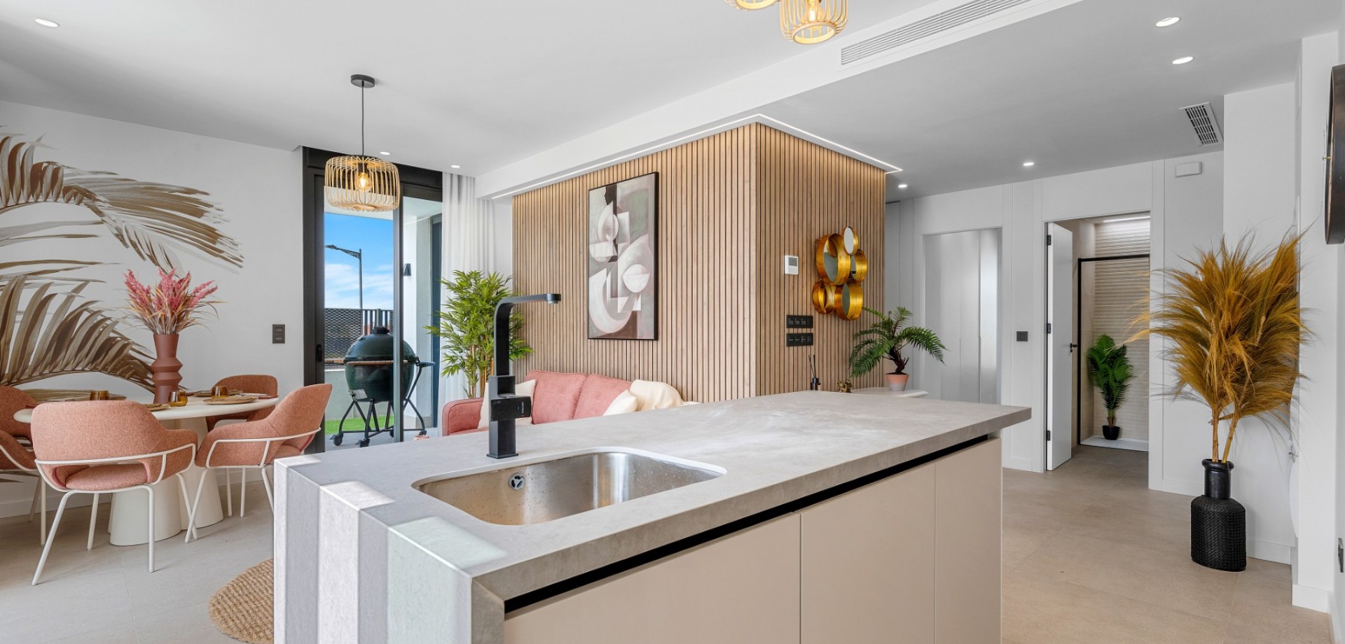 Are you looking for a unique property where comfort, luxury, and a true holiday atmosphere come together seamlessly? Then this exclusive ground-floor apartment is exactly what you’ve been searching for. This brand-new, never-before-inhabited residence is part of a prestigious and carefully designed development centered around a stunning turquoise lagoon – a rare and idyllic setting seldom found in Spain. This is a unique opportunity to own a turnkey, contemporary home in one of the most sought-after locations on the Costa Blanca. The layout has been thoughtfully designed to offer maximum comfort: three spacious bedrooms, two fully equipped bathrooms, a bright and open living area with a modern kitchen, and a large private terrace with your very own swimming pool. Everything is created to offer the ultimate living experience, perfectly blending indoor and outdoor life. Finished to the highest standards, the apartment features attention to detail and durable, low-maintenance materials, such as artificial grass on the terrace. The kitchen comes fully fitted with modern appliances, and the integrated air conditioning system ensures a pleasant indoor climate throughout the year. With its ground-floor location and direct access to the garden and pool area, you can enjoy your own private paradise any time of day. The location is simply unbeatable. The enchanting lagoon is just a short walk away, offering opportunities to swim, sunbathe, or relax in a truly serene setting. A variety of sports and leisure facilities are also nearby, making this property not only perfect for personal use but also highly appealing as a rental investment. Beautiful beaches, renowned golf courses, and vibrant coastal towns are all just a short drive away. Whether you're looking for a second home, a solid investment, or a permanent residence under the sun, this apartment truly offers it all. Be enchanted by this unique living experience in an exclusive and harmonious setting – a place where every day feels like a holiday.