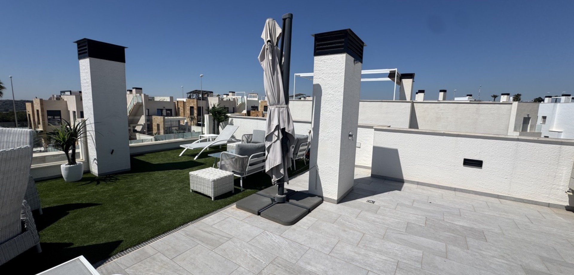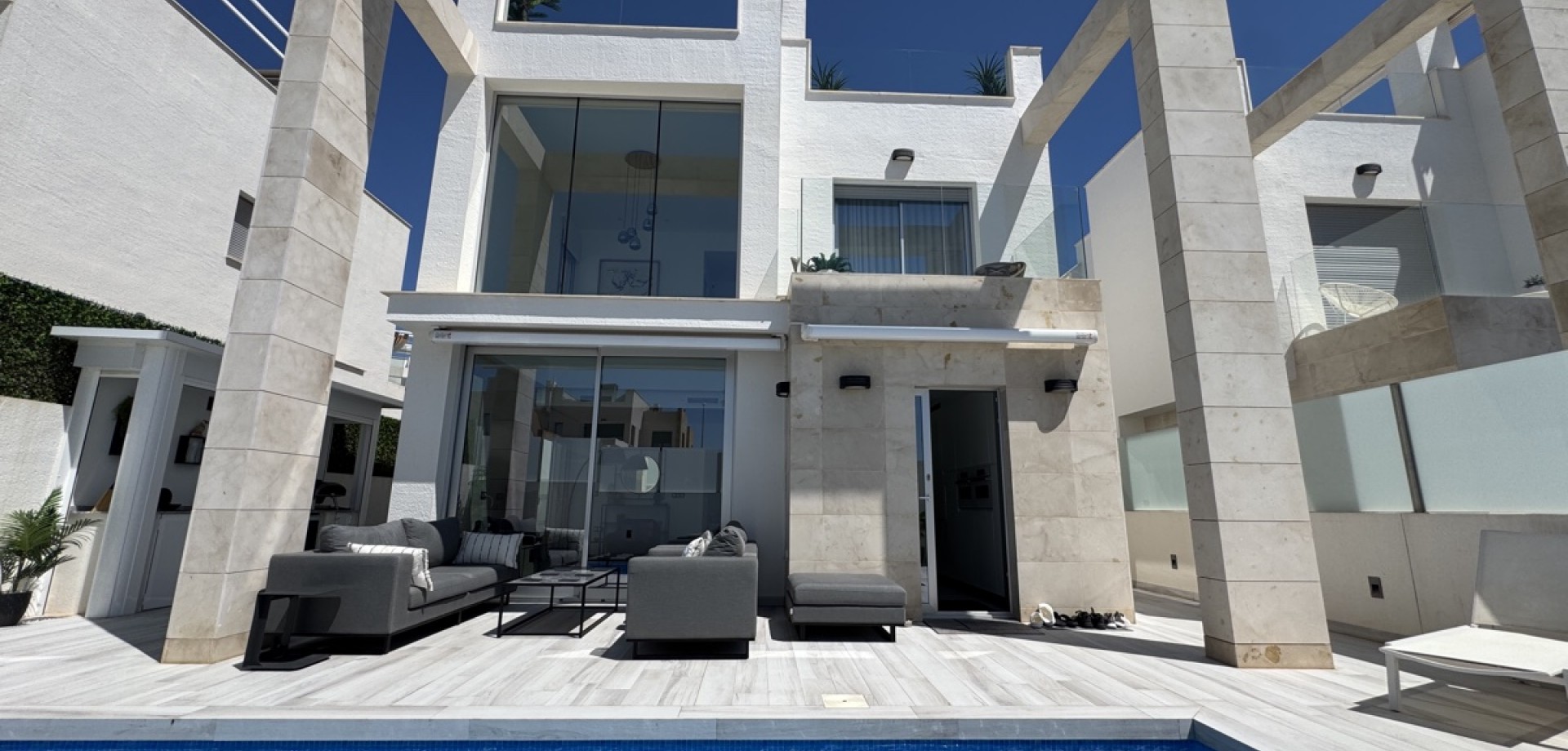 PRICE REDUCTION WAS €650,000 NOW €635,000 This stunning 4-bedroom modern villa is perfectly situated in the popular area of Lomas De Cabo Roig, offering a luxurious and private retreat for families and individuals alike. Key Features include - Spacious living room with sliding doors to the garden and pool area - Fully equipped modern kitchen with granite worktops and appliances - 4 comfortable bedrooms, including a master bedroom with en-suite bathroom - 4 modern bathrooms - Private swimming pool with sunbathing area and outdoor dining - Under build with second lounge (4th bedroom) and kitchen -Amazing Roof Top Terrace with distant sea views -Underfloor Heating in all bathrooms. This Private Oasis allows you to enjoy relaxing afternoons around the the private pool or soaking up the sun on the sun loungers. A custom built outdoor kitchen allows you to host barbecues and gatherings in the wonderful garden. Cabo Roig is a charming coastal town in the south of Spain, known for its beautiful beaches, golf courses, and vibrant community. This villa is ideally located for those who want to experience the best of coastal living. Perfect For - Families, couples, and individuals seeking a luxurious and private retreat in a beautiful coastal setting. Please note this property is being sold unfurnished. Build Area - 208m² Plot - 250m² Yearly Suma Tax - €512 Yearly Community Fee - €265 For more information or to arrange a viewing Contact us today!