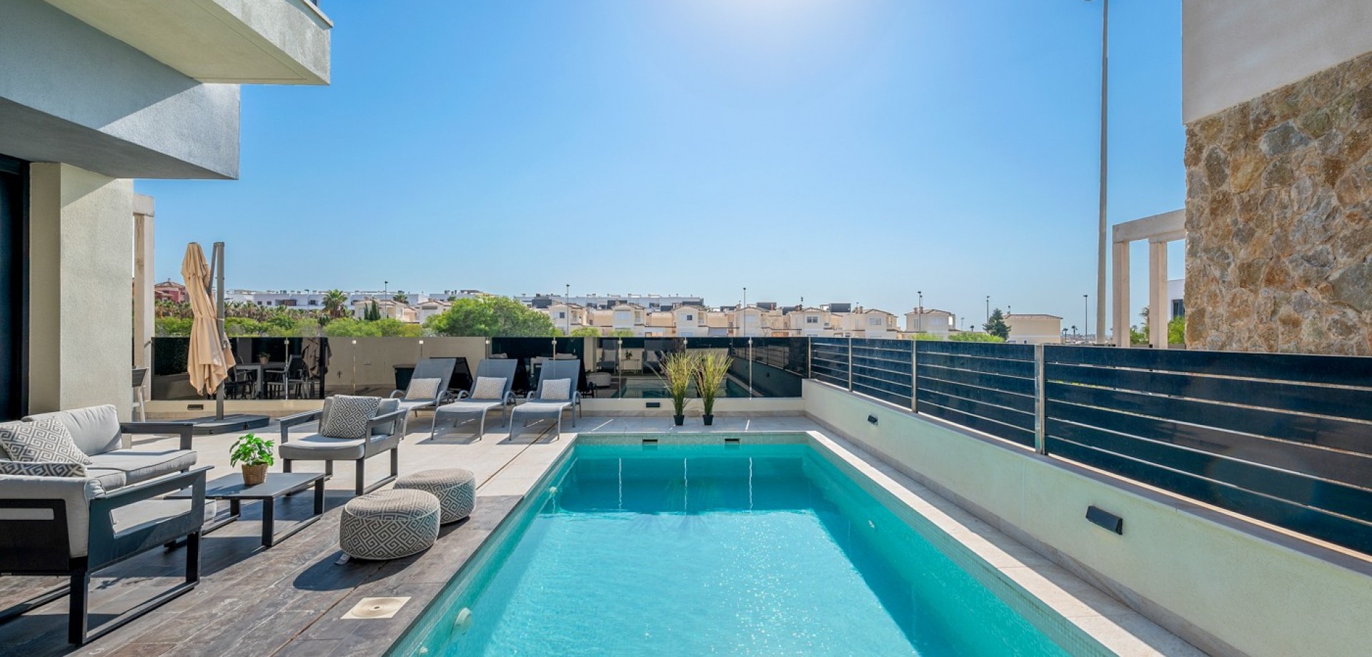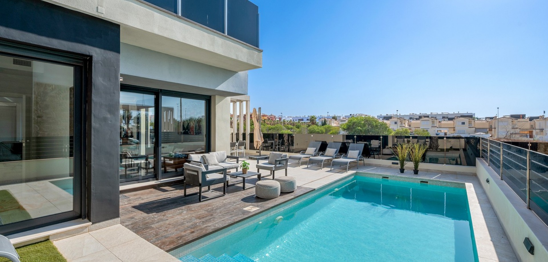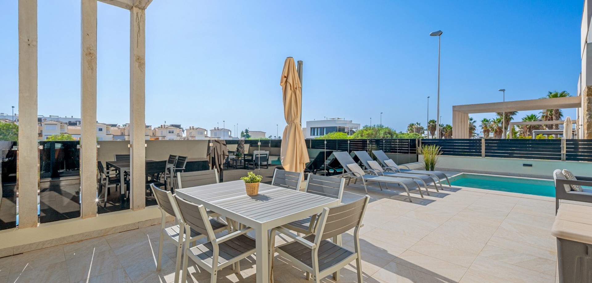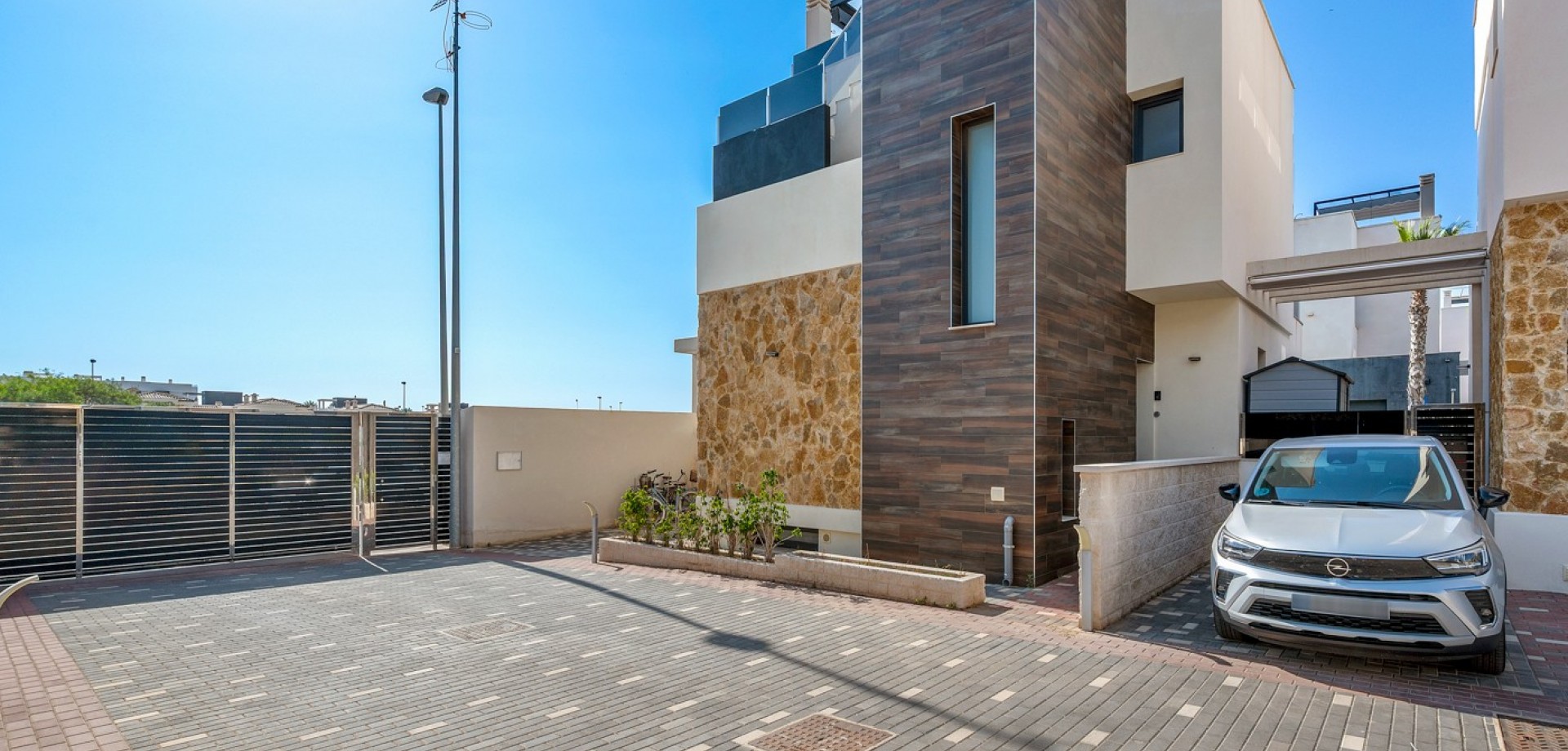 Exclusive 4-bedroom villa, ideally located in the highly sought-after area of Lomas de Cabo Roig - just moments from the beach, renowned golf courses, and a wide selection of local amenities.This stylish property boasts a sleek and spacious design, offering four generously proportioned bedrooms, each with its own en-suite bathroom and high ceilings. The villa also features a private swimming pool, a rooftop solarium with panoramic sea views, and a large basement that can be adapted for fitness, entertainment, or extra storage. Designed for open-plan living, it includes high-quality finishes, plenty of natural light, and generous outdoor space – making it an ideal choice for both permanent residence and luxury holiday living. Property Highlights ✔ 4 Bedrooms | 4 En-Suite Bathrooms ✔ Private Swimming Pool ✔ Rooftop Solarium with Sea Views ✔ Large Versatile Basement ✔ Walking Distance to Shops, Restaurants & Beaches Location – Lomas de Cabo Roig Lomas de Cabo Roig is one of the most desirable neighbourhoods on the Orihuela Costa, celebrated for its laid-back atmosphere, modern infrastructure, and close proximity to Blue Flag beaches. The area offers convenient access to international schools, prestigious golf courses, marinas, and a wide range of dining and shopping options – all within a short distance. Whether you're searching for a stylish coastal residence or a sound investment property with strong rental potential, this villa delivers the perfect combination of comfort, location, and refined living. Get in touch today to arrange a private viewing or receive more information about this exclusive opportunity.