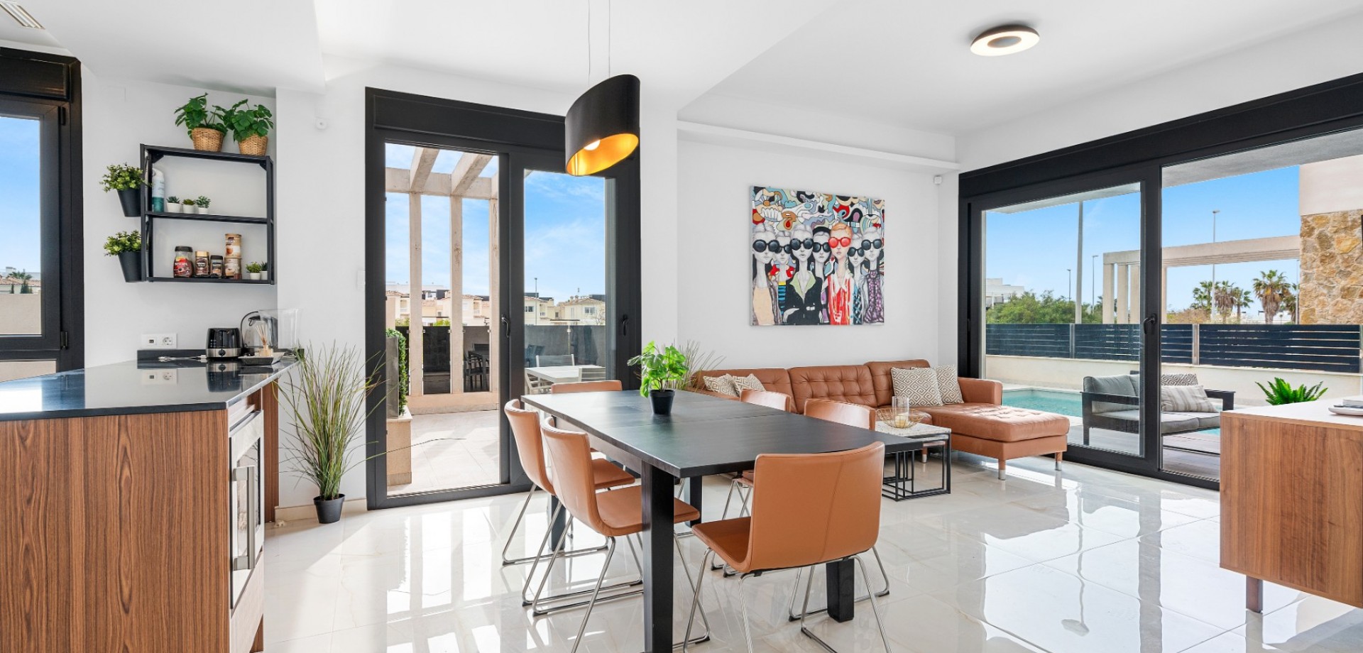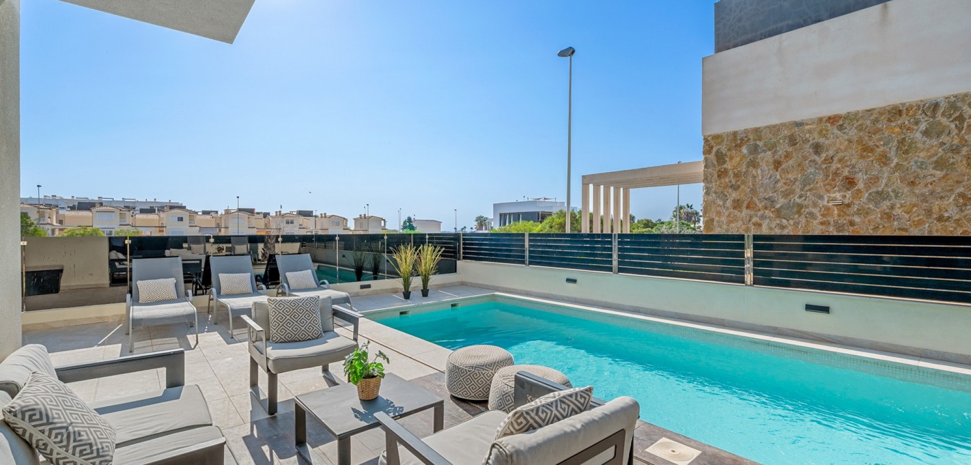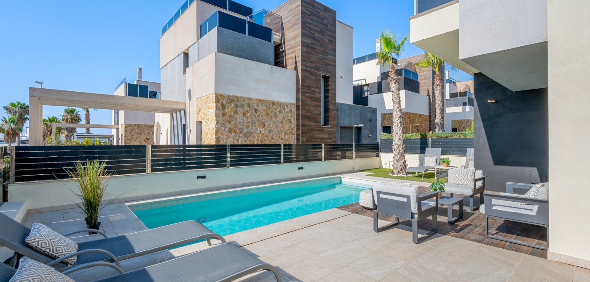 Exclusive 4-bedroom villa, ideally located in the highly sought-after area of Lomas de Cabo Roig - just moments from the beach, renowned golf courses, and a wide selection of local amenities.This stylish property boasts a sleek and spacious design, offering four generously proportioned bedrooms, each with its own en-suite bathroom and high ceilings. The villa also features a private swimming pool, a rooftop solarium with panoramic sea views, and a large basement that can be adapted for fitness, entertainment, or extra storage. Designed for open-plan living, it includes high-quality finishes, plenty of natural light, and generous outdoor space – making it an ideal choice for both permanent residence and luxury holiday living. Property Highlights ✔ 4 Bedrooms | 4 En-Suite Bathrooms ✔ Private Swimming Pool ✔ Rooftop Solarium with Sea Views ✔ Large Versatile Basement ✔ Walking Distance to Shops, Restaurants & Beaches Location – Lomas de Cabo Roig Lomas de Cabo Roig is one of the most desirable neighbourhoods on the Orihuela Costa, celebrated for its laid-back atmosphere, modern infrastructure, and close proximity to Blue Flag beaches. The area offers convenient access to international schools, prestigious golf courses, marinas, and a wide range of dining and shopping options – all within a short distance. Whether you're searching for a stylish coastal residence or a sound investment property with strong rental potential, this villa delivers the perfect combination of comfort, location, and refined living. Get in touch today to arrange a private viewing or receive more information about this exclusive opportunity.