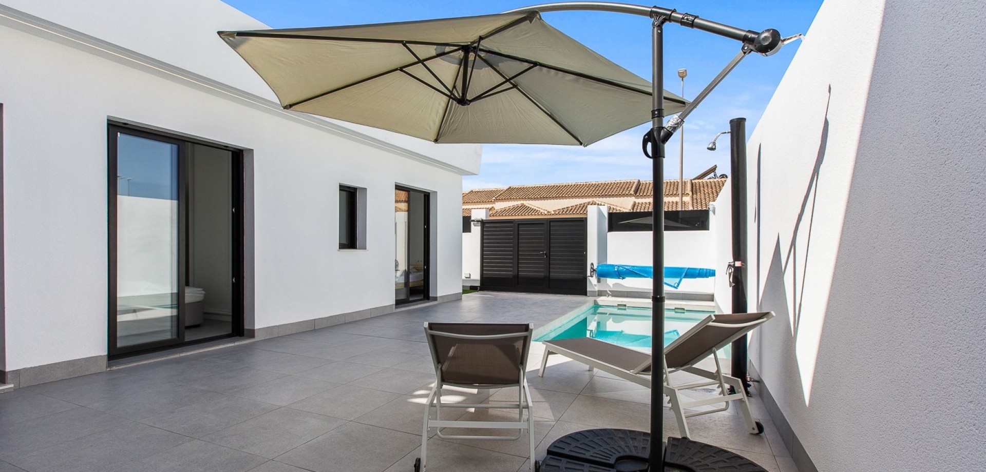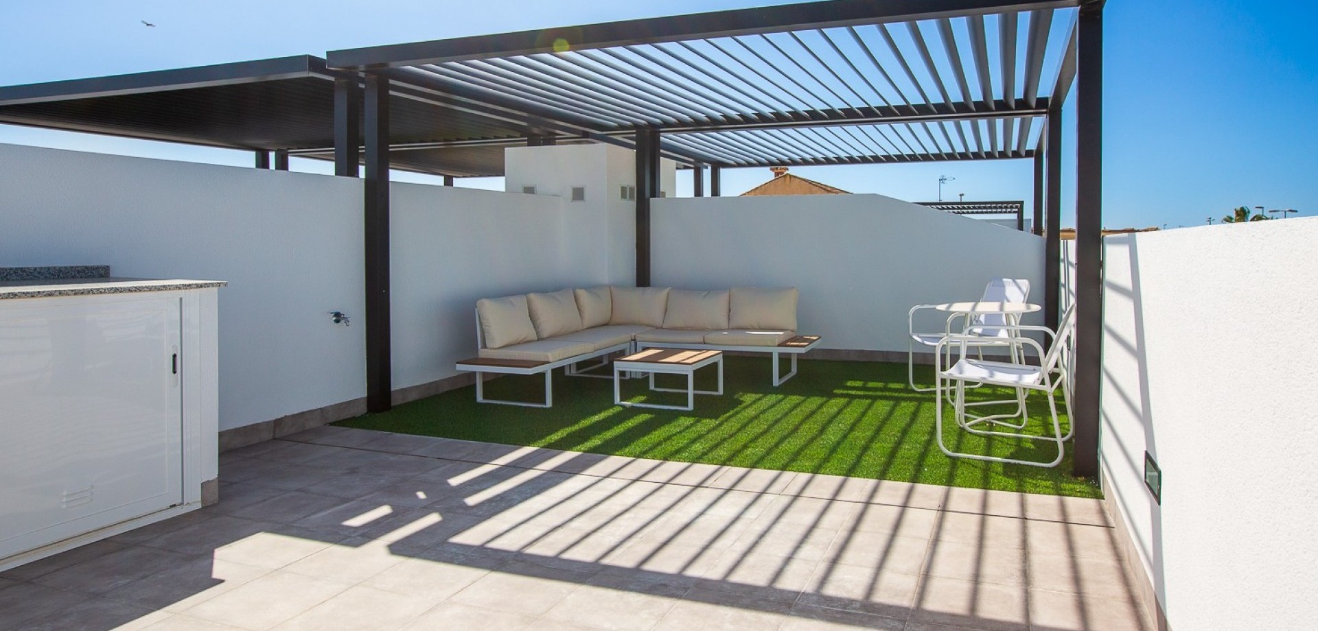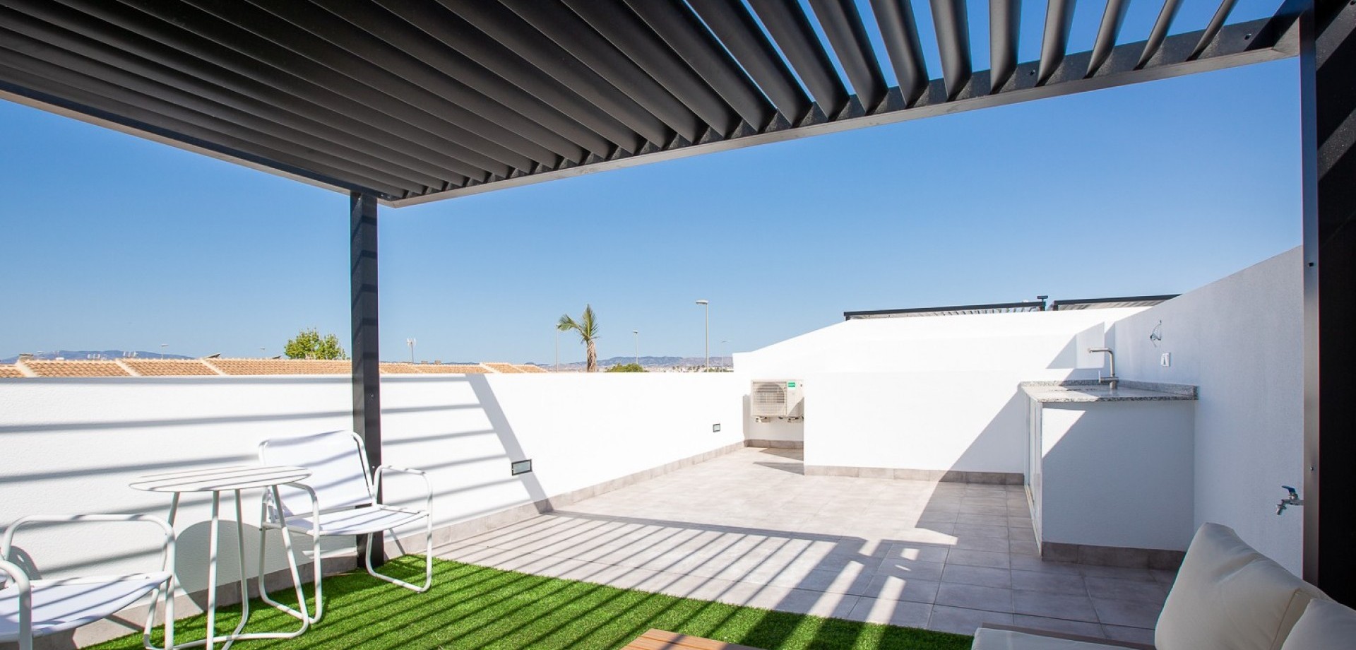 This stunning newly built villa (2024) is a perfect blend of modern architecture and Mediterranean lifestyle. Located in the peaceful town of Roldán, in the heart of Murcia, this property offers a high standard of living for those seeking comfort, privacy, and convenience in a warm, sunny climate. With 3 bedrooms and 2 stylish bathrooms, the villa provides a light-filled and functional interior layout. The open-plan living and dining area seamlessly connects to a sleek, fully fitted kitchen—ideal for family life or entertaining guests. Quality materials and finishes are evident throughout the home, from ceramic flooring to double-glazed windows and energy-efficient systems. Step outside into your private garden, where a sparkling pool awaits—perfect for refreshing dips on hot summer days. Upstairs, the highlight of the home is the expansive 39 m² rooftop solarium, complete with a pergola and a fully equipped outdoor kitchen, offering a spectacular setting for dining, relaxing, or enjoying the region’s 300+ days of sunshine per year. The property sits on a 155 m² private plot and includes gated off-street parking, making it as practical as it is beautiful. Key Features: * 3 Double Bedrooms with natural light and built-in wardrobes * 2 Fully Fitted Bathrooms with contemporary design * Private Pool with surrounding terrace area * Large Rooftop Solarium (39 m²) with pergola and outdoor kitchen * Private Driveway within the gated plot * Low-maintenance Garden with space for outdoor seating and sun loungers * New Build (2024) – Built with modern construction standards and energy-efficient materials * Air conditioning and double glazing throughout * Sold fully furnished About the Location – Roldán, Murcia: Roldán is a charming and secure town in the Murcia region of southeastern Spain, known for its laid-back atmosphere, sunny climate, and access to world-class golf and coastal attractions. The villa is ideally located just a few minutes from the town center, where you’ll find a variety of shops, restaurants, cafés, banks, and essential services. Nature lovers and beachgoers will appreciate the short 20-minute drive to the beautiful beaches of the Costa Cálida, while golfers will enjoy easy access to several renowned golf resorts, including La Torre Golf Resort and Terraza de la Torre. The property also benefits from excellent transport links: * Murcia International Airport: only 15 minutes away * Access to the AP-7 and RM-19 motorways for easy travel to Cartagena, Murcia City, and Alicante * Close to shopping centers, healthcare services, and international schools Whether you’re seeking a permanent residence, holiday home, or a high-potential rental investment, this villa ticks all the boxes.