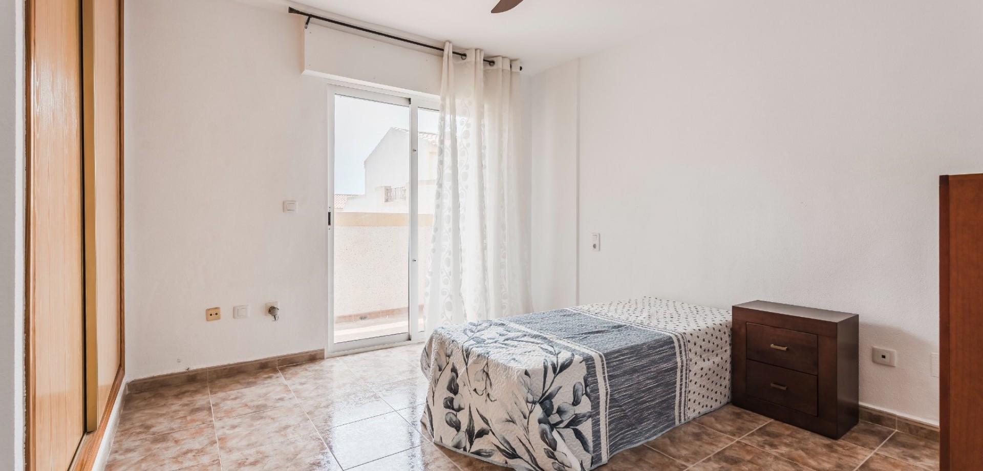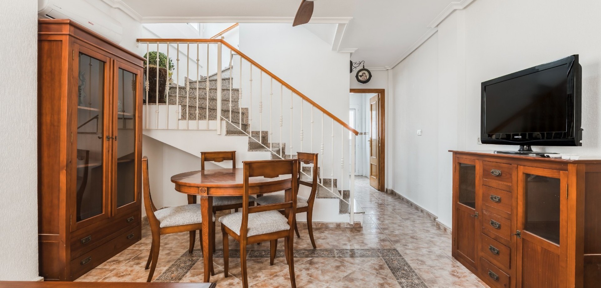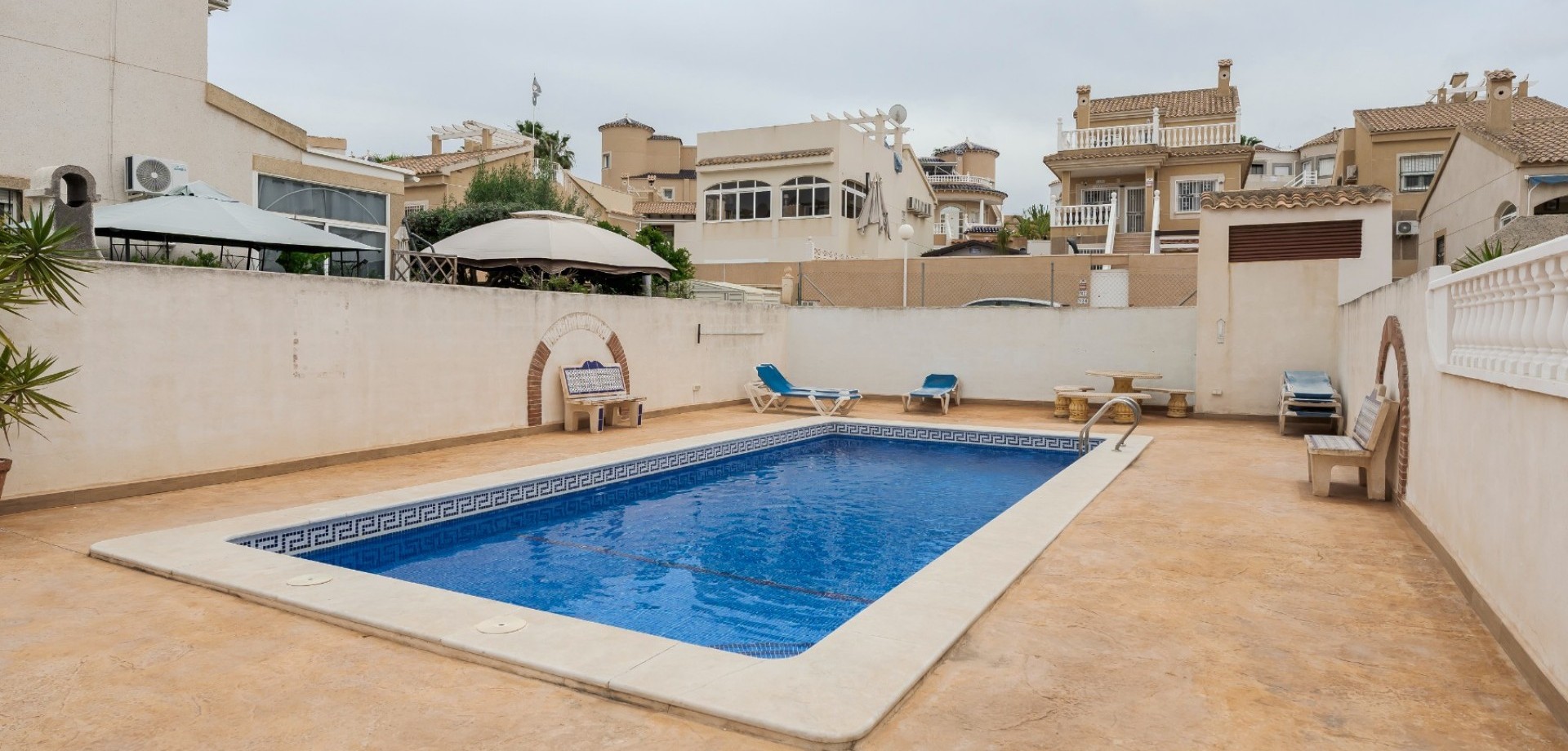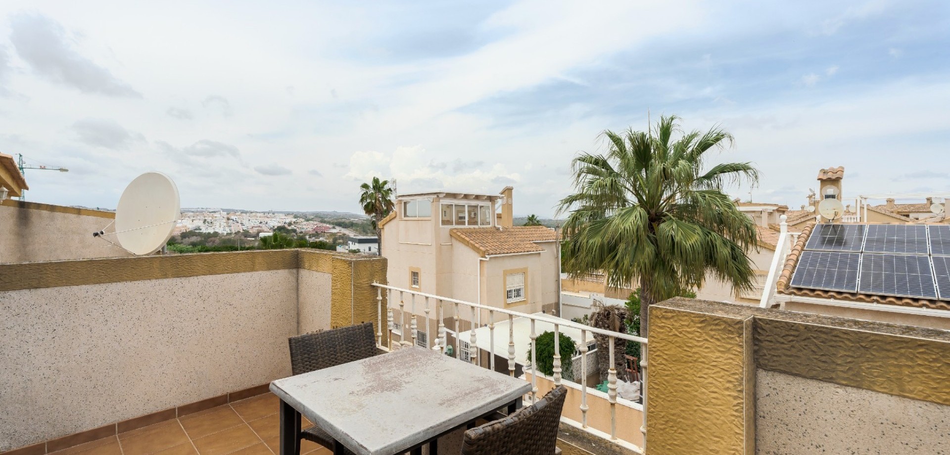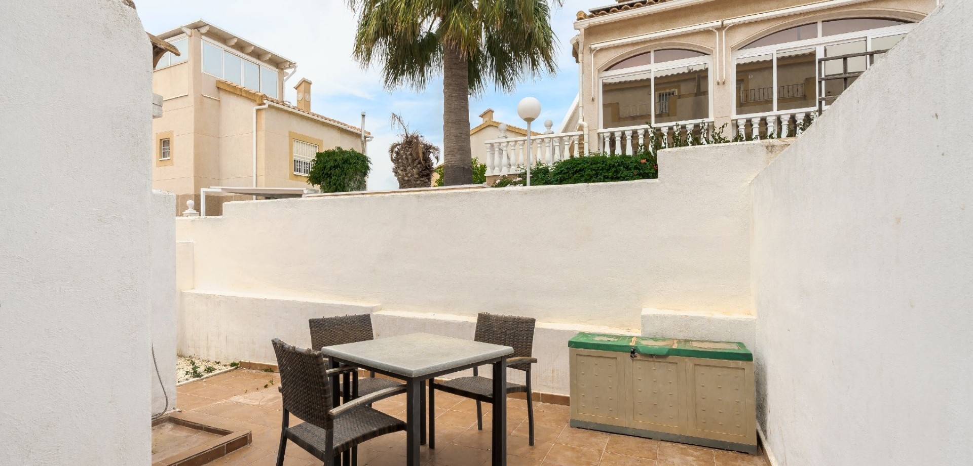 Located in the sought-after area of Los Altos on the Costa Blanca South, this beautifully presented south-facing 3-bedroom, 3-bathroom semidetached villa offers the perfect blend of comfort, space, and convenience. Situated within a secure gated urbanisation, the property is just a 5-minute walk to local supermarkets, the JYSK furniture store, and a range of café bars. The renowned La Zenia Boulevard shopping centre is only a short drive away, with several stunning beaches and top golf courses reachable in around 10 minutes. Set across three levels, this bright and spacious home is ideal for permanent living or as a holiday retreat. The ground floor features a welcoming open-plan living and dining area with air conditioning and a charming feature fireplace. The separate fitted kitchen includes modern appliances and leads to a useful utility area. A guest cloakroom completes this level. On the first floor, you’ll find two generously sized double bedrooms with built-in wardrobes and air conditioning, one of which opens onto a private terrace with lovely views. A full family bathroom with a bath and shower serves this floor. The top level hosts a spacious third double bedroom with an en-suite shower room and two private terraces—perfect for soaking up the sun or enjoying peaceful evenings. Outside, the home boasts a low-maintenance tiled garden, offering multiple terraced areas for relaxing, dining, or entertaining. Residents also benefit from access to a well-maintained communal pool, ideal for cooling off on warm days. This home is perfectly positioned to enjoy all the benefits of Costa Blanca living, with amenities, leisure, and lifestyle all on your doorstep.