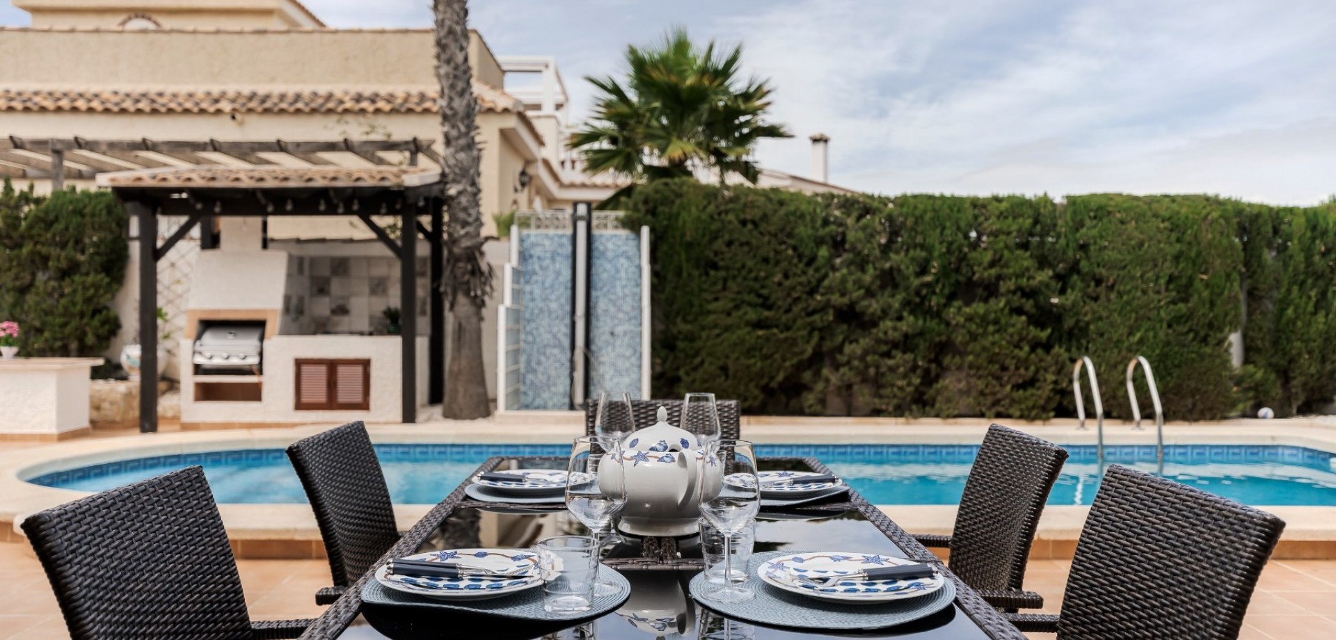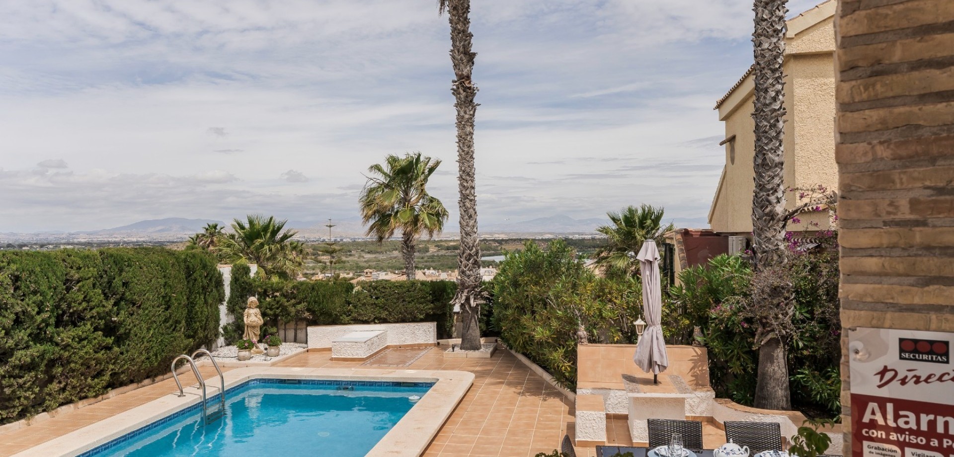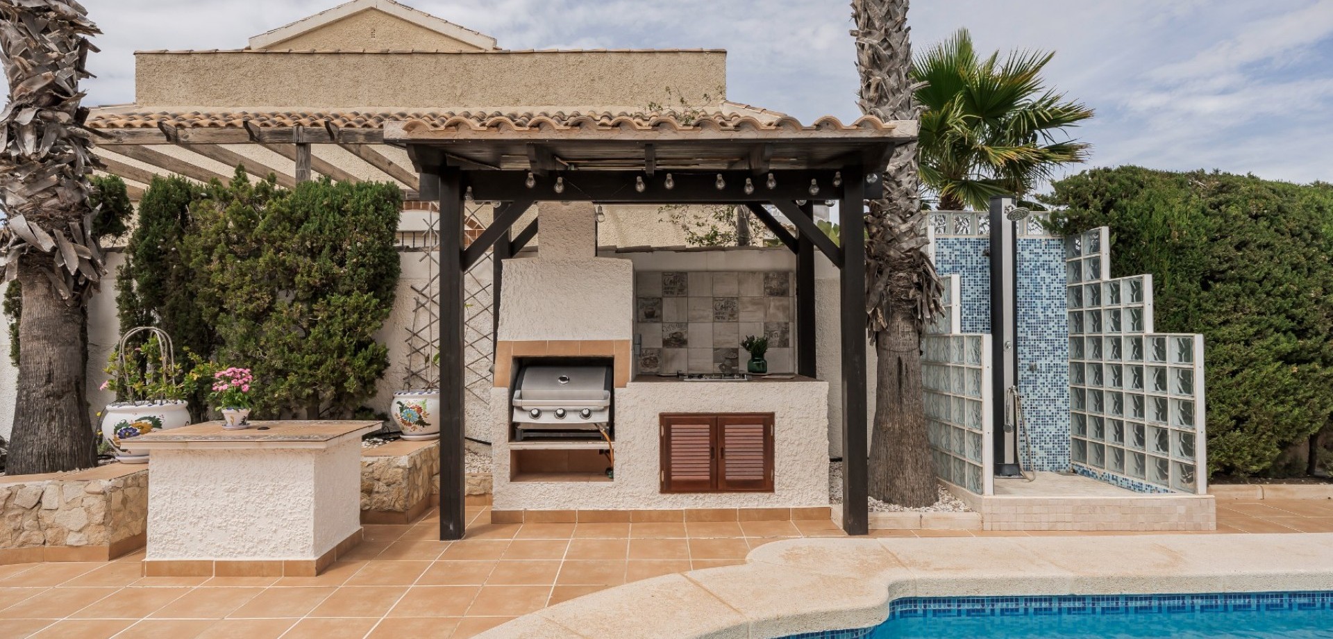Costa Blanca Eiendom presents this spacious detached villa situated on a desirable corner plot in the heart of Gran Alacant, just a short walk from the sea. Combining privacy, comfort, and generous outdoor space, it’s ideal for families or anyone seeking a relaxed Mediterranean lifestyle close to all amenities. Upon entering the plot, you're welcomed by a wide open area, a generous private swimming pool, and a built-in outdoor kitchen with gas barbecue. You can walk all the way around the villa, with every corner thoughtfully arranged as a seating area, dining space, or practical storage. The outdoor space features plenty of greenery, natural palm trees, and carefully designed lighting. Key Features Entrance Area: The main entrance leads up a few steps to a bright glazed terrace (wintergarden), which serves as a cozy winter lounge or a sun-filled entryway year-round. Stylish Living Room: This classically furnished and well-maintained living room is spacious and filled with natural light. It features a built-in wood-burning fireplace and connects openly with the dining area and kitchen. The furniture is in immaculate condition, showing no signs of wear, and the atmosphere is both elegant and welcoming. Kitchen: Fully equipped with quality appliances, including a washing machine, dishwasher, fridge, oven, and microwave. The kitchen offers plenty of counter space, along with ample cabinetry for storage, and has direct access to the outdoor area. 3 Spacious Bedrooms and 3 Private Bathrooms Bedroom 1 (Ground Floor – Master): Features a double bed, a ceiling fan, and a walk-through dressing area with built-in wardrobes, leading to a private en-suite bathroom with a bathtub. Bedroom 2 (Ground Floor): Features twin bed setup, full wall of wardrobes, and en-suite bathroom with a shower. Bedroom 3 (Upper Floor – Guest Suite): Has a private entrance and features a double bed with access to an en-suite bathroom with a bathtub. From the room, you can step out onto a large rounded terrace with views of the mountains and Clot de Galvany. Parking & Storage: The villa includes a spacious private garage with a driveway, offering secure parking and additional room for storage. Outside, you’ll also find several enclosed storage units—ideal for keeping bicycles, garden tools, or outdoor furniture neatly organized. Community Features: In addition to the private pool, residents also have access to a large communal swimming pool, available exclusively to homeowners in the area. This shared space is surrounded by grass, palm trees, and natural vegetation—offering a peaceful and refreshing setting to enjoy with neighbors or guests. Other Features: Central heating throughout the villa Two gated entrances to the property Sold furnished and in move-in condition Location Highlights: Prime location, just a 3-minute drive to the sandy Carabassi Beach, a Blue Flag beach known for its crystal-clear waters, natural dunes, and wide coastline Only 8 minutes by car to Alicante Airport Close to supermarkets, restaurants, cafés, and essential daily services About Gran Alacant: Incredible Surroundings: Gran Alacant offers a stunning natural setting with Blue Flag beaches like Carabassi, known for its clean waters, golden sand, and protected dunes. A scenic seaside promenade stretches for around 5 km, perfect for walking, jogging, or enjoying the views—just minutes from the Mediterranean Sea. Convenient Shopping and Entertainment: The area has everything you need: supermarkets, restaurants, cafés, and a local market. Alicante city is only 20 minutes away by car, and Santa Pola is even closer, offering more shops, services, and dining options. A Vibrant and Relaxing Coastal Community: This international community is well-connected, peaceful, and surrounded by nature. From nearby Santa Pola, you can also take a boat to the island of Tabarca—a great spot for day trips and snorkeling. Don’t miss your chance to view this wonderful home!