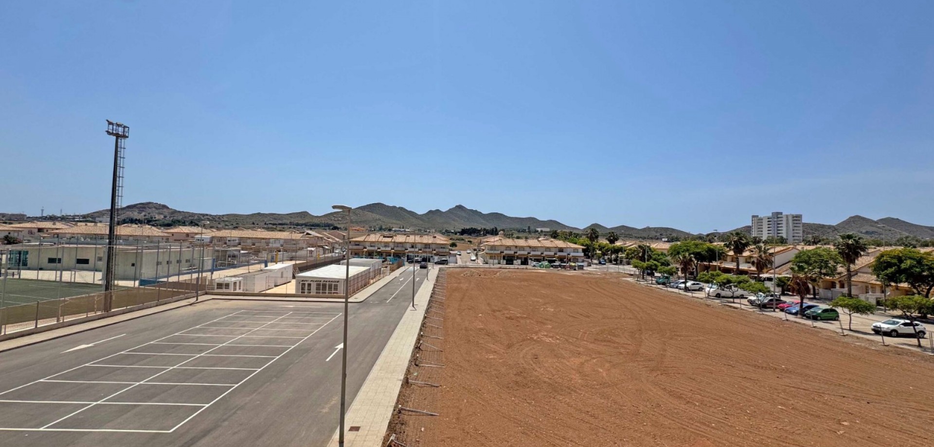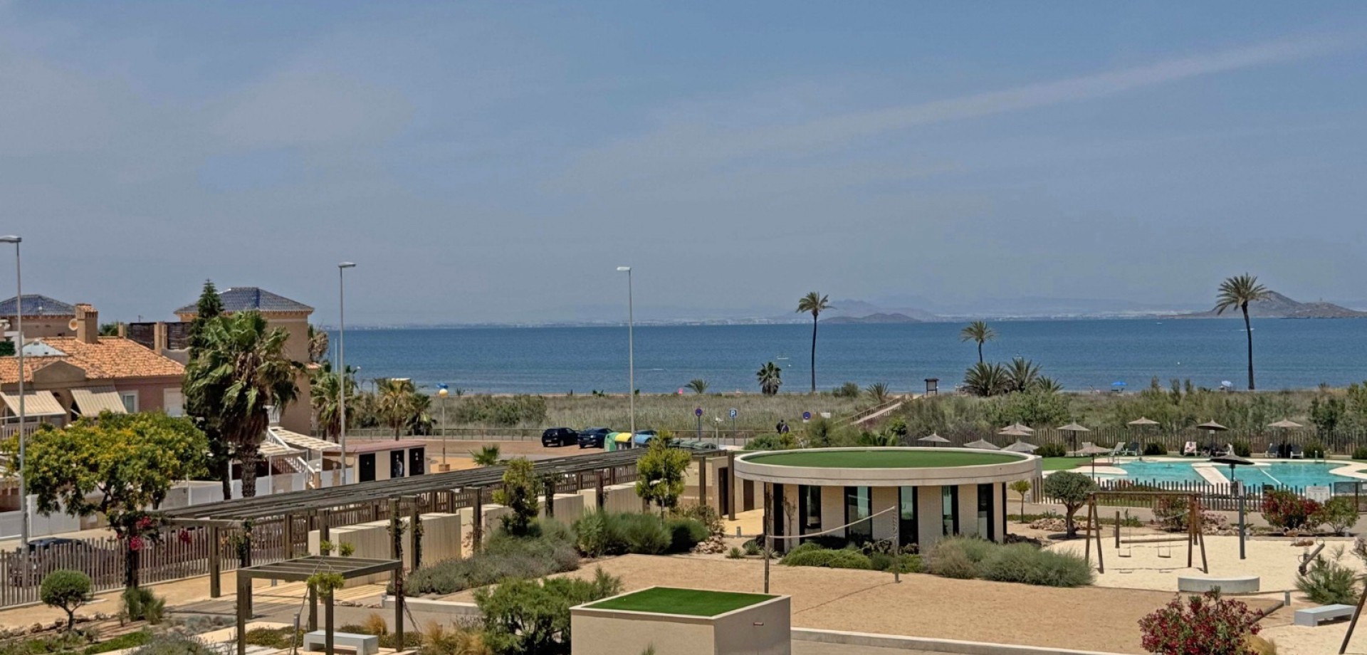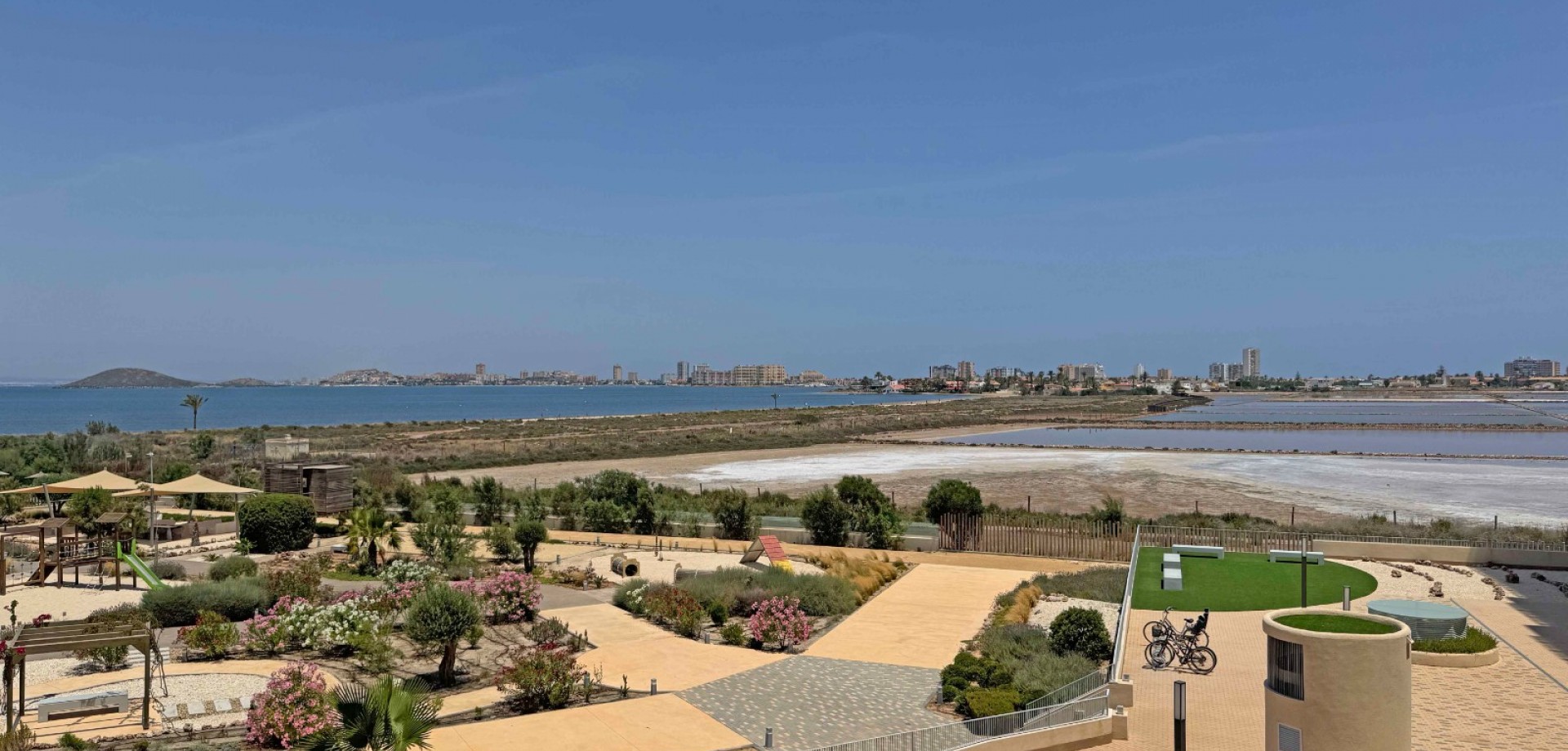 Uninterrupted panoramic views of the Mar Menor, salt lakes with flamingos, green hills, and a peaceful palm-lined neighborhood