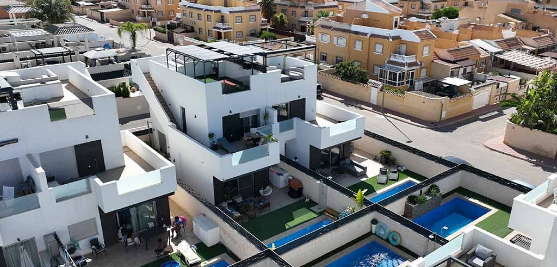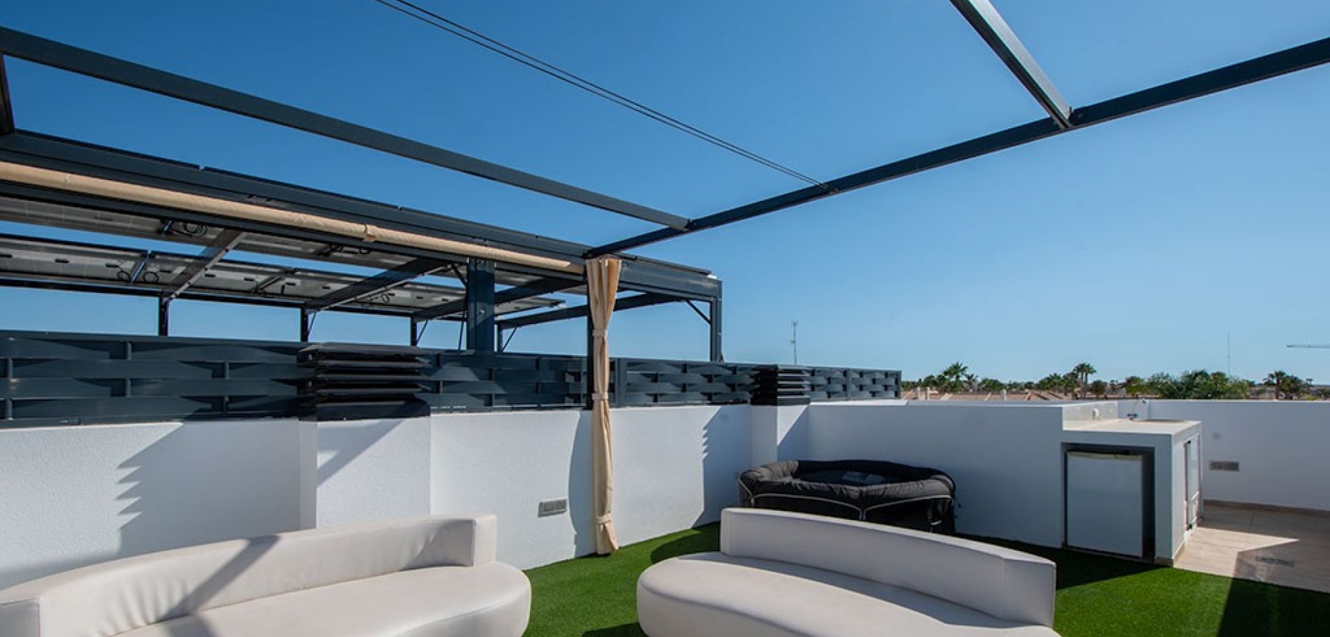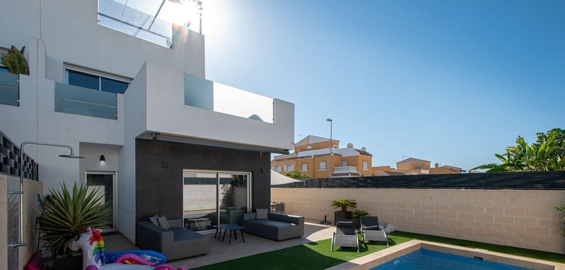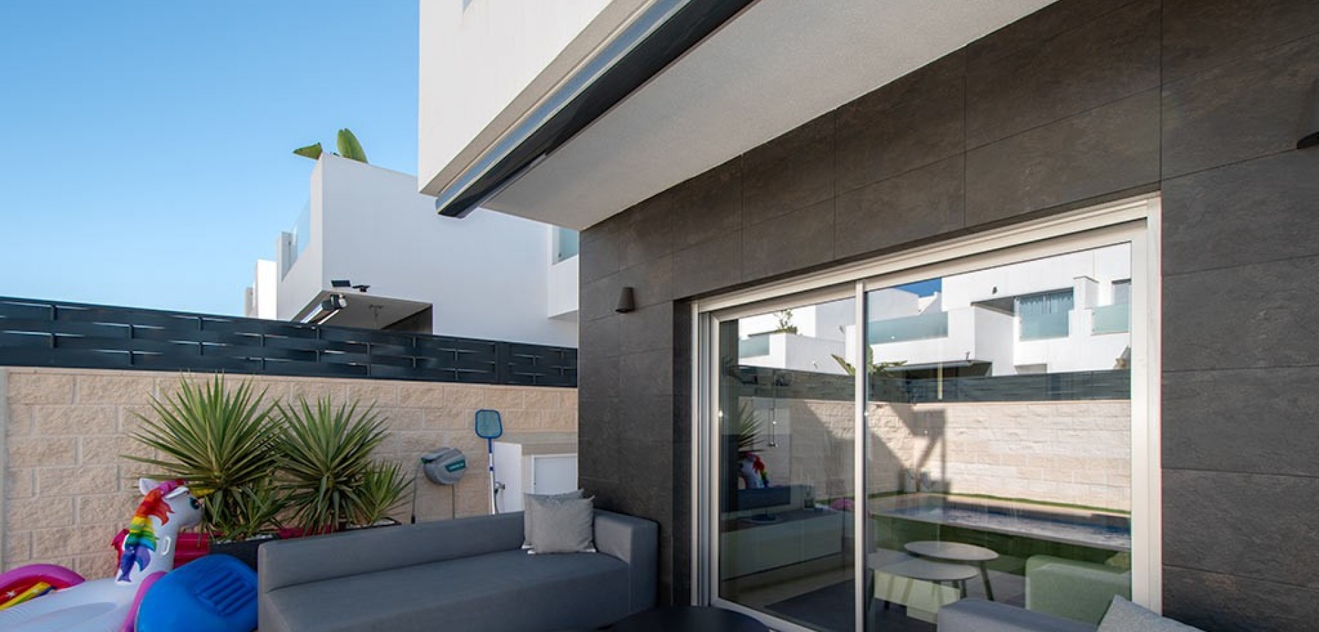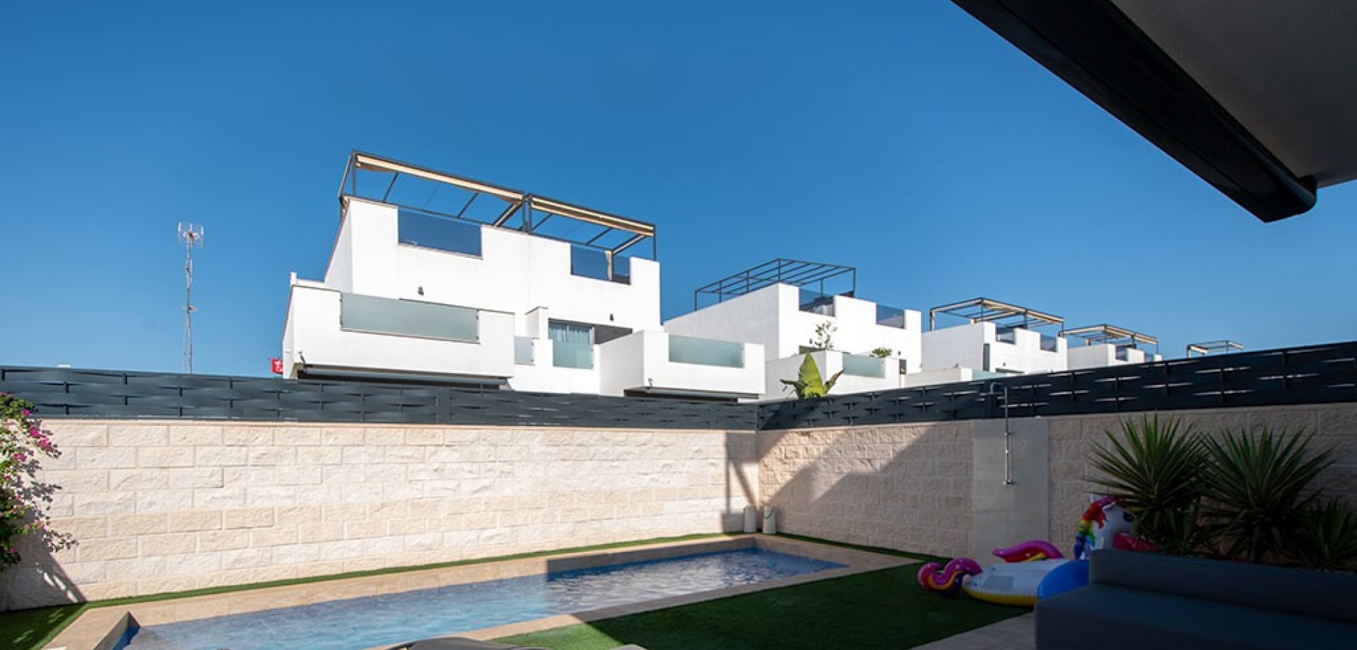 Ready-to-move-in townhouse in the popular residential area of Ciudad Quesada in Rojales. Only 10 minutes’ drive from the spectacular beaches of Guardamar and Torrevieja, and close to the beautiful Natural Park of the Lagoons of La Mata. All the daily necessities are a short drive from the home, like supermarkets, banks, pharmacies, bars, and restaurants. The Alicante airport is only 45 minutes away by car. Beautifully presented home distributed on two floors plus solarium, with 3 bedrooms, 2 bathrooms (one en-suite), and a guest toilet. The spacious and bright living area combines the kitchen, dining area and lounge in a single space, that opens onto a Southwest facing terrace with a private pool, and an outdoor dining area. The master en-suite bedroom is on the ground floor, with the remaining 2 bedrooms and shared bathroom are on the first floor. The spacious terrace on the first floor leads to the solarium, which is the perfect place to enjoy the Costa Blanca climate, with a pergola covered lounge area with artificial grass, and a summer kitchen. The home includes fully installed ducted air conditioning (hot/cold), white goods, private pool, and parking on the premises.