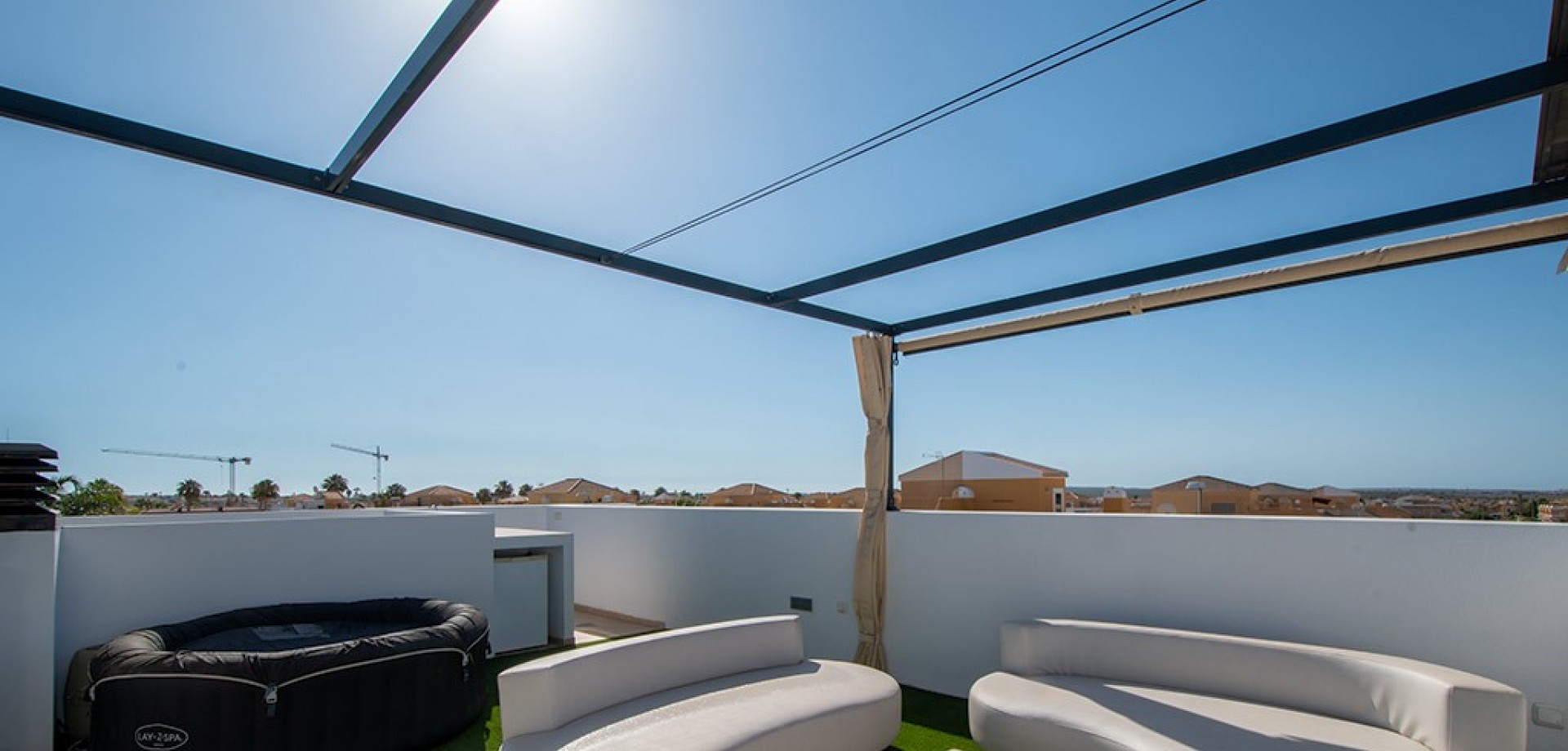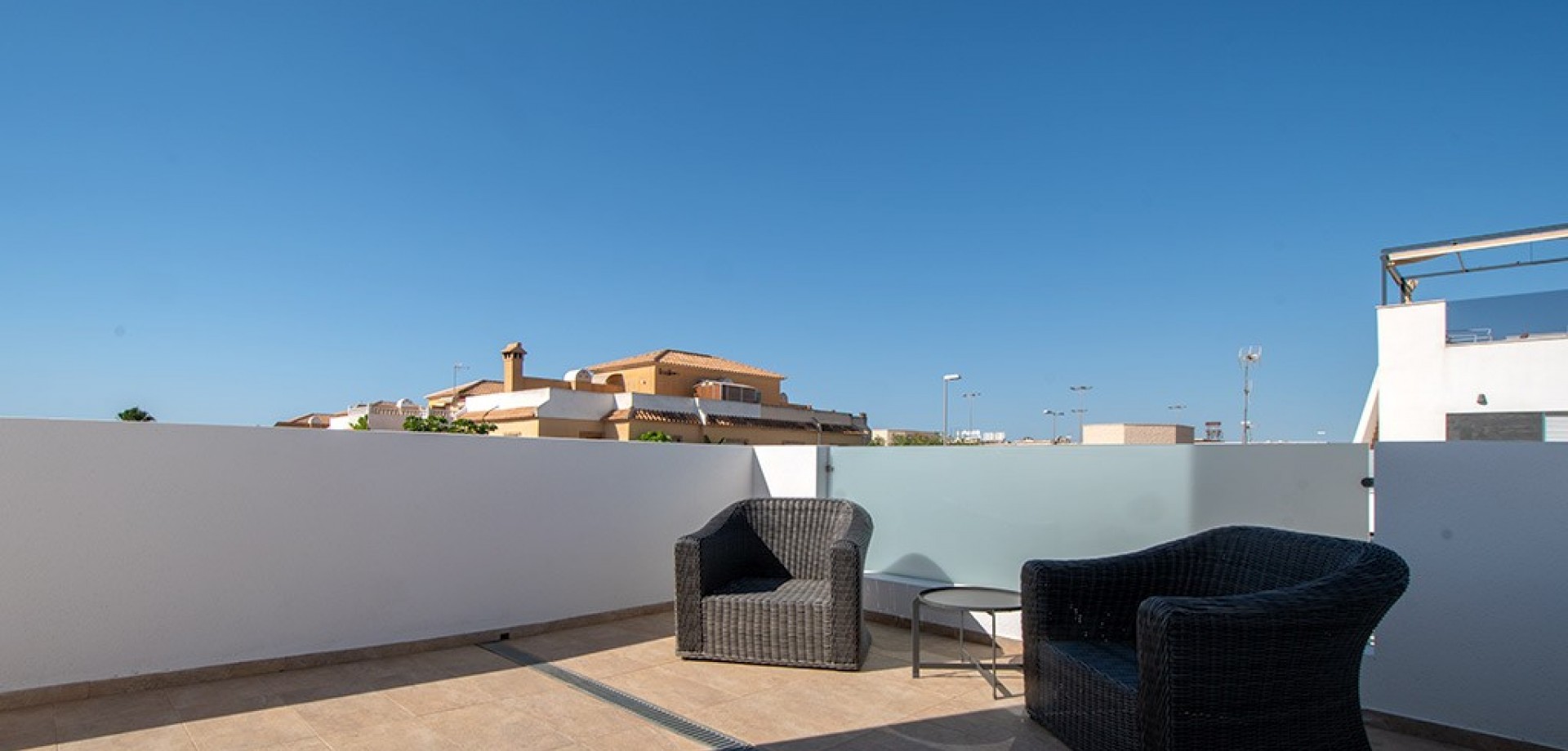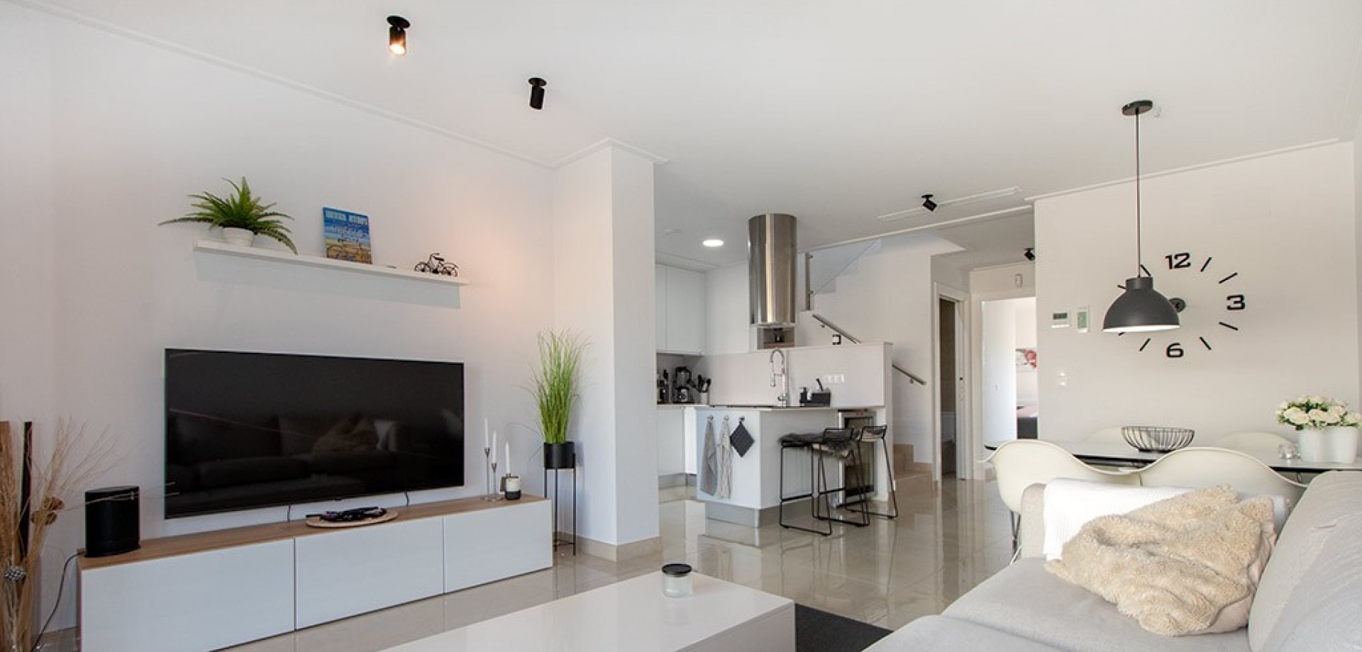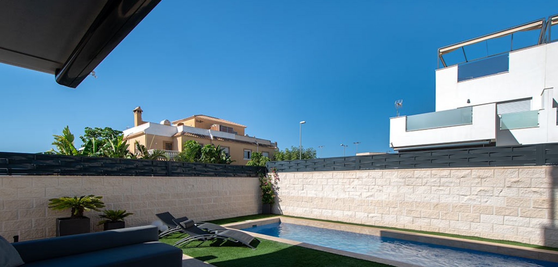 Ready-to-move-in townhouse in the popular residential area of Ciudad Quesada in Rojales. Only 10 minutes’ drive from the spectacular beaches of Guardamar and Torrevieja, and close to the beautiful Natural Park of the Lagoons of La Mata. All the daily necessities are a short drive from the home, like supermarkets, banks, pharmacies, bars, and restaurants. The Alicante airport is only 45 minutes away by car. Beautifully presented home distributed on two floors plus solarium, with 3 bedrooms, 2 bathrooms (one en-suite), and a guest toilet. The spacious and bright living area combines the kitchen, dining area and lounge in a single space, that opens onto a Southwest facing terrace with a private pool, and an outdoor dining area. The master en-suite bedroom is on the ground floor, with the remaining 2 bedrooms and shared bathroom are on the first floor. The spacious terrace on the first floor leads to the solarium, which is the perfect place to enjoy the Costa Blanca climate, with a pergola covered lounge area with artificial grass, and a summer kitchen. The home includes fully installed ducted air conditioning (hot/cold), white goods, private pool, and parking on the premises.