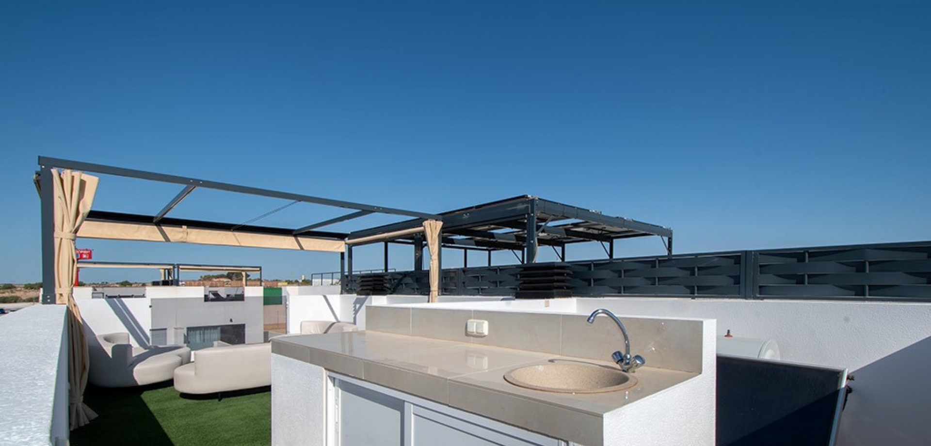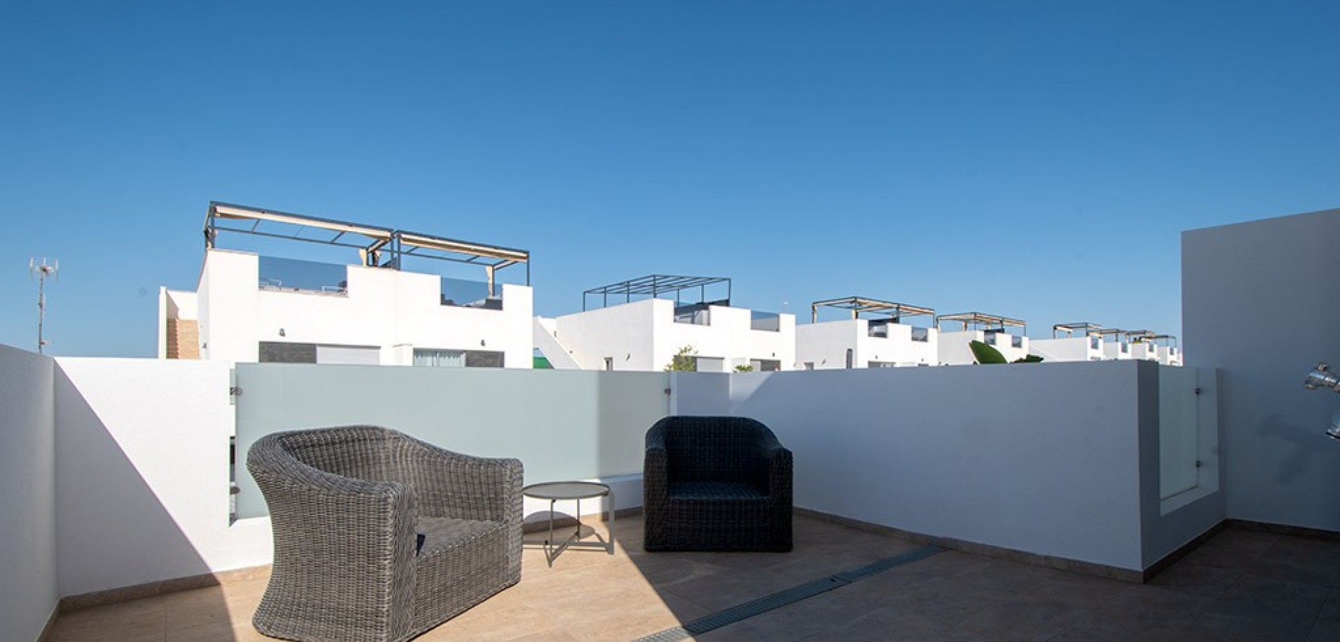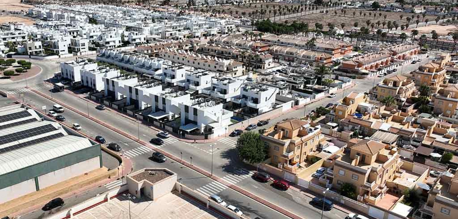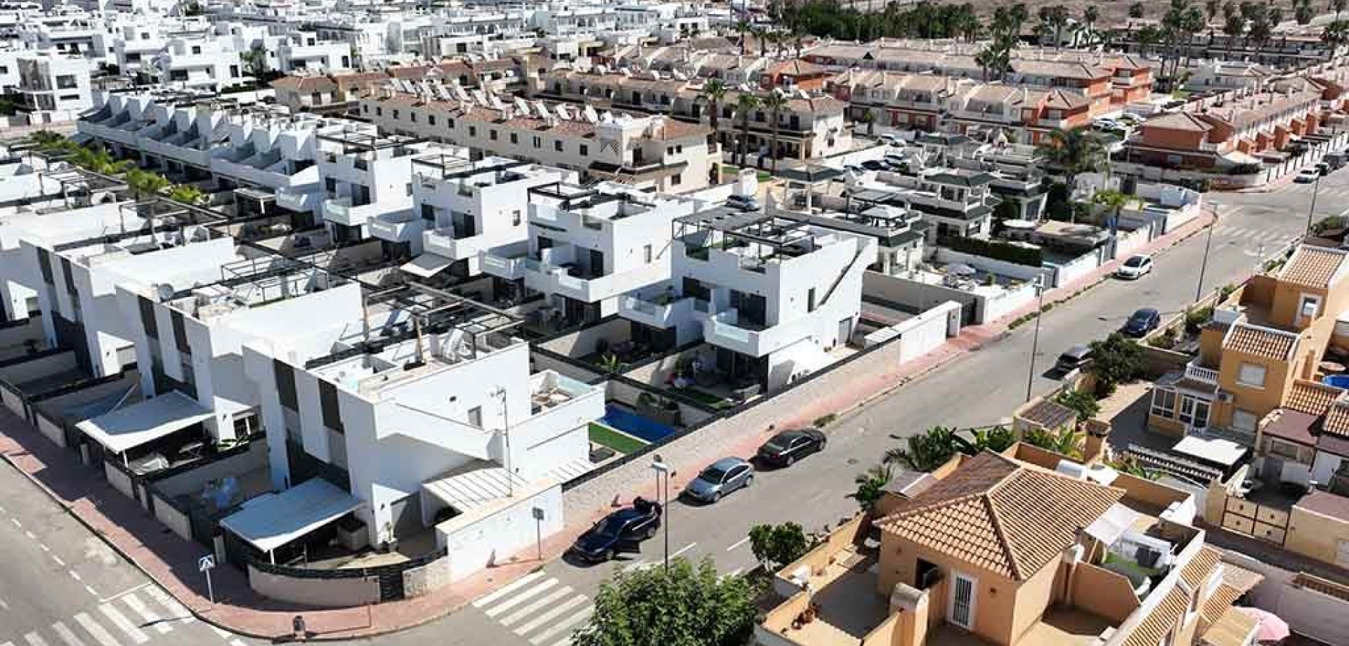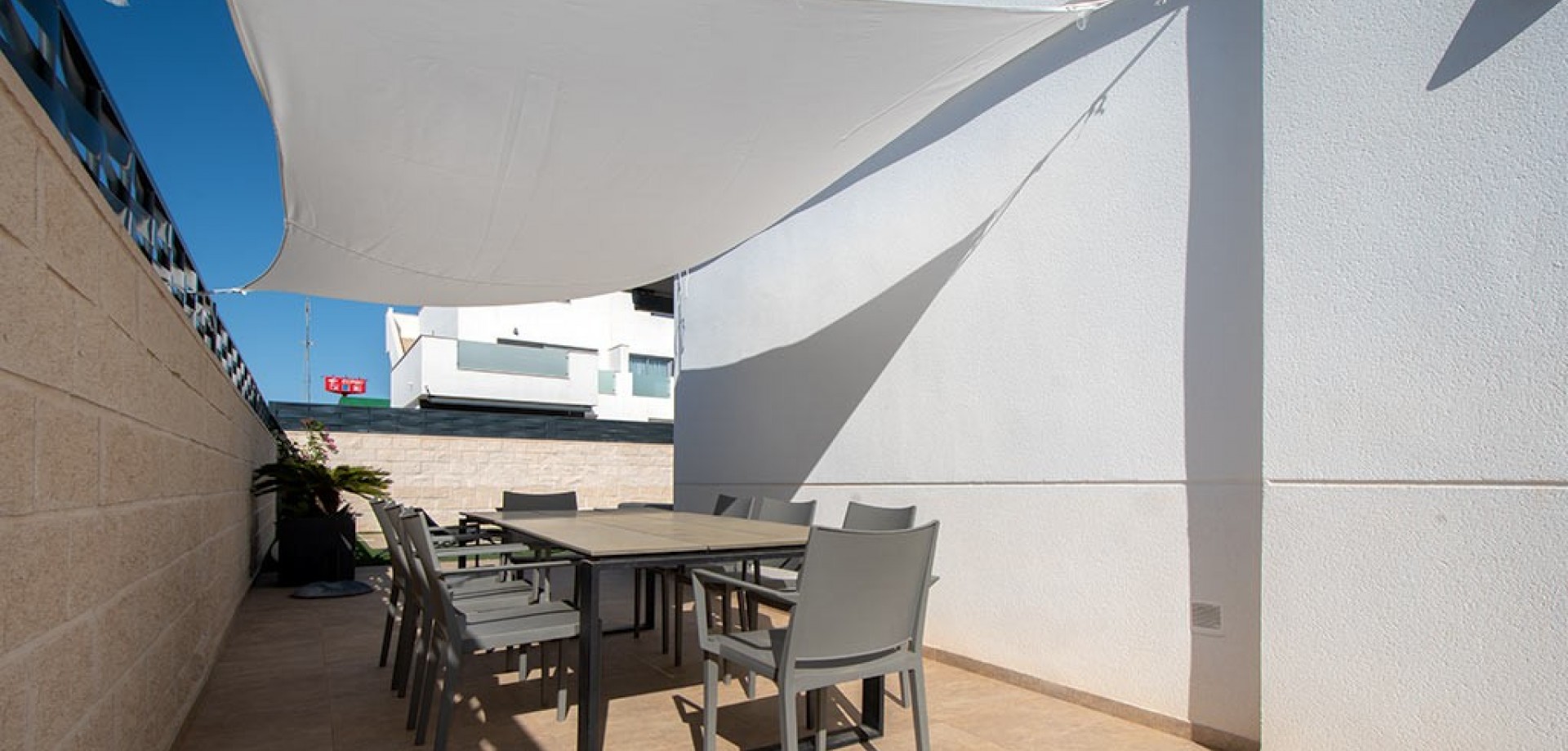 Ready-to-move-in townhouse in the popular residential area of Ciudad Quesada in Rojales. Only 10 minutes’ drive from the spectacular beaches of Guardamar and Torrevieja, and close to the beautiful Natural Park of the Lagoons of La Mata. All the daily necessities are a short drive from the home, like supermarkets, banks, pharmacies, bars, and restaurants. The Alicante airport is only 45 minutes away by car. Beautifully presented home distributed on two floors plus solarium, with 3 bedrooms, 2 bathrooms (one en-suite), and a guest toilet. The spacious and bright living area combines the kitchen, dining area and lounge in a single space, that opens onto a Southwest facing terrace with a private pool, and an outdoor dining area. The master en-suite bedroom is on the ground floor, with the remaining 2 bedrooms and shared bathroom are on the first floor. The spacious terrace on the first floor leads to the solarium, which is the perfect place to enjoy the Costa Blanca climate, with a pergola covered lounge area with artificial grass, and a summer kitchen. The home includes fully installed ducted air conditioning (hot/cold), white goods, private pool, and parking on the premises.