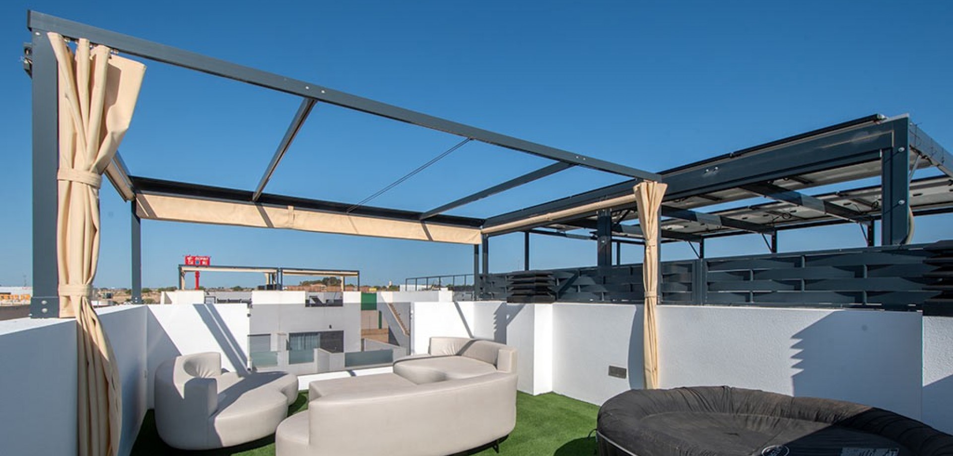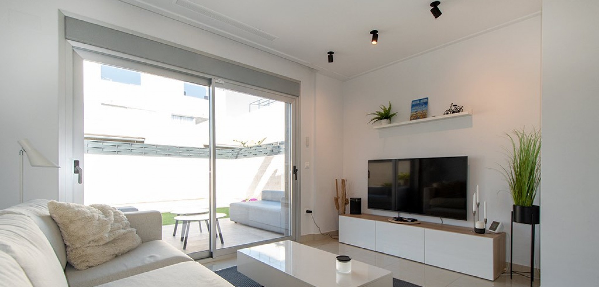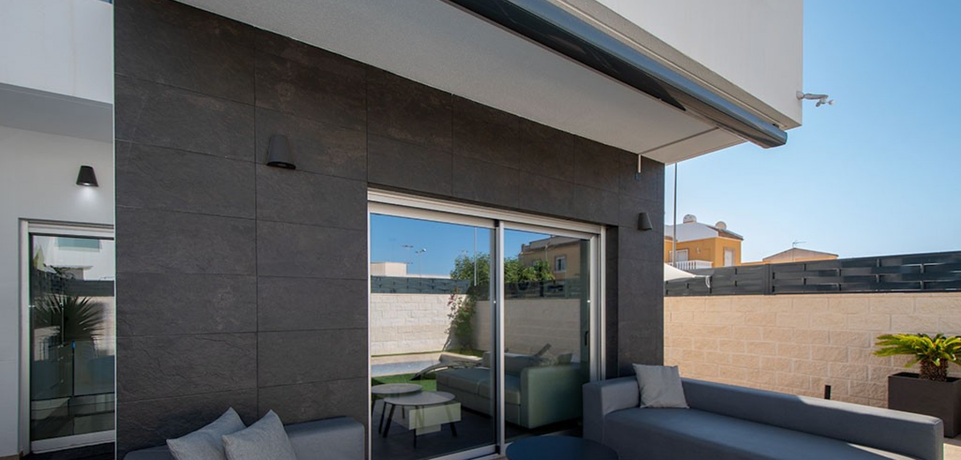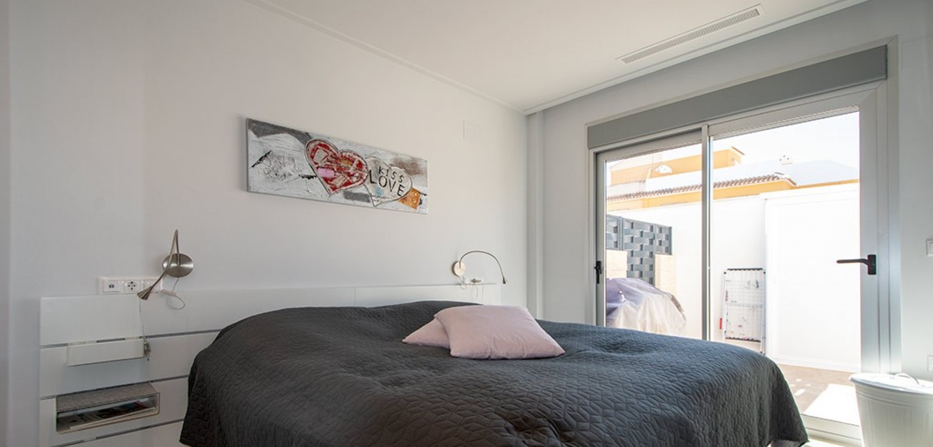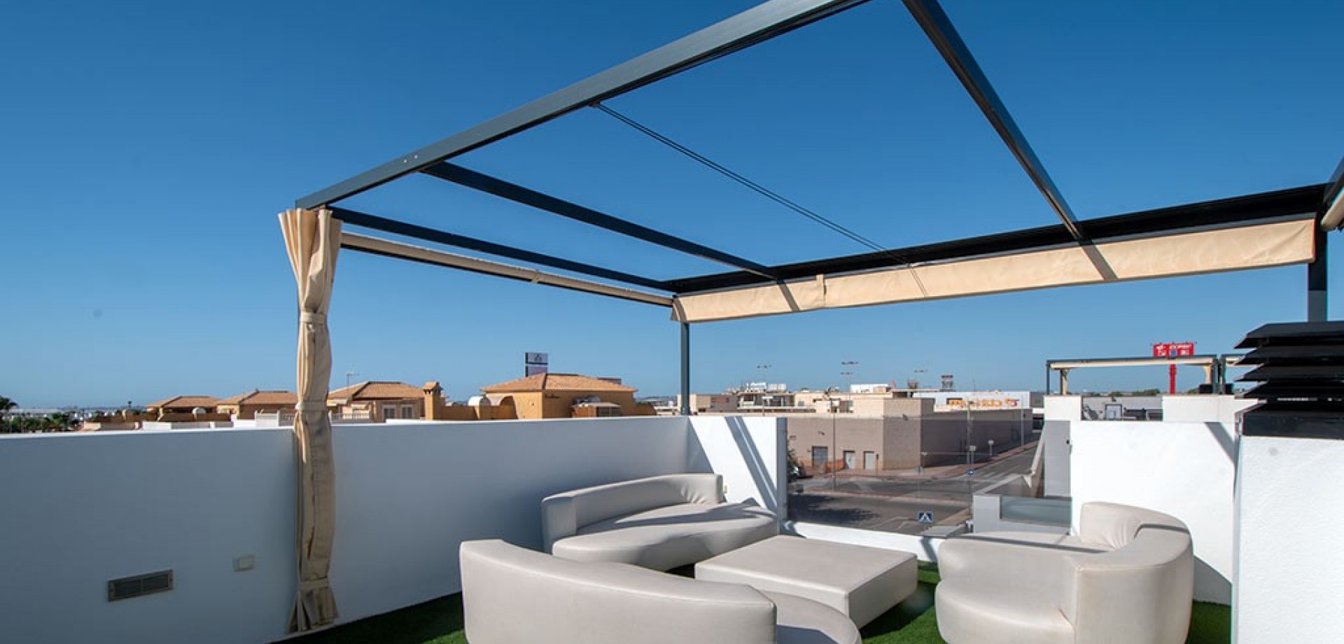 Ready-to-move-in townhouse in the popular residential area of Ciudad Quesada in Rojales. Only 10 minutes’ drive from the spectacular beaches of Guardamar and Torrevieja, and close to the beautiful Natural Park of the Lagoons of La Mata. All the daily necessities are a short drive from the home, like supermarkets, banks, pharmacies, bars, and restaurants. The Alicante airport is only 45 minutes away by car. Beautifully presented home distributed on two floors plus solarium, with 3 bedrooms, 2 bathrooms (one en-suite), and a guest toilet. The spacious and bright living area combines the kitchen, dining area and lounge in a single space, that opens onto a Southwest facing terrace with a private pool, and an outdoor dining area. The master en-suite bedroom is on the ground floor, with the remaining 2 bedrooms and shared bathroom are on the first floor. The spacious terrace on the first floor leads to the solarium, which is the perfect place to enjoy the Costa Blanca climate, with a pergola covered lounge area with artificial grass, and a summer kitchen. The home includes fully installed ducted air conditioning (hot/cold), white goods, private pool, and parking on the premises.