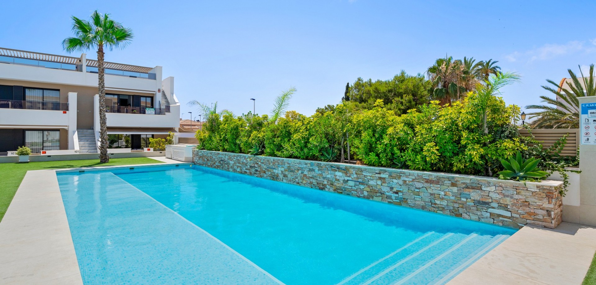 Spain1 are pleased to present this modern and spacious 3 bedroom, 2 bathroom top floor apartment in a popular gated community with communal pool in San Pedro del Pinatar. The apartment is located in the beginning of San Pedro, with walking distance to all amenities you need. Including supermarkets,restaurants and bars. The apartment is located only 2km from the beach. This apartment is a corner top floor with only one apartment below. You access the property thru a set of external stairs, at the top of the stairs there is a gate opening into a terrace with seating area which overlooks the communal pool. The front door is located on this terrace and opens into a spacious and bright open plan living room with dining area and kitchen to the rear. The kitchen is fully fitted with plenty of storage and has a breakfast bar with seating area. From the living room you enter the first of the 3 double bedrooms. This room is currently used as a office/bedroom. The bed in this room is hidden in the wall and can be folded down when needed for guests. There is a short hall from the end of the kitchen area that leads to the second bedroom with built in wardrobes, modern bathroom with shower and the master bedroom with built in wardrobes and en suite also with a shower. Stepping back out the front door onto the terrace there is a further set of external stairs leading to a large 70m2 private roof terrace with plenty of space for sun bathing and dining. Here you have a luxury outdoor kitchen which can be closed with an electric shutter, utility room which holds the boiler, washing machine and dryer and an open-air WC which is perfect when entertaining family or friends. There are lots of added extras such as electric sun awning, ducted hot/cold air conditioning throughout, under floor heating in the bathrooms, allocated parking space and a storage room. The apartment is almost new. It was ready built in July 2023. This apartment is perfect if you want to buy a new build property, but you dont want to wait until its finished. With excellent access to the AP-7 motorway and only 35 minutes to Murcia Airport and 50 minutes to Alicante Airport, this home is ideal for both year-round living and relaxing holidays. Contact us for more info or to book your viewing!