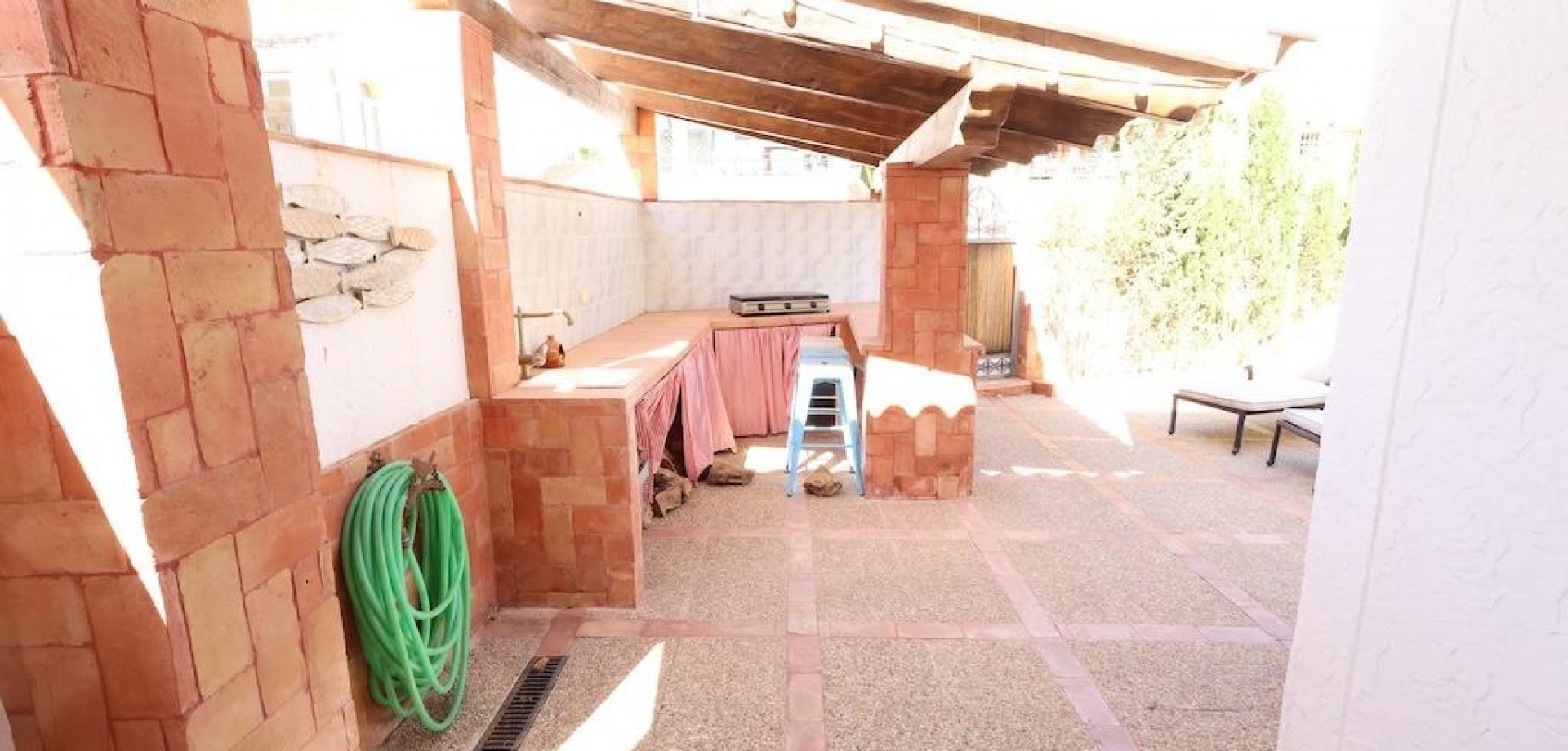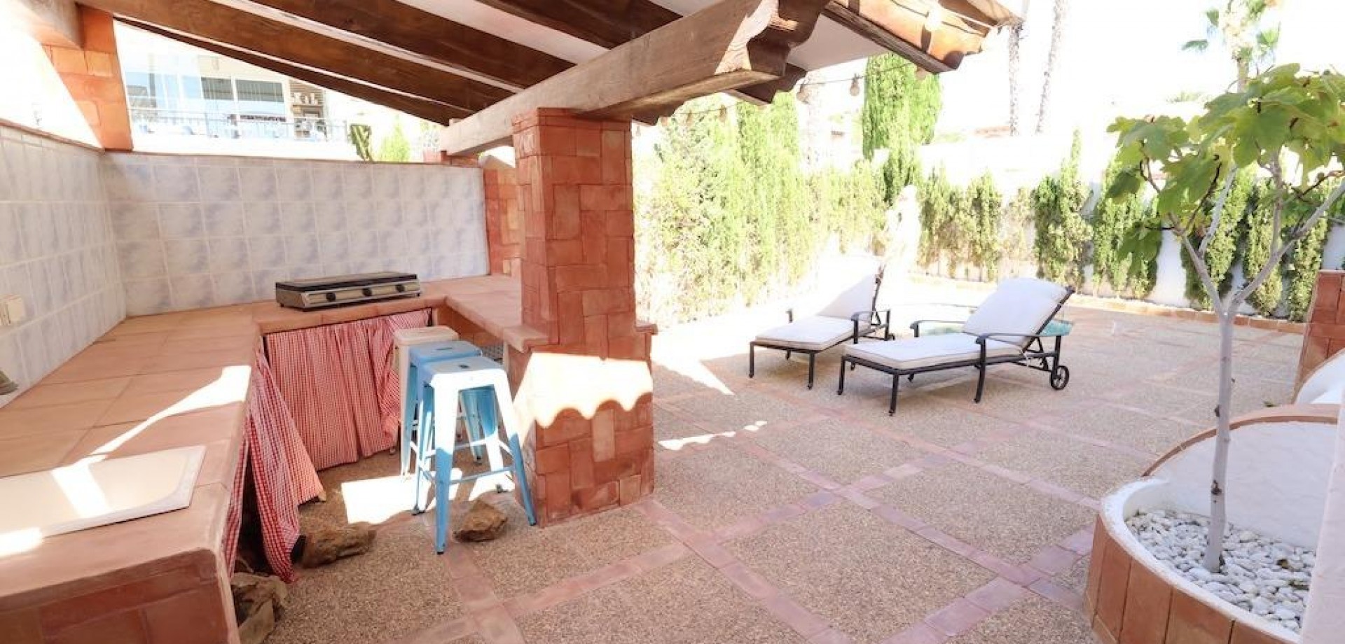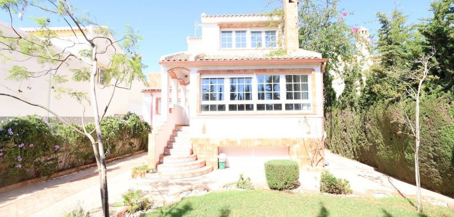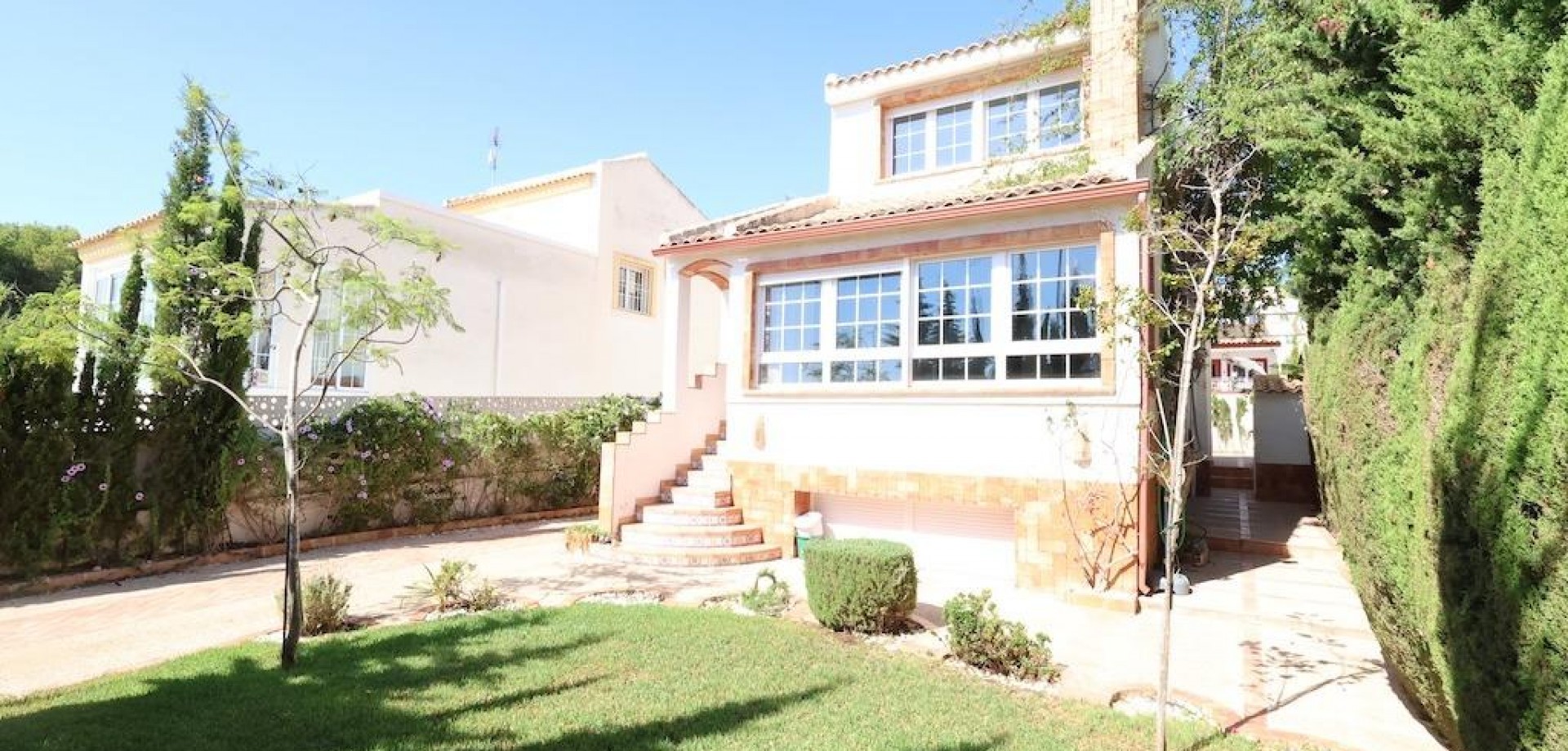 Detached villa located in one of the best areas of Villamartín, just a few meters from the entrance to the golf course. With a constructed area of 189 m2 spread over two floors plus a basement, and a 240 m2 plot, this property offers spaciousness, comfort, and excellent orientation.. . The home has a total of 4 bedrooms and 3 bathrooms. On the ground floor, we find a bright, generously sized living-dining room, a spacious, fully equipped independent kitchen, a bedroom, and a full bathroom. Upstairs is the master bedroom with a dressing room, en-suite bathroom with sauna, and a large terrace with unobstructed views.. . The basement, with independent access, has two additional bedrooms, a full bathroom, and a second living room, ideal for guests or as an additional private space.. . Outside, the property offers a private garden, driveway, barbecue area, and a relaxing jacuzzi located at the rear, perfect for enjoying the Mediterranean climate.. . It is sold furnished and equipped with air conditioning. An ideal home for both permanent residence and vacation, in a prime location close to golf courses, amenities, and beaches.