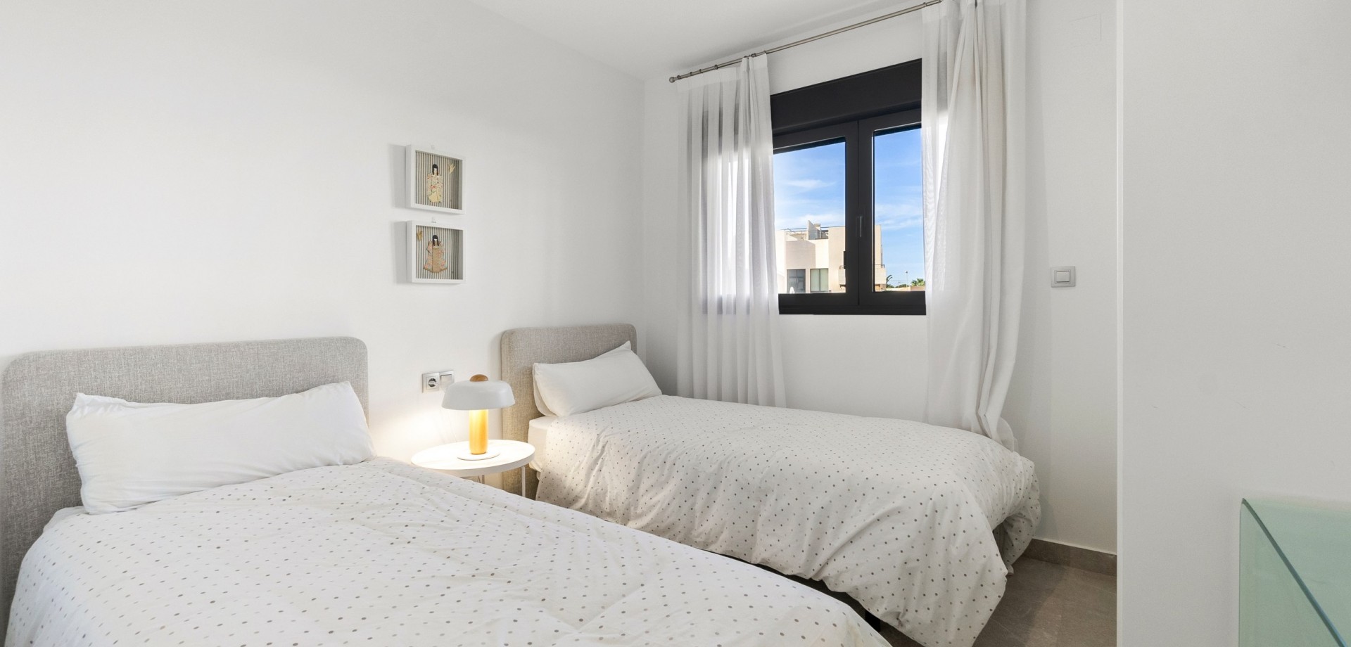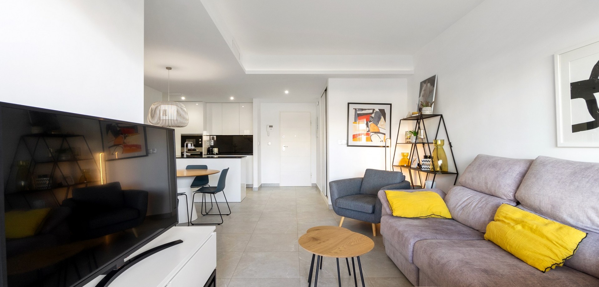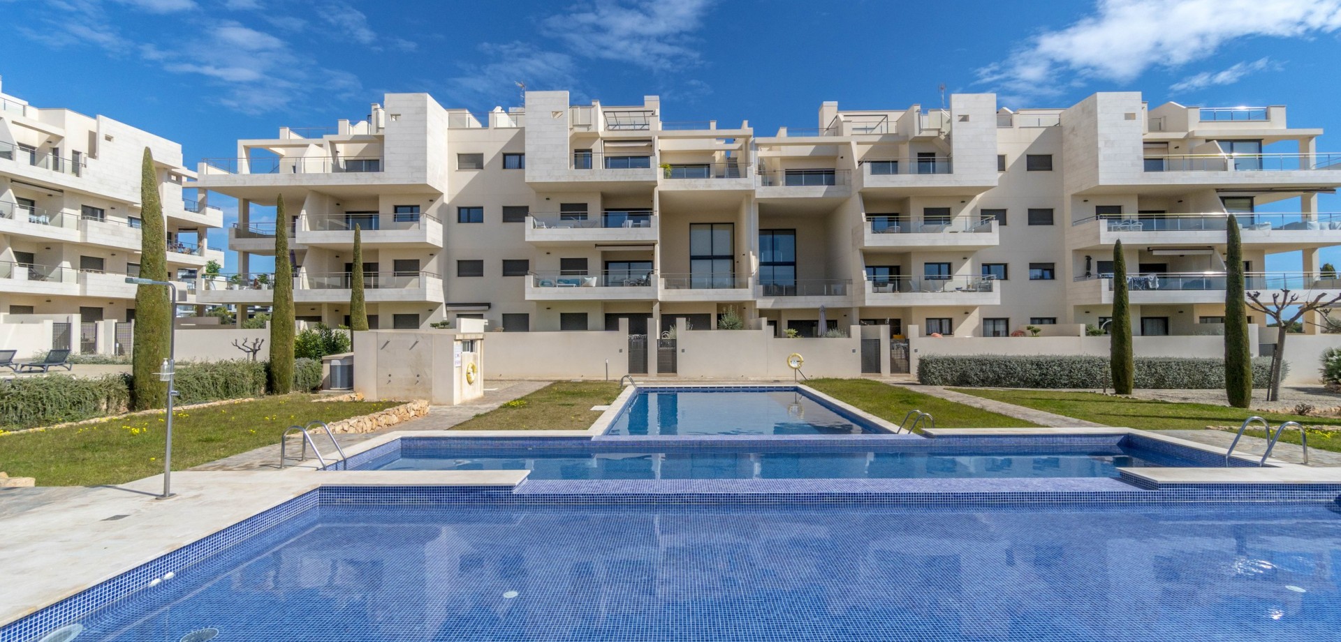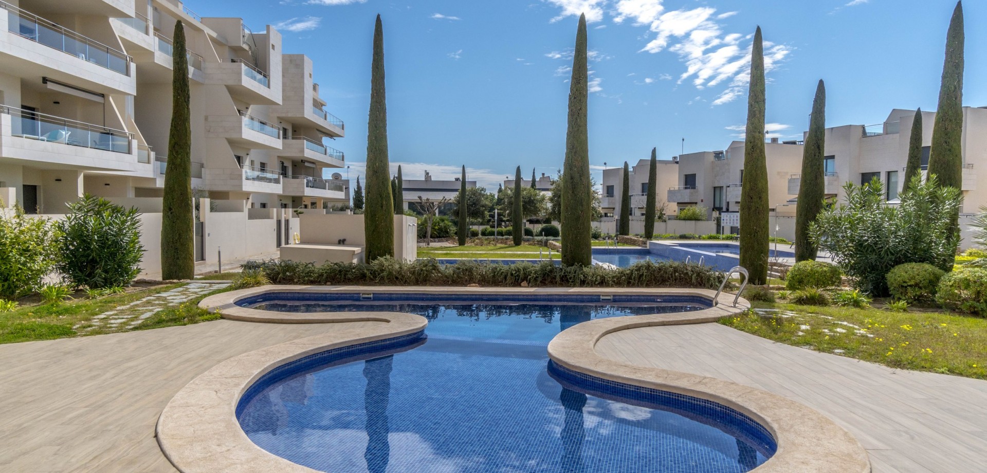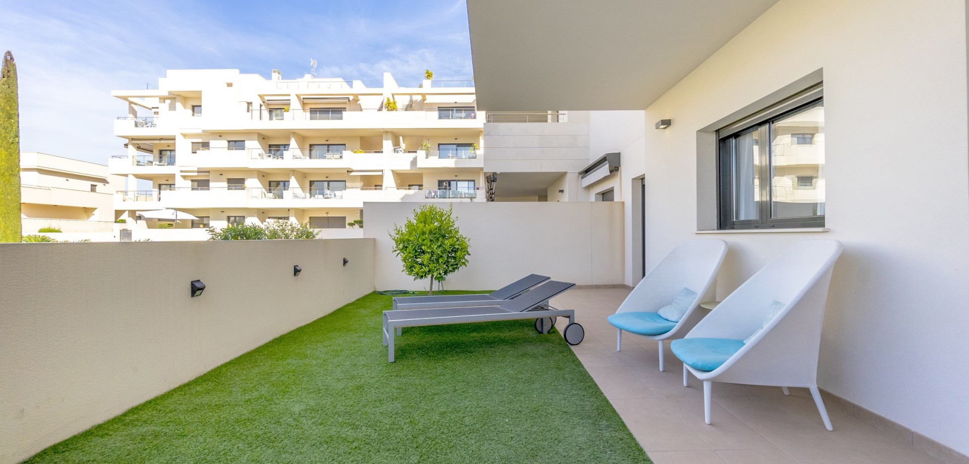 Modern apartment in Jardines de Montesolana, Orihuela Costa. This partment distributed in two bedrooms and two bathrooms. It has a spacious living-dining room with open plan kitchen and direct access to the large garden of 43 m2 with views to the communal areas of the residential with south orientation. It is located in the Jardines de Montesolana development which has a communal swimming pool and garden areas. This residential is close to La Zenia Boulevard shopping centre (Orihuela Costa). La Zenia is close to Cabo Roig, Campoamor and Playa Flamenca. It is a growing area, close to all amenities and the famous La Zenia Boulevard shopping centre. Only a few minutes from the N-332 and the Mediterranean motorway AP-7 towards Alicante and Cartagena. There are also around the golf courses of Villamartin, Las Ramblas, Campoamor and Las Colinas.