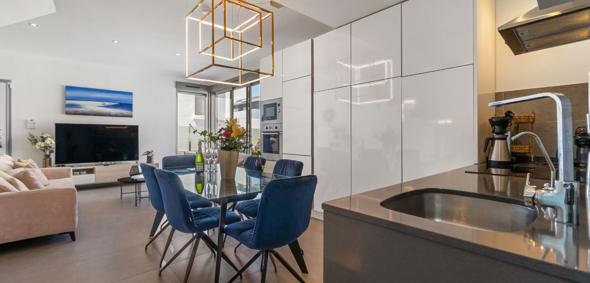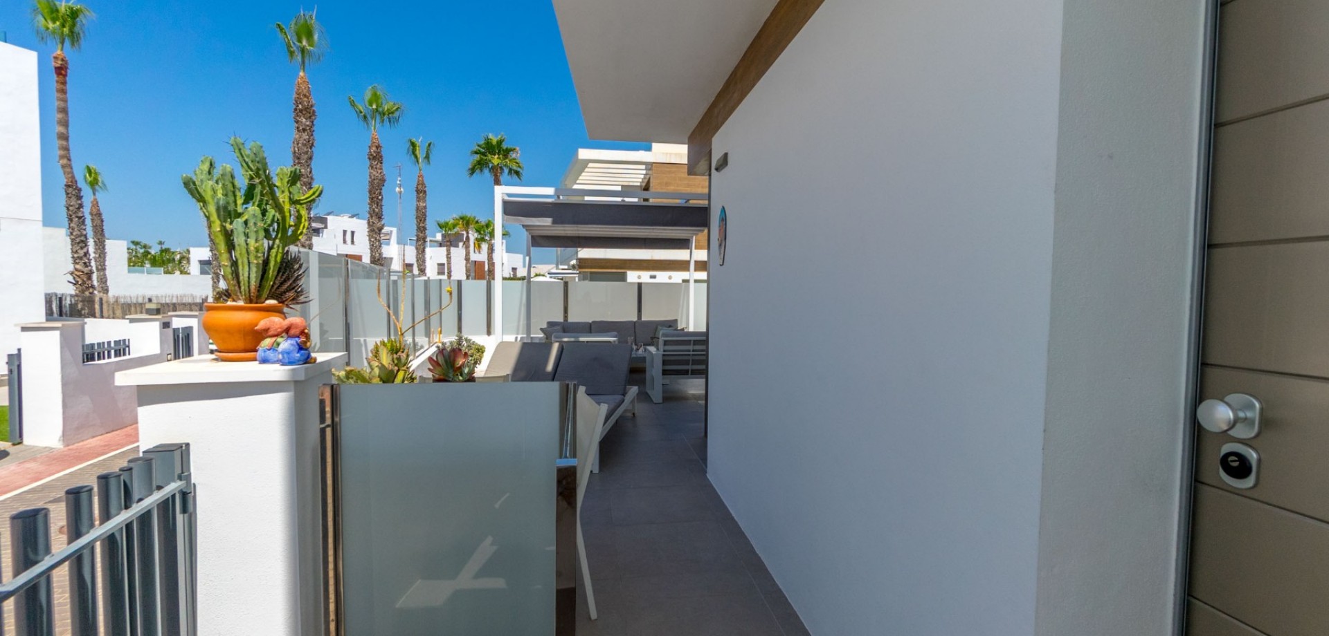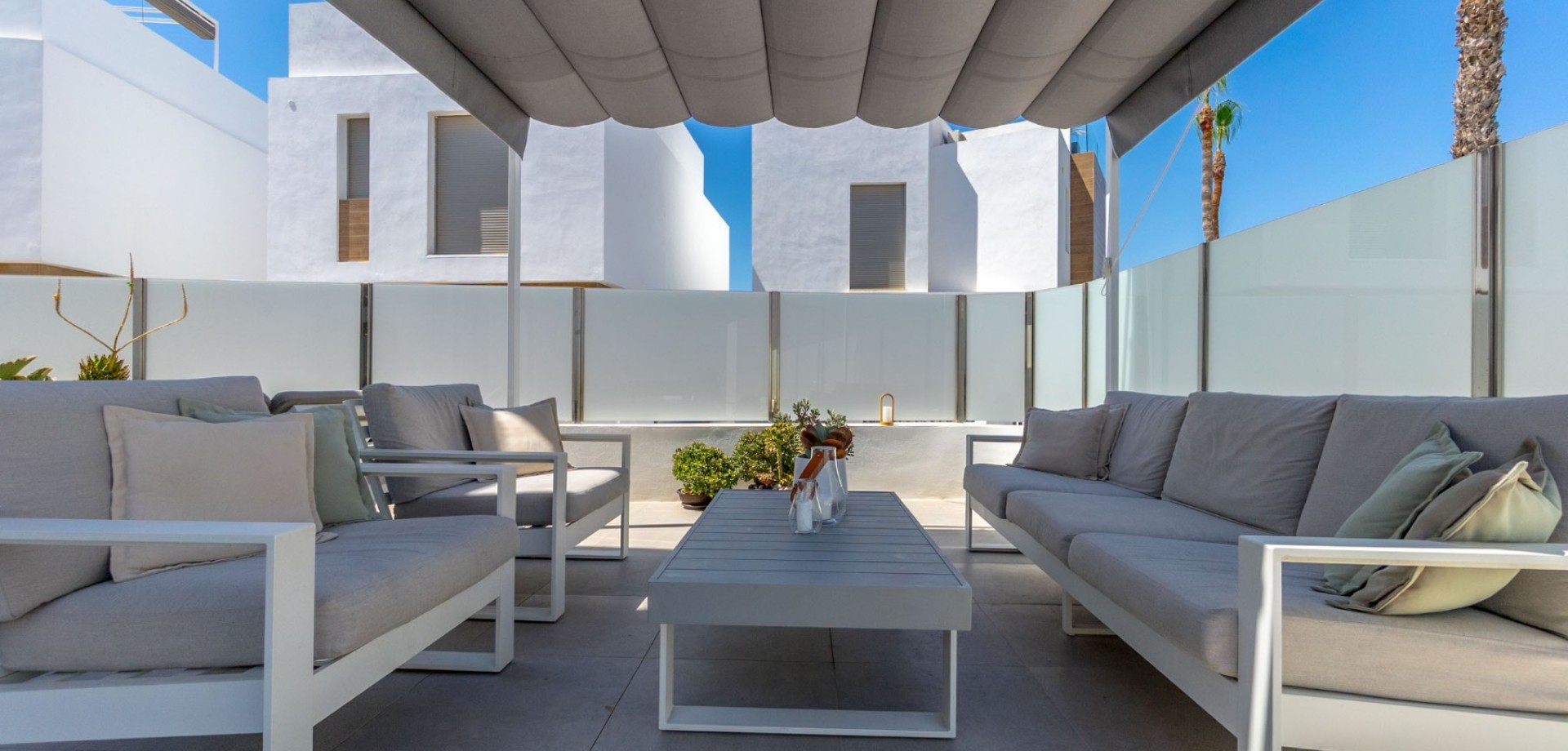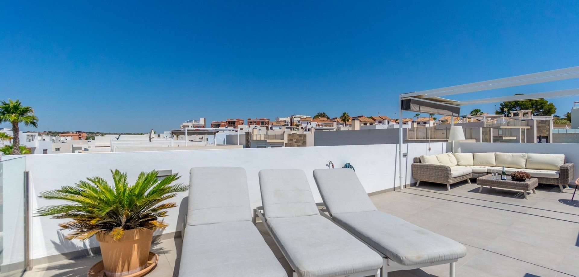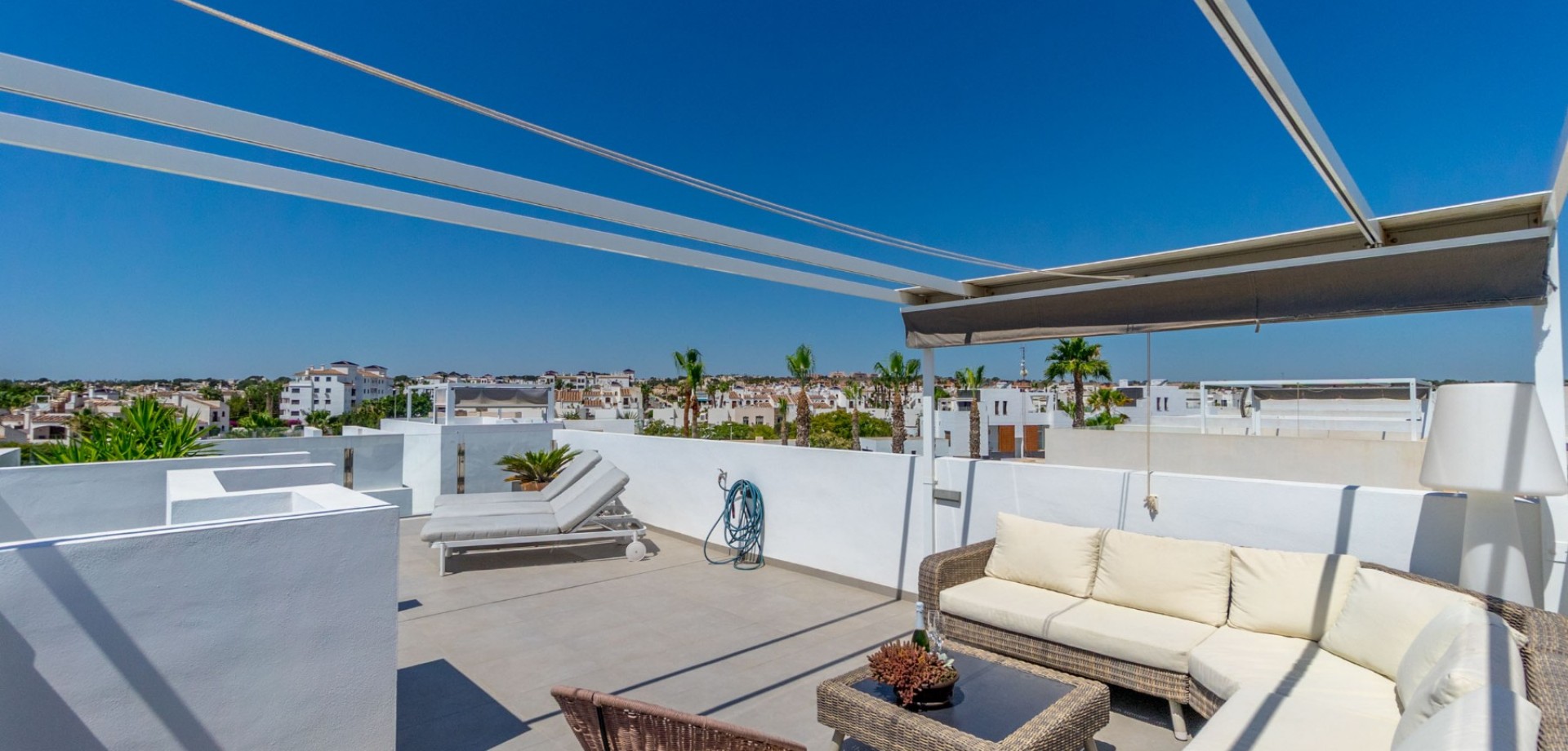 This beautiful villa, built in 2018 and in good condition, is an ideal home for those seeking comfort and a sunny lifestyle on the Costa Blanca. With a southwest orientation, you can enjoy sunny days and evenings. The property is fully furnished, making it ready for immediate occupancy. The property offers: 3 spacious bedrooms 3 modern bathrooms, each equipped with underfloor heating. Living area: 199 m² Plot: 204 m² Terraces: The villa boasts several private outdoor spaces: The master bedroom has a private terrace of 6.58 m². Additionally, there is a spacious roof terrace of 47.06 m² offering extra outdoor space and opportunities for sunbathing and enjoying the views. This also features an outdoor kitchen with running water. Heated private pool for year-round enjoyment Private parking with space for 2 cars Interior and layout: On the ground floor, you will find an open-plan living room and kitchen, perfect for socializing. From this floor, you also have direct access to the pool and the outdoor area below, making it easy to enjoy sunny days. This floor also features one bathroom. Further up on the first floor , you will find three bedrooms and two bathrooms. The master bedroom has its own en-suite bathroom, providing additional privacy and comfort. From the first floor, there is also access to the fantastic roof terrace. Facilities and features include: Sea view and pool view Alarm system and reinforced door for increased security Outdoor and indoor lighting Electric shutters Central air conditioning and central heating Intercom Storage room Built-in wardrobes Access to common green areas and a communal pool (in addition to the private one) The Villamartín Area Villamartín is a well-developed and cosmopolitan urbanization on the Southern Costa Blanca, known for its vibrant community and excellent facilities. The area boasts around 320 sunny days a year and an average annual temperature of approximately 20°C, contributing to a pleasant Mediterranean climate year-round. Villamartín is a paradise for golf enthusiasts. Here you will find the historic Villamartín Golf Course, opened in 1972 and designed by Robert Dean Puttman. This 18-hole course (par 72) is recognized as one of the best in the region and has even hosted qualifying rounds for the European Tour. The course is characterized by mature vegetation and offers fantastic sea views. The clubhouse restaurant also has a rooftop terrace with excellent views of the 18th hole. In addition to Villamartín Golf, there are several other renowned golf courses in the immediate vicinity, including Las Ramblas Golf, Las Colinas Golf & Country Club, La Finca Golf, and Lo Romero Golf. The area is also known for its lively atmosphere with a variety of restaurants, bars, and shops. The famous Villamartín Plaza is a popular meeting point with a wide selection of dining and entertainment options. Large shopping centers like Zenia Boulevard are also nearby. The beautiful beaches along Orihuela Costa, including "Blue Flag" beaches such as La Zenia, Playa Flamenca, and Cabo Roig, are just a short drive away. This villa is perfect for those seeking a combination of privacy, golf, and easy access to all that Villamartín and the Costa Blanca have to offer.