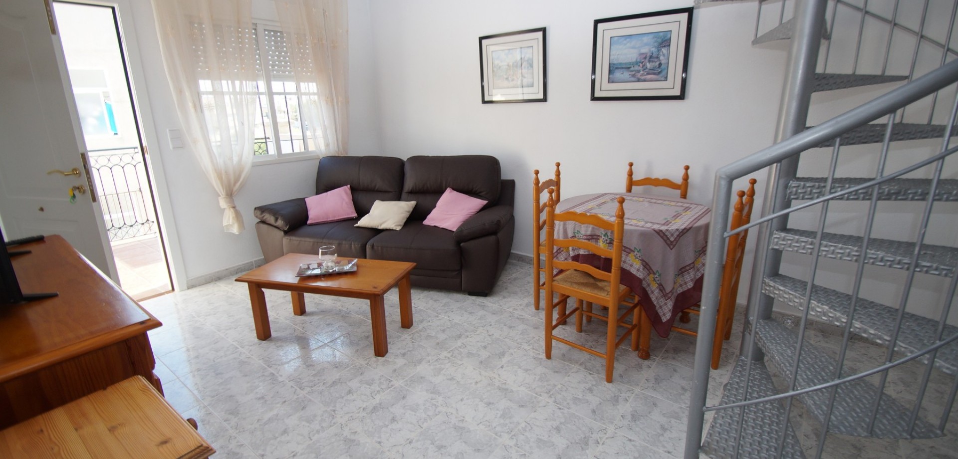 Bungalow on the top floor with internal stairs to private roof terrace. Located to the south, so sun on the terrace all day. The home has a new kitchen in 2020 and appears to be brand new. Sold with all furniture and appliances, except TV. The home has new air conditioning in the living room / kitchen.Communal swimming pool. Short way to the shopping center La Zenia Bulevard.The home is currently let on a long-term contract and a rent of EUR 6.792 per year. The rental contract can be terminated before a sale if buyer wants that.