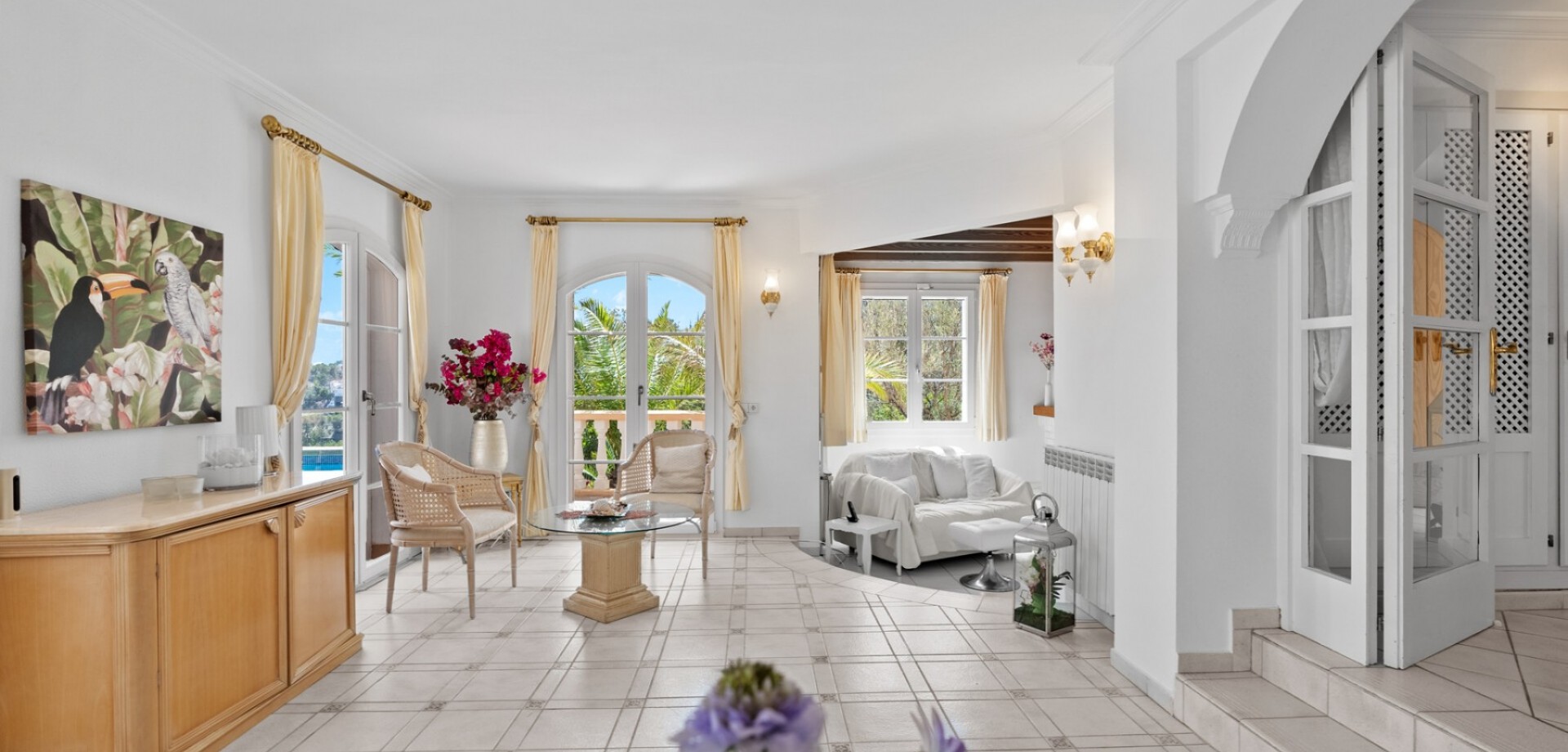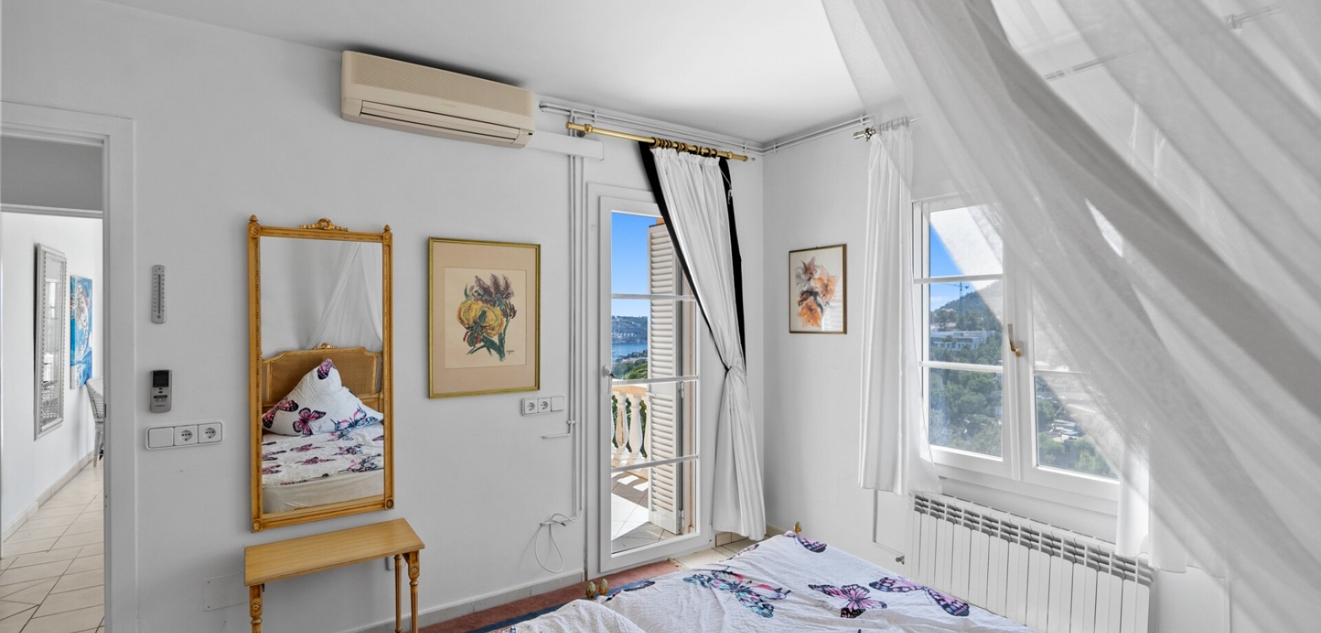 Would you like to live high above one of Mallorca's most desirable neighborhoods, in a villa with spectacular views over the harbor and the sea? Then be sure to check out this rare opportunity we'd like to present to you! This stylish villa enjoys a privileged south-facing hillside location above the harbor of Port d'Andratx in the sought-after residential area of Can Borras . Its elevated position guarantees breathtaking panoramic views of the sea and the marina from virtually every room: from the living room and dining room to all four bedrooms. The Mediterranean-style property offers approximately 316 m² of living space spread over two levels. The ground floor includes an elegant entrance hall, a A living room with a fireplace, an open-plan dining room with a modern fitted kitchen, a utility room, and a bathroom. The upper floor houses the master bedroom with a dressing room and en-suite bathroom, two further bedrooms, an additional bathroom, a conservatory, and a balcony with sea views. The outdoor area features a spacious swimming pool (approx. 37 m²) , open and covered terraces , a BBQ area , a gazebo, and a lovingly landscaped garden . A garage for one vehicle is also available. The high-quality features include: Central heating (gas), air conditioning in the bedrooms, tiled floors, fitted wardrobes, some with electric shutters, double glazing and an alarm system. A special highlight is the permittable expansion reserve of approx. 113 m² (according to the architect), which offers additional design freedom, should this be desired. The quiet yet central location with short distances to the popular Club de Vela, the harbor promenade, and Palma (approx. 25 minutes drive) completes the overall picture of this high-quality property. A rare opportunity in one of Mallorca's best locations. Contact us for more information or a personal viewing.
