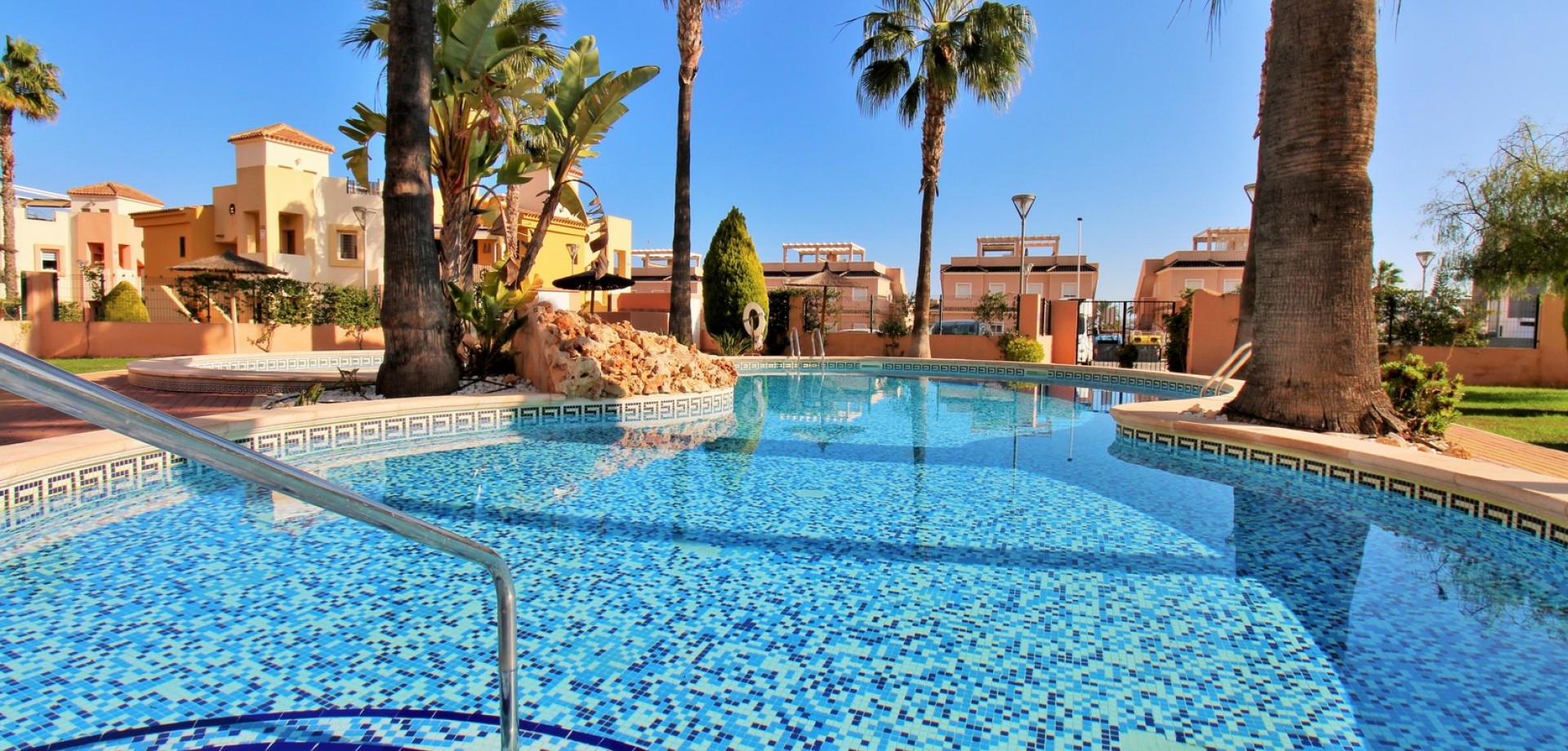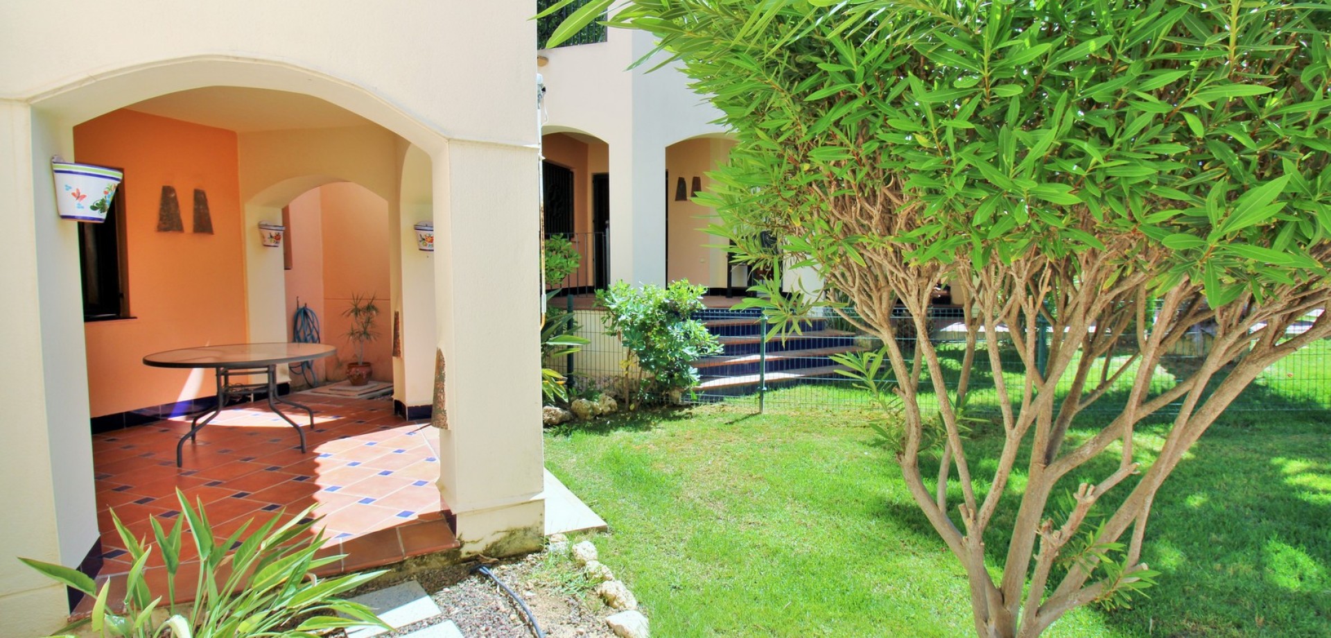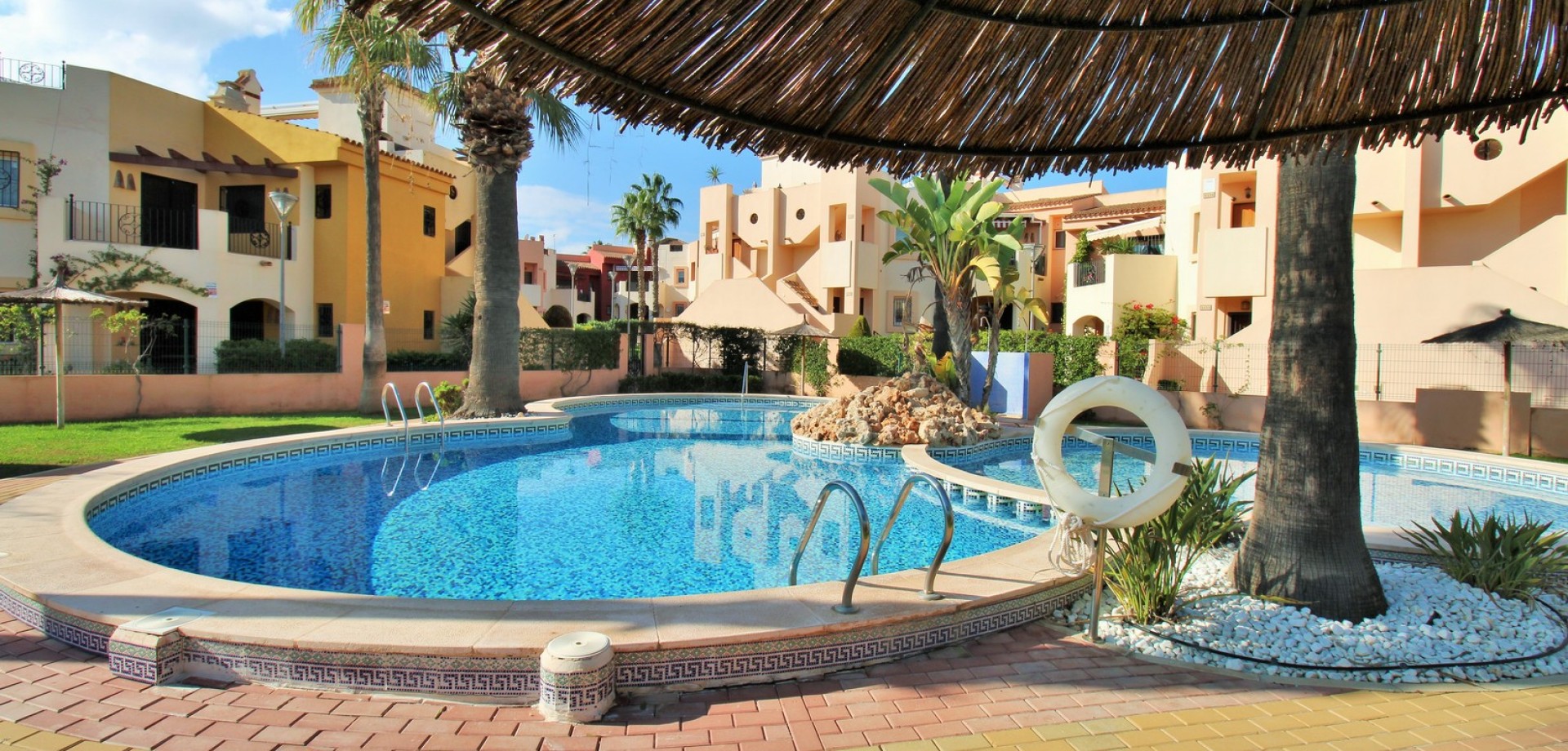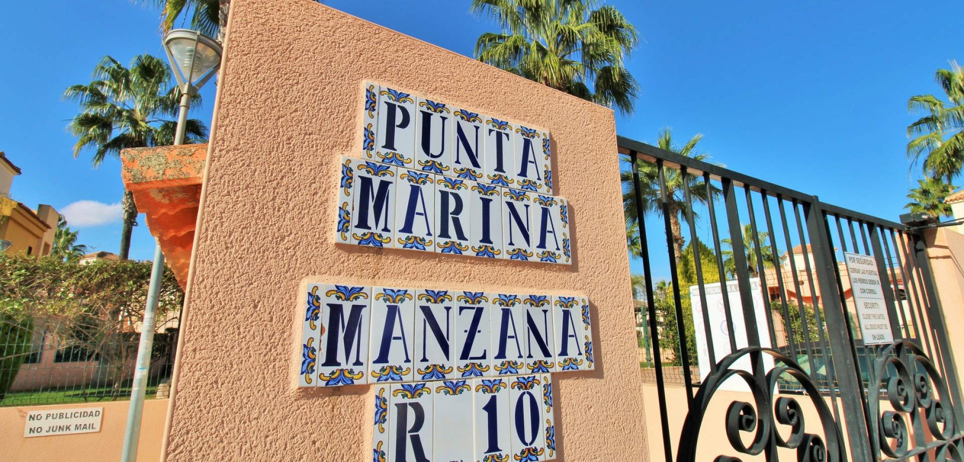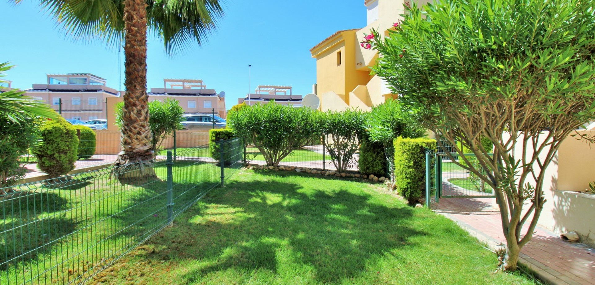 A bright and inviting ground floor apartment with two bedrooms, two bathrooms, and a generous 36m2 private garden, located within the sought-after gated community of Punta Marina in Punta Prima. Full of charm and character, this well-presented apartment features a traditional Spanish-rustic style and sits within a beautifully maintained complex offering residents access to a communal swimming pool—conveniently situated just next to the property—as well as off-road communal parking. Ideally positioned just 400 metres from the Punta Marina commercial centre, where you’ll find a Consum supermarket, shops, bars, and restaurants, and only 900 metres from the seafront, the location offers excellent convenience. The apartment comprises a spacious lounge and dining area, a separate fully fitted kitchen with adjoining utility room, two double bedrooms with built-in wardrobes, and a renovated family bathroom with a walk-in shower. The master bedroom benefits from its own en-suite. French doors open from the living area onto a covered terrace, leading down to a beautifully maintained private garden with lawn and mature planting—garden maintenance is included in the community fees. Offered fully furnished, including white goods and air conditioning. Residential Punta Marina is a well-located and established community, offering a peaceful setting within easy walking distance of all amenities. Homes with gardens of this size, in such a prime location, rarely become available. Early viewing is highly recommended.