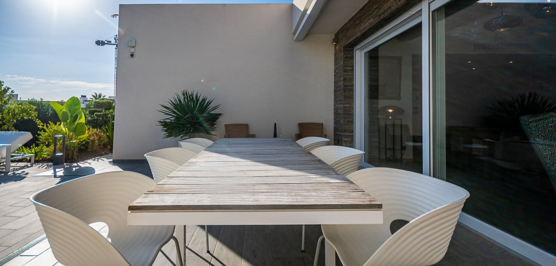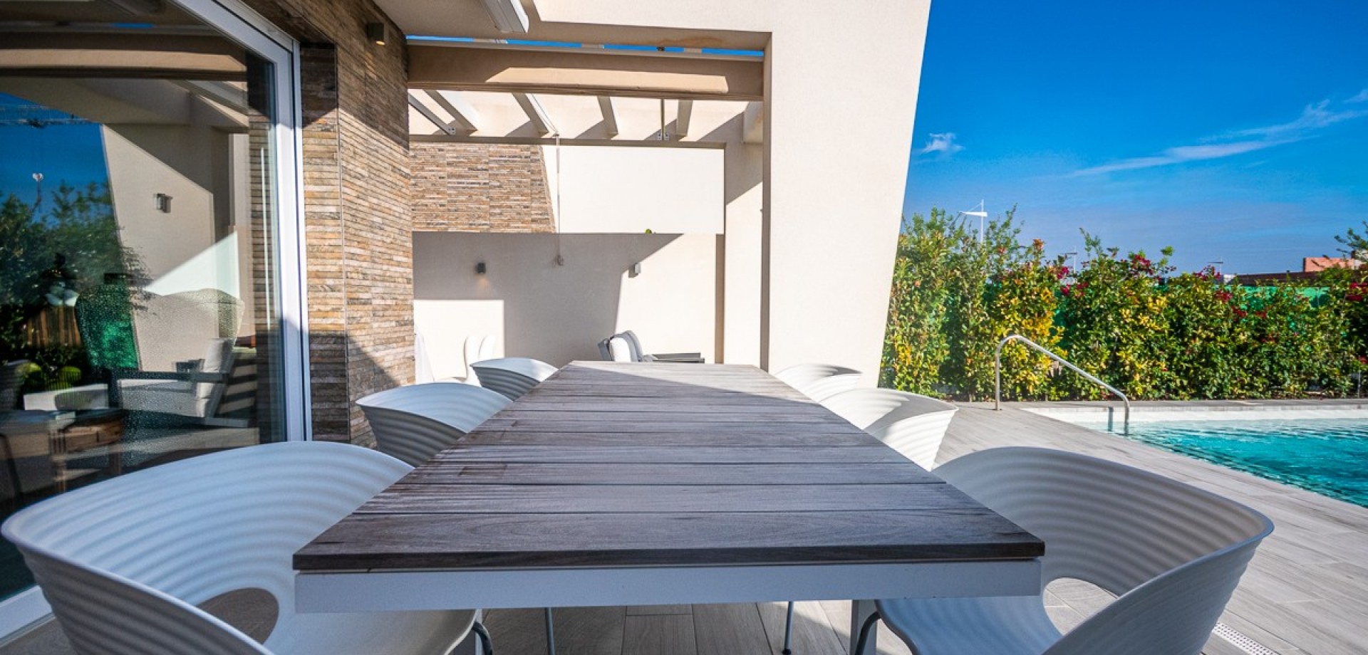 Stunning Detached Villa with high-end extra´s at La Finca Golf Resort – Algorfa This unique villa, situated on a spacious 500m² plot, offers a perfect blend of modern comfort and Mediterranean charm. The bright, open-plan layout seamlessly connects the living area, kitchen and dining space, all opening onto an impressive L-shaped terrace, beautifully landscaped garden, and a private pool. Thanks to the large windows, natural light floods every corner of the home, creating a warm and inviting atmosphere. The terrace, partially covered by a stylish pergola with electric awnings, is the ideal spot to relax or entertain — a perfect setting to enjoy the Mediterranean climate all year round. Originally designed with three bedrooms, the current owners have customised the layout into a more spacious two-bedroom configuration. With minimal effort, the villa can easily be converted back into a three-bedroom home. The 3th bedroom can be constructed again if the buyer wishes this. Do you drive electric? Your own charging point is already installed, and the house has 3-phase selectric wires fitted up to 400V This villa is equipped to the highest standard: Zoned hot/cold air conditioning Underfloor heating in the bathrooms Security system with video surveillance Smart home automation Electric shutters Private pool with outdoor shower Charging point for electric vehicles Multiple electric awnings Private parking with automatic gate Colorful garden with fruit treesHigh-tech extras throughout the house The mature garden surrounds the villa with fruit trees and aromatic plants, offering privacy and a sense of tranquillity. The kitchen is a true highlight — fitted with high-end Miele appliances and finished to the very best quality standards. There is even a basement that still needs to be finished wher you have more then 100m2 to make your own extra rooms, mancave or bodega.. Located within the prestigious La Finca Golf Resort in Algorfa, at the heart of the Vega Baja, this home offers access to exclusive amenities: fine dining restaurants, a luxurious 5-star hotel with spa and gym, an elegant clubhouse, and the renowned La Finca 18-hole golf course. Just a short drive away you’ll find the beautiful beaches of Guardamar and Torrevieja, where the sun shines over 300 days a year. Both Alicante and Murcia airports are within easy reach — 40 and 55 minutes respectively. A truly exceptional villa, offering peace, luxury and the perfect Mediterranean lifestyle.