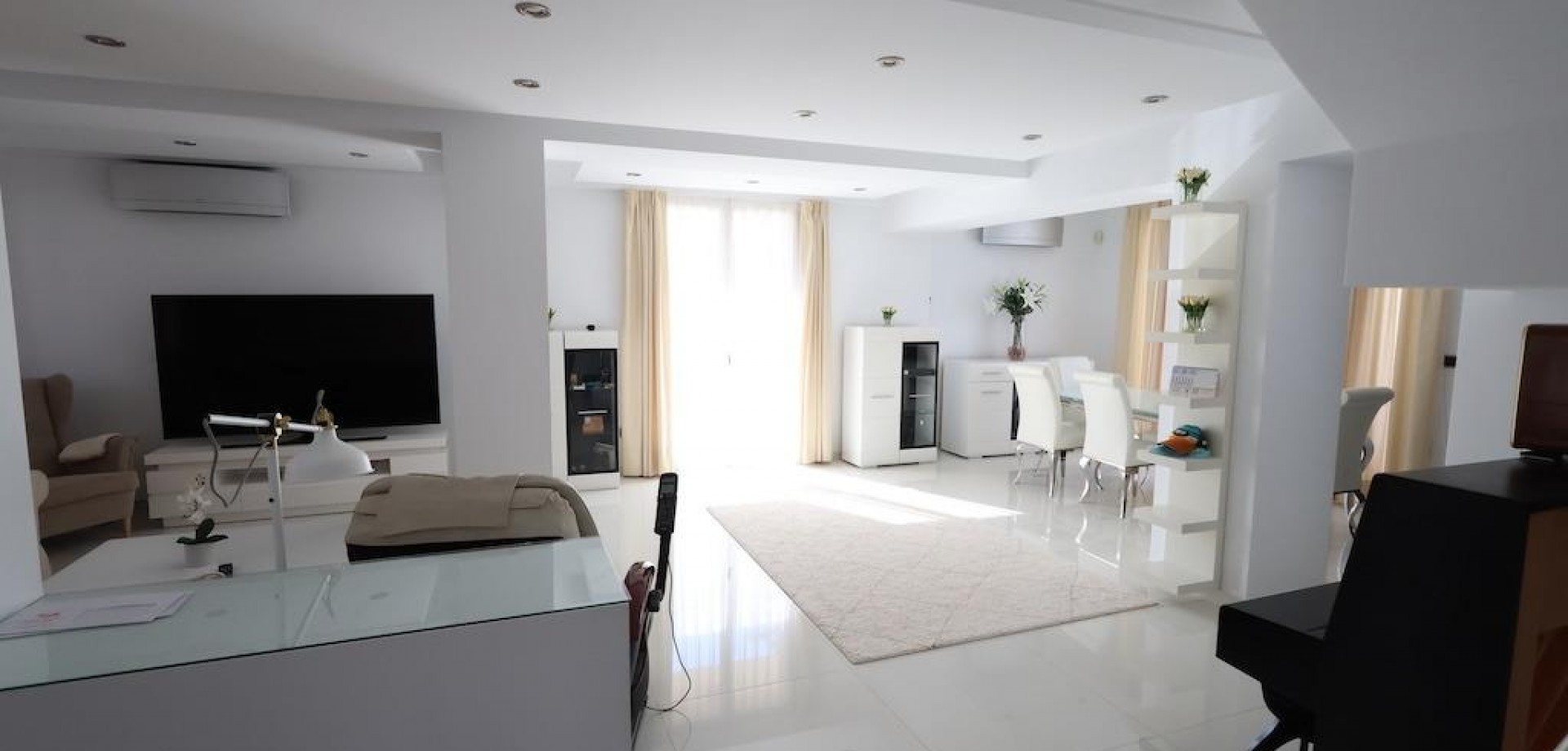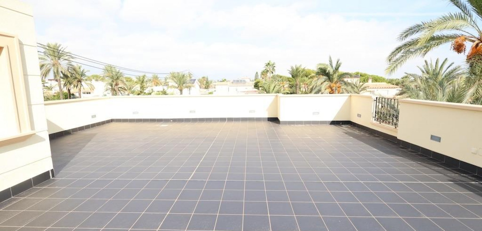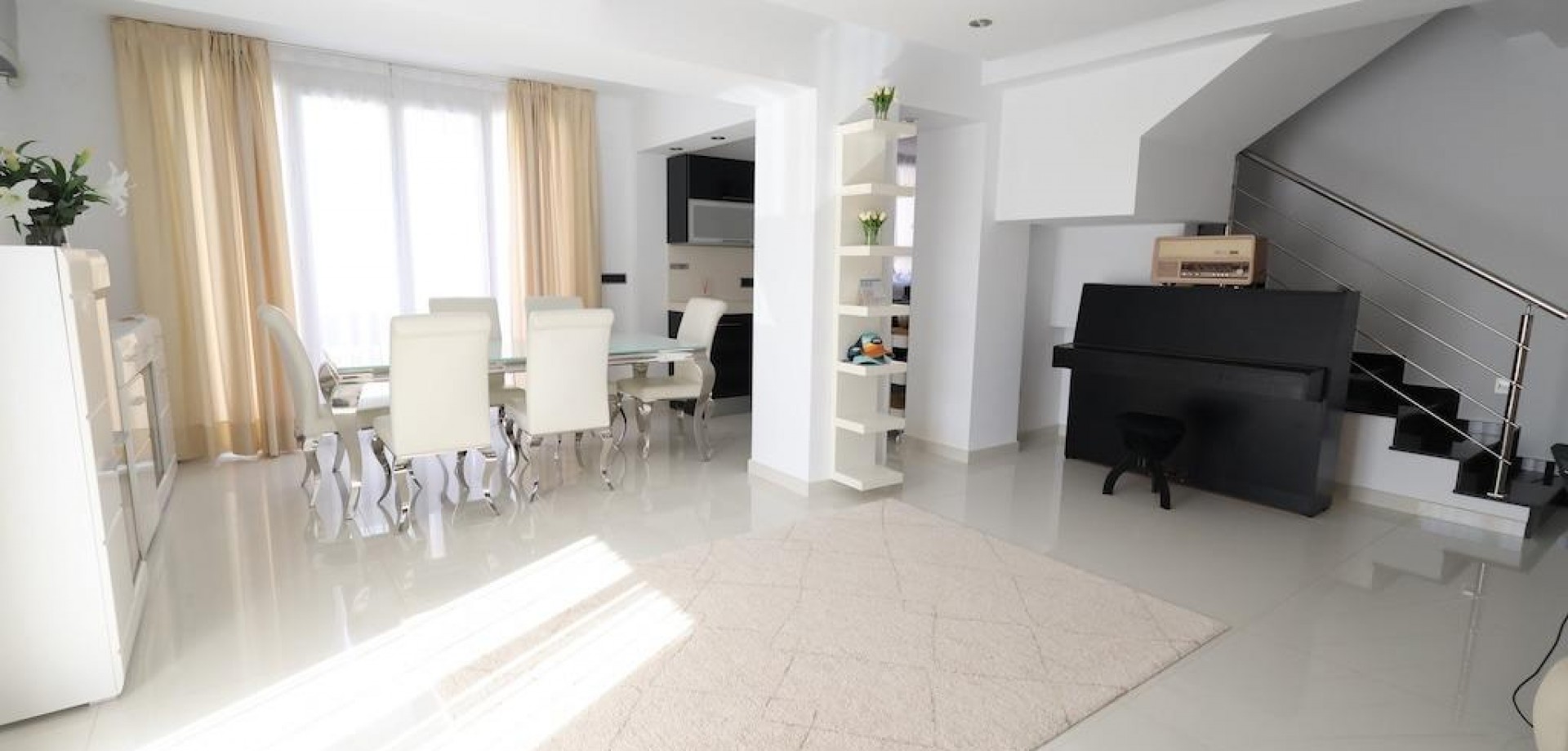 Cabo Roig Detached villa on a 415 m2 corner plot overlooking two streets.. This modern, two-story home offers a contemporary and functional design, measuring 222 m2. It features 4 spacious bedrooms and 3 bathrooms, a bright living-dining room with a semi-integrated kitchen, a private pool, a driveway, and a large private solarium, perfect for enjoying the sun year-round.. Sold fully furnished and equipped with air conditioning. Located in one of the most exclusive areas of the coast.