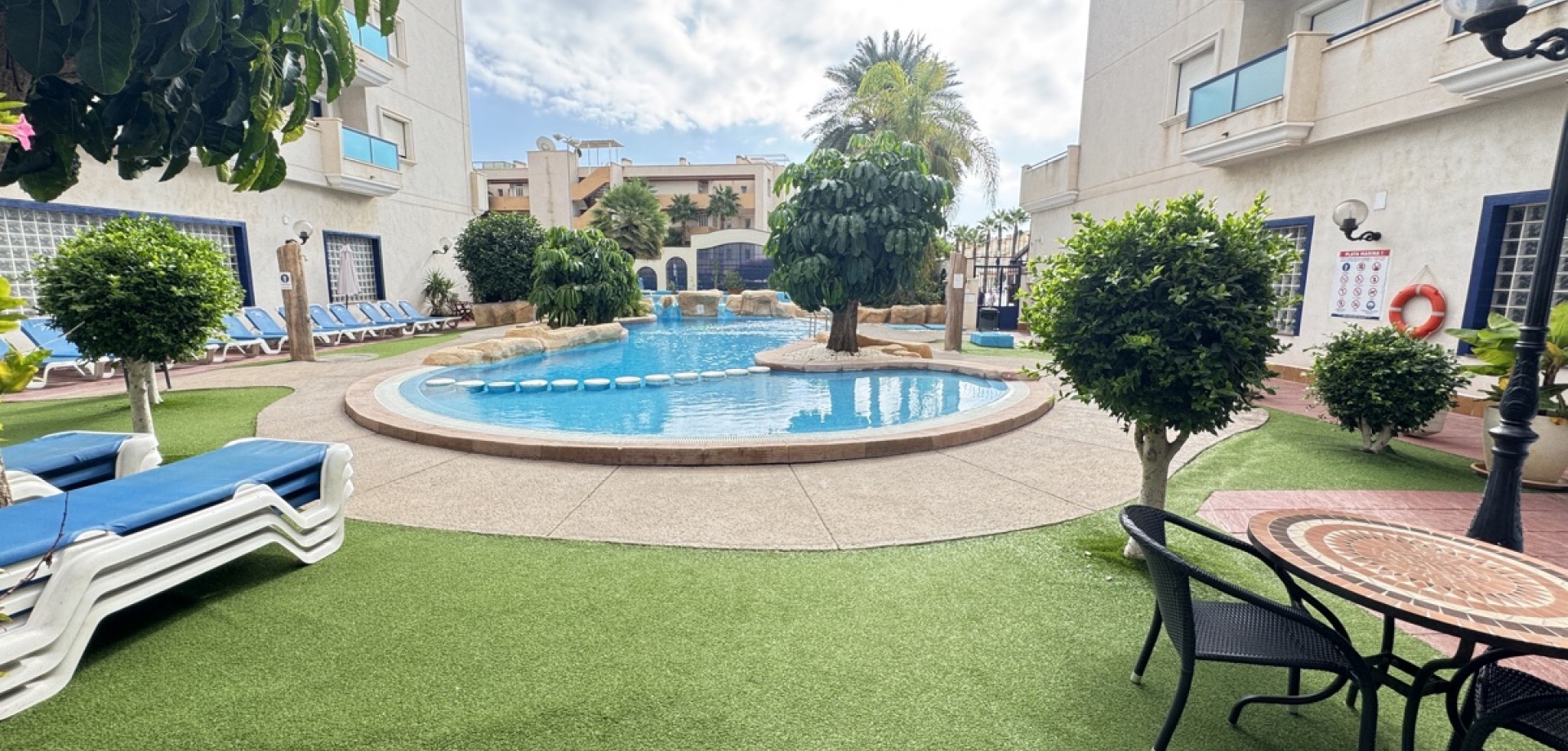 Discover a charming 2-bedroom, 1-bathroom apartment in the heart of the Cabo Roig strip, perfect for a holiday investment. KEY FEATURES: - Stylish Open-Plan Kitchen: A modern kitchen area flows seamlessly into the living space, perfect for relaxing and entertaining. - Spacious Bedrooms: 2 bedrooms with plenty of natural light, ideal for couples or small families. - Terrace: perfect for alfresco dining or relaxation. - Communal Pool and Bar Area: Unwind by the pool or enjoy a refreshing cocktail at the bar, socializing with neighbors and friends. - Underground Parking Space: Secure and convenient parking, just steps away from the apartment. LOCATION: - Heart of Cabo Roig Strip: This property is located in the vibrant heart of Cabo Roig, with shops, restaurants, and leisure facilities just outside the door. - Walking Distance to Amenities: Supermarkets, cafes, and beaches are all within easy walking distance. IDEAL FOR: - Holiday Investment: This property is perfect for rental income, with its prime location and stylish design. - Couples: The apartment's compact size and modern design make it ideal for couples seeking a relaxing getaway. - Small Families: The 2 bedrooms and communal pool area make this apartment suitable for small families. Don't miss the opportunity to own this charming 2-bedroom apartment in Playa Marina.