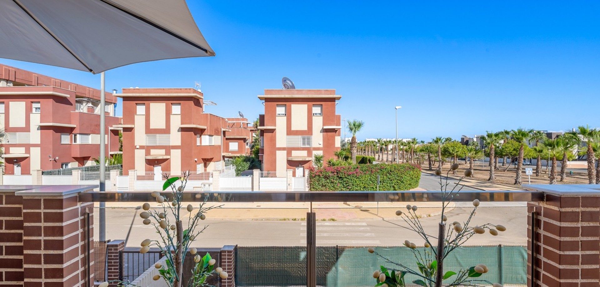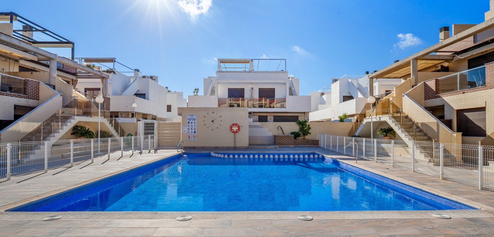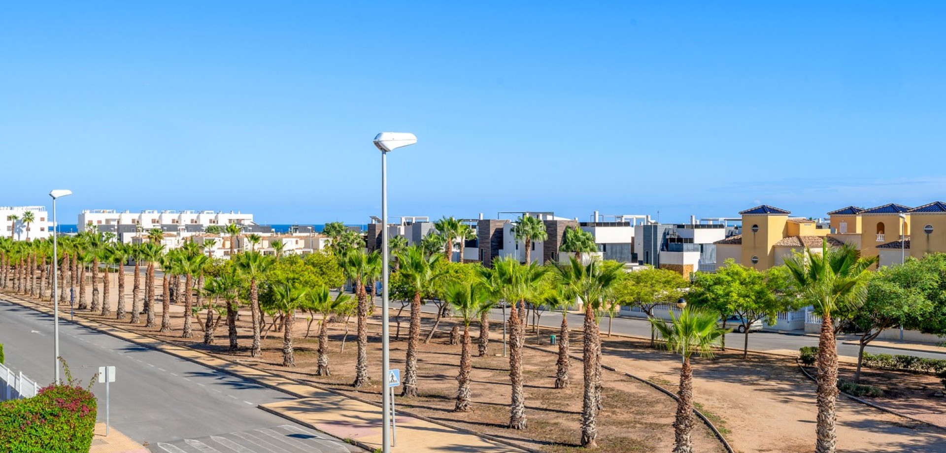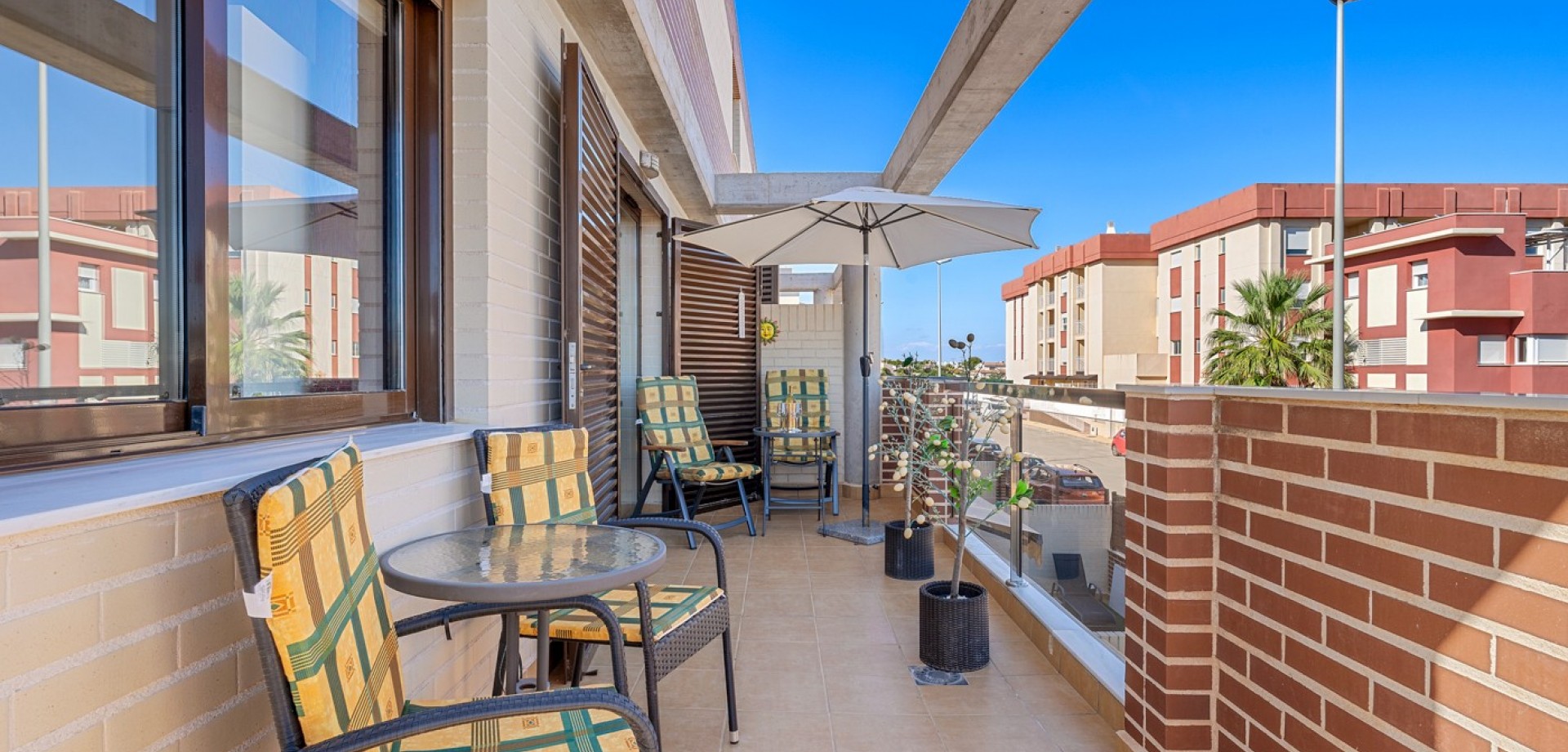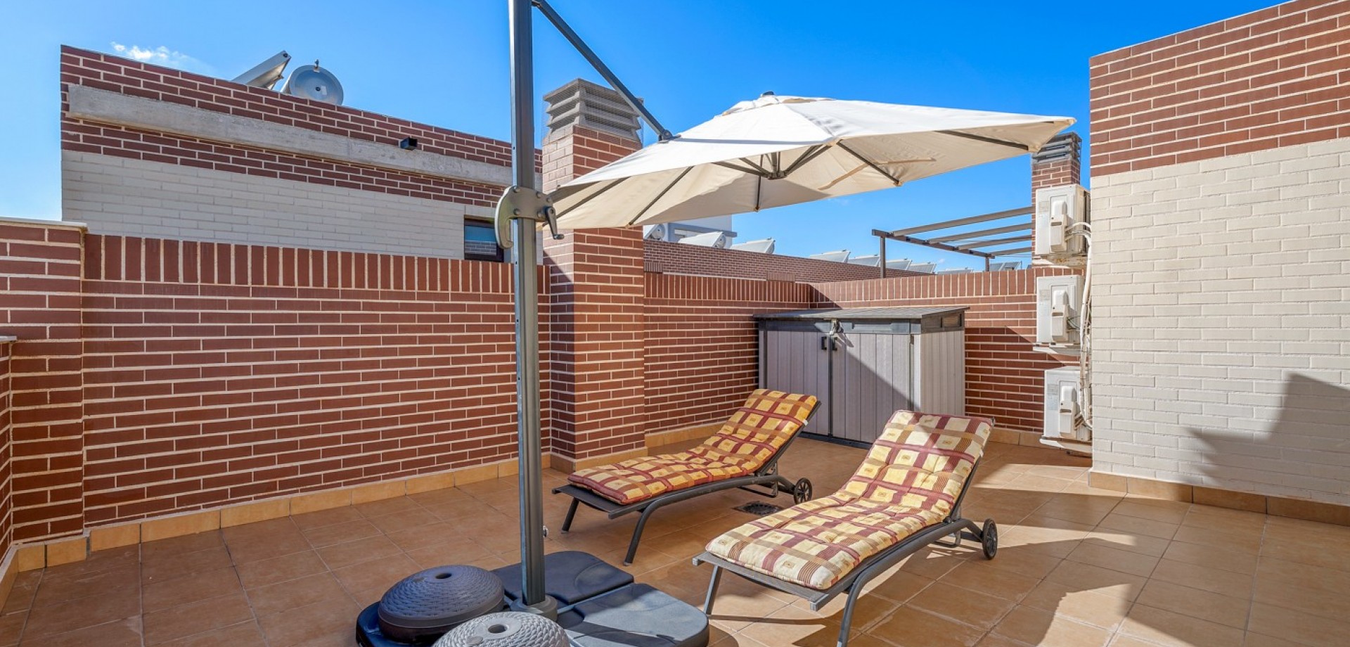 3-Bedroom Duplex Apartment with 2 Bathrooms and Private Roof Terrace We are pleased to present a highly attractive duplex apartment with a total of 53 m2 terraces, in a modern residential complex built in 2015. This is considered the best-located unit within the community, offering open views over the park, excellent sun exposure throughout the day, and complete privacy. The apartment is situated on the second floor and features a practical and well-designed layout. On the main level, you will find a bright living room with direct access to a spacious terrace enjoying both morning and afternoon sun, along with a kitchen, bathroom, and two bedrooms. A staircase from the living room leads to the upper level, which comprises a large master bedroom with fitted wardrobes, a full bathroom with washing machine, and direct access to a private roof terrace. The solarium benefits from all-day sun and open park views – the perfect retreat when you want a more private space. The complex itself offers excellent communal facilities including a gym, sauna, jacuzzi, and a large swimming pool with green areas. An underground parking space is also included. The location is very convenient, with daily services within walking distance. Just 550 metres away there is a modern centre with restaurants, a supermarket and a rooftop lounge bar. In addition, the well-known La Zenia Boulevard shopping centre is close by, offering a wide range of shops, dining options and leisure activities. Several golf courses can be reached within a short drive, while the beaches of Campoamor and Cabo Roig are easily accessible by bike in around 15 minutes. In summary: A property with the best internal location in the complex, a private roof terrace, all-day sun and modern on-site facilities. A smart choice both for personal use and rental investment. Highlights – Calle Cabo Prior 4, Orihuela Costa Best internal location in the complex – sunny, private & park views Duplex with 3 bedrooms / 2 bathrooms Main terrace + private roof terrace with all-day sun. 53m2 terraces! Modern complex (2015) with pool, gym, sauna & jacuzzi Underground parking included Walking distance to shops, restaurants & La Zenia Boulevard Short drive to golf & beaches