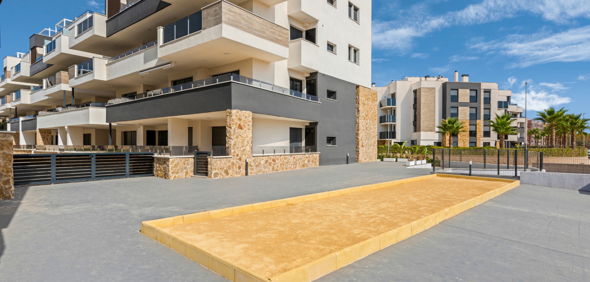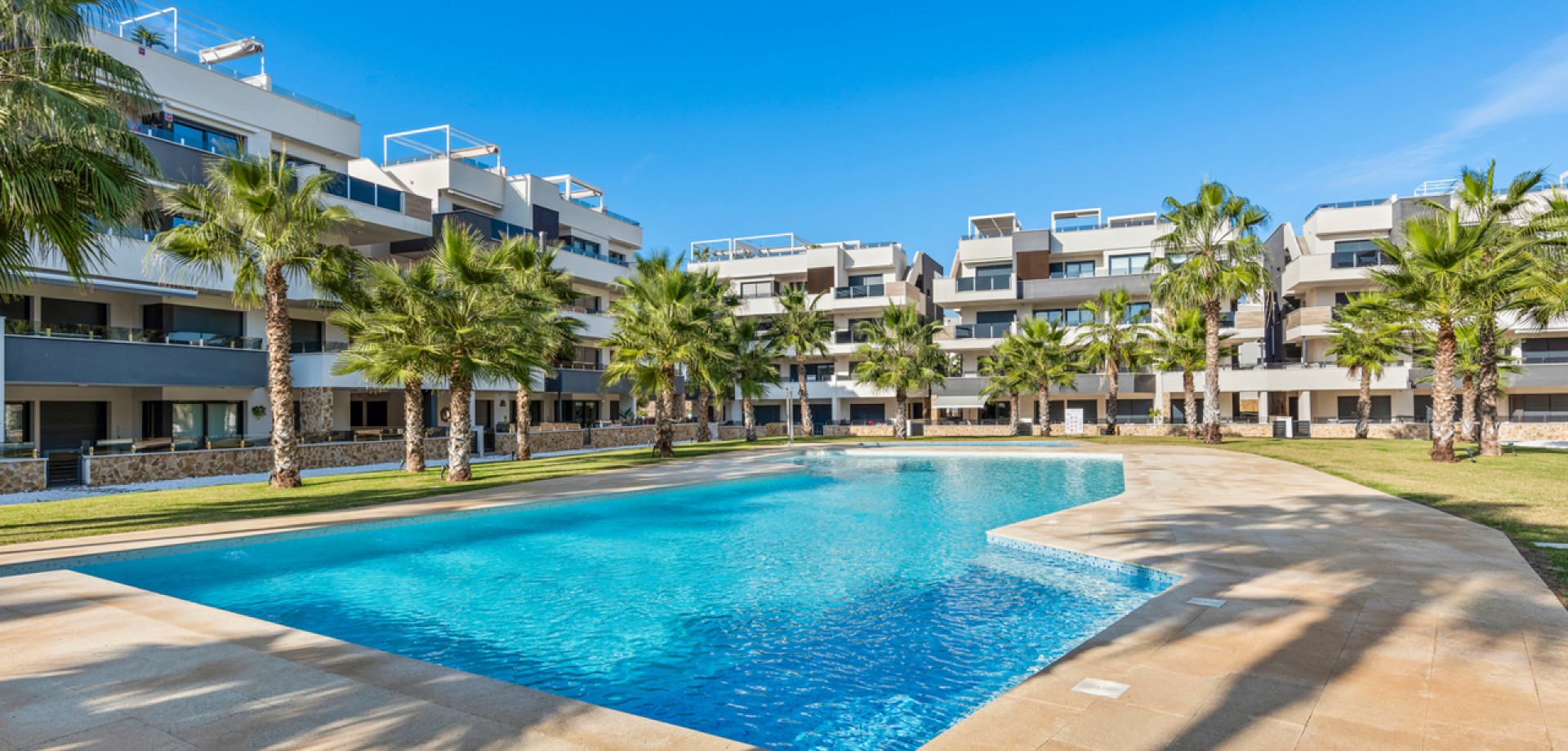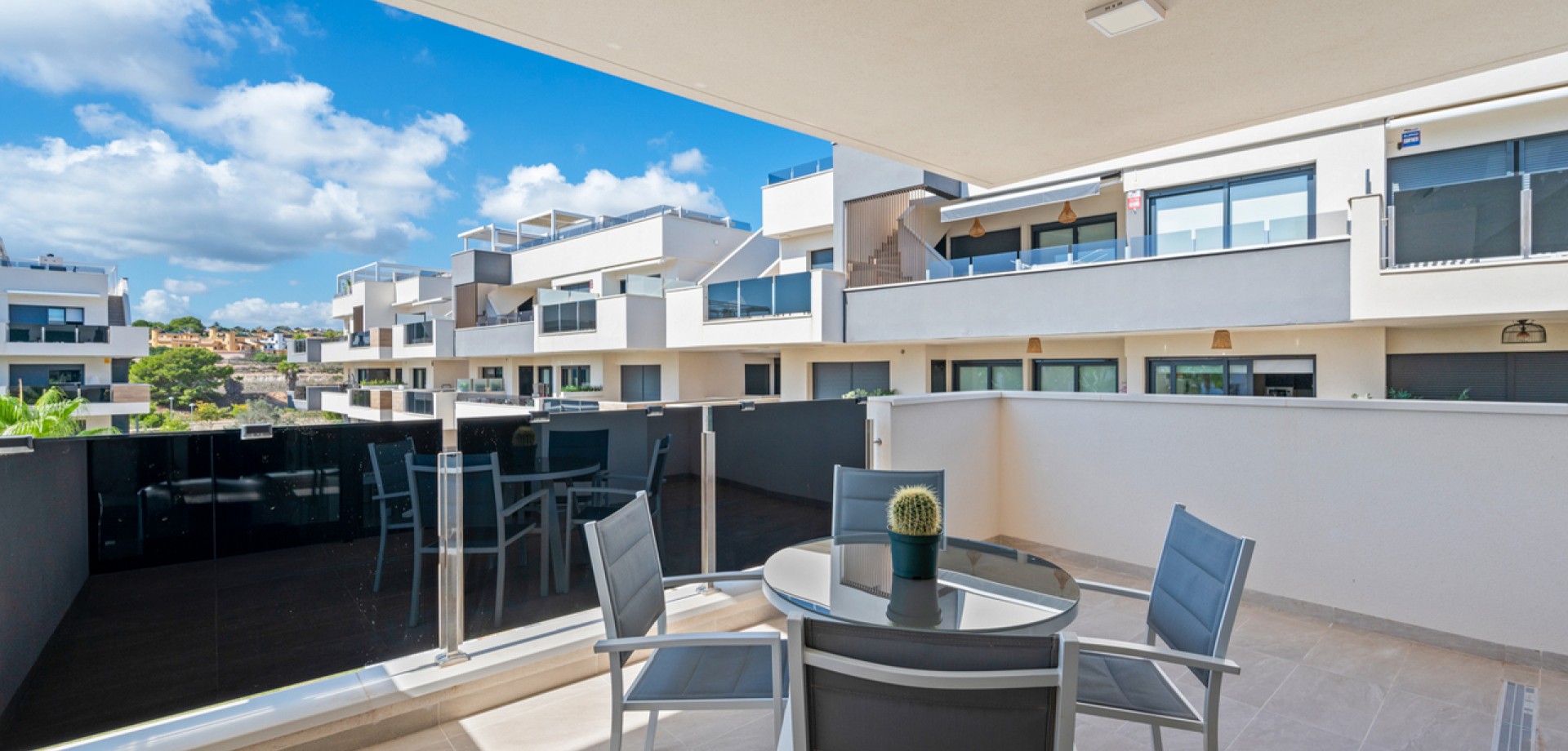 This modern luxury second floor corner apartment with 2 bedrooms and large private terrace is situated in the very sought after area of Villamartin, Alicante (Orihuela Costa) The property will be sold fully furnished and consists of a spacious lounge/dining room area, a modern open plan fully equipped kitchen, two bedrooms with fitted wardrobes, two bathrooms (one is en-suite), patio doors from the lounge also lead out onto a private terrace to enjoy the Spanish sun all day. Parking space and storage room in the underground garage is included in the price as well. All residents of this development have use of the indoor gym and the Spa & Wellness area, a very beautiful landscaped communal garden with swimming pool and jacuzzi, children’s playground. Set in a great location with stunning views, you are only a few minutes walk away from the famous Villamartin Plaza with local restaurants, bars and shops to cater for all tastes and needs. The fantastic sandy beach of La Zenia is only a 10 minute drive away.