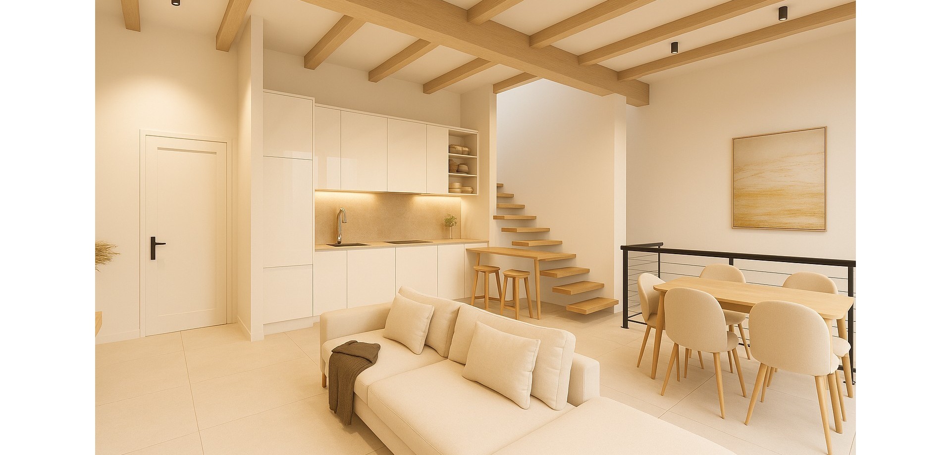 Costa Blanca Eiendom presents this elegant apartment with an independent entrance, currently under full renovation and reconstruction, located in the charming San Antón neighborhood of Alicante — one of the city’s most authentic and up-and-coming areas. The property is being completely refurbished, including plumbing, electrical systems, and interior finishes, and will feature top-quality furnishings and materials, ensuring a modern, efficient, and long-lasting home. The renders shown are indicative of the project’s final appearance once the renovation is completed. Upon entering the property, a private staircase leads to the main level, where you’ll find a bright two-bedroom, two-bathroom apartment designed in a contemporary style with natural materials. The main area offers an open-plan living-dining-kitchen space of over 30 m², bright and welcoming, with access to a small balcony. The master bedroom, directly accessible from the living room, includes an ensuite bathroom and access to a private terrace — perfect for enjoying the tranquility of the surroundings. Behind the staircase, there is a second bedroom, also with an ensuite bathroom, ideal for guests or as an additional room. Its privileged location in San Antón offers a vibrant and comfortable urban lifestyle: just a few steps from the Central Market, Santa Bárbara Castle, and Postiguet Beach, as well as excellent access to public transport, shops, restaurants, and all essential services. This apartment represents a unique opportunity for those seeking an exclusive, modern home full of character in the heart of Alicante. Contact us for more information, or join one of our no-obligation tours to visit this wonderful project.
