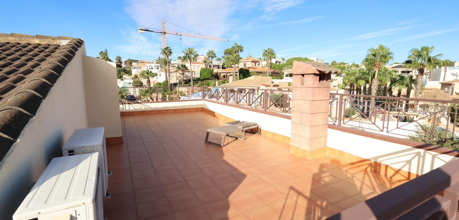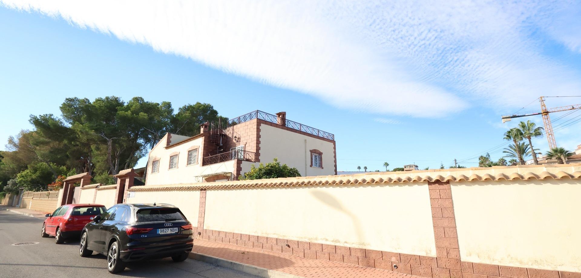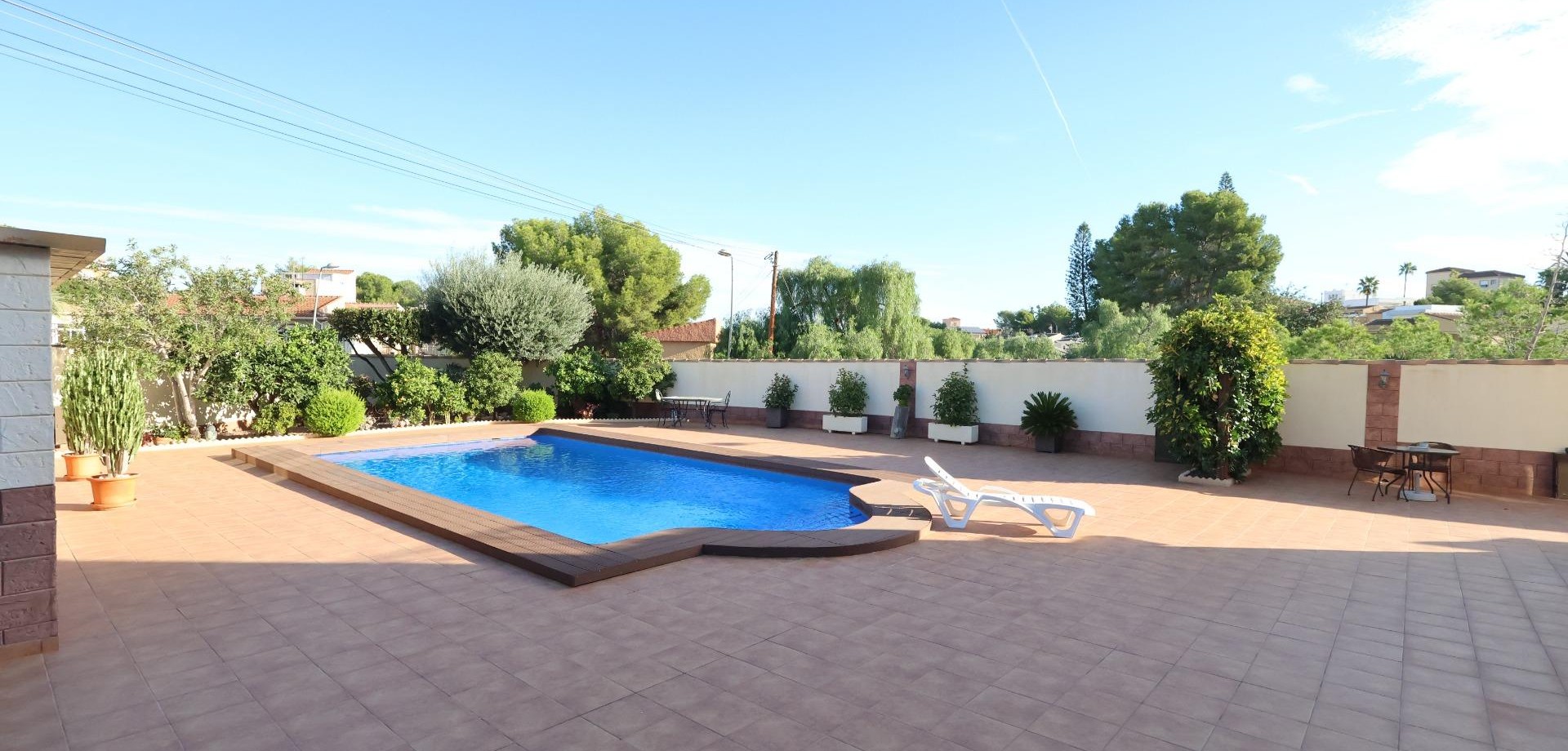 Los Balcones. Impressive detached villa on a corner plot, facing a park and just steps from the tennis club.. . Set on a generous 800 m2 plot, this property stands out for its privacy, space, and comfort. The main house, distributed over two floors with a built area of 311 m2, features:. . • 5 bedrooms and 3 bathrooms. • Spacious living-dining room with fireplace. • Large fully equipped independent kitchen. • Solarium with open views. • Enclosed barbecue area. • Private pool and driveway for several vehicles. . Additionally, it includes a separate guest house, ideal for visitors or rental purposes, offering 1 bedroom, bathroom, living room, and kitchen.. . The property is sold furnished and equipped with air conditioning, making it the perfect choice for large families or as an investment close to all amenities.
