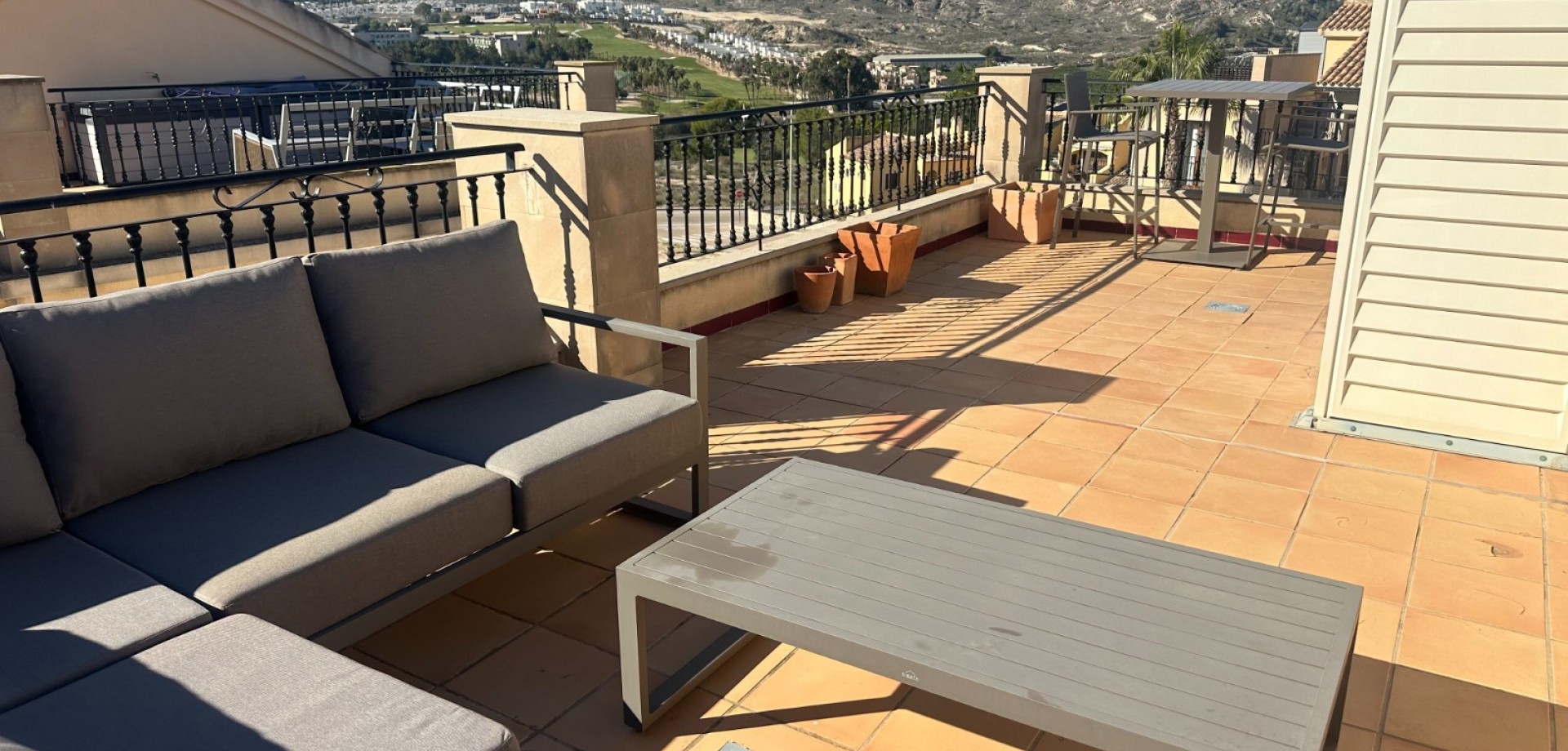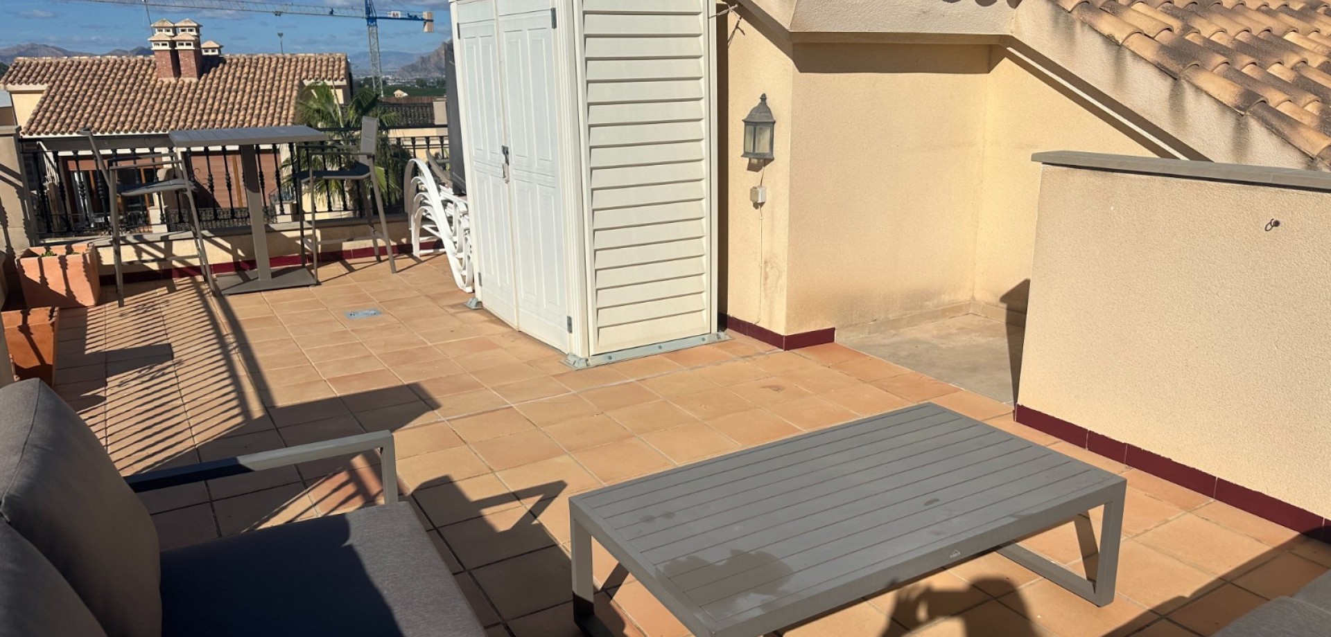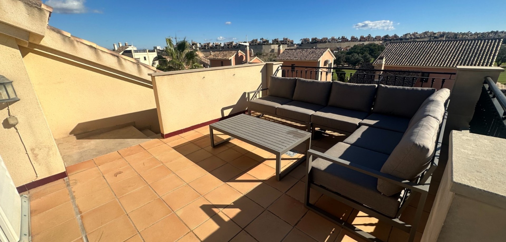 New listing !This superb top-floor 2-bedroom, 2-bathroom apartment in the sought-after La Finca Golf resort, Algorfa offers stylish living with impressive views. The home features a bright open-plan living and dining area, enhanced by a striking vaulted ceiling that creates a spacious, airy feel. From the living room, doors open onto a private terrace overlooking the communal pool, perfect for relaxing or dining outside. The master bedroom boasts its own en-suite bathroom, while the second bedroom is generously sized with access to the family bathroom. A standout feature is the private rooftop solarium, ideal for sunbathing or entertaining while enjoying panoramic mountain views. The property is sold fully furnished and includes air conditioning, making it ready to move into or rent out immediately. A fantastic opportunity in a prime golf-side location.