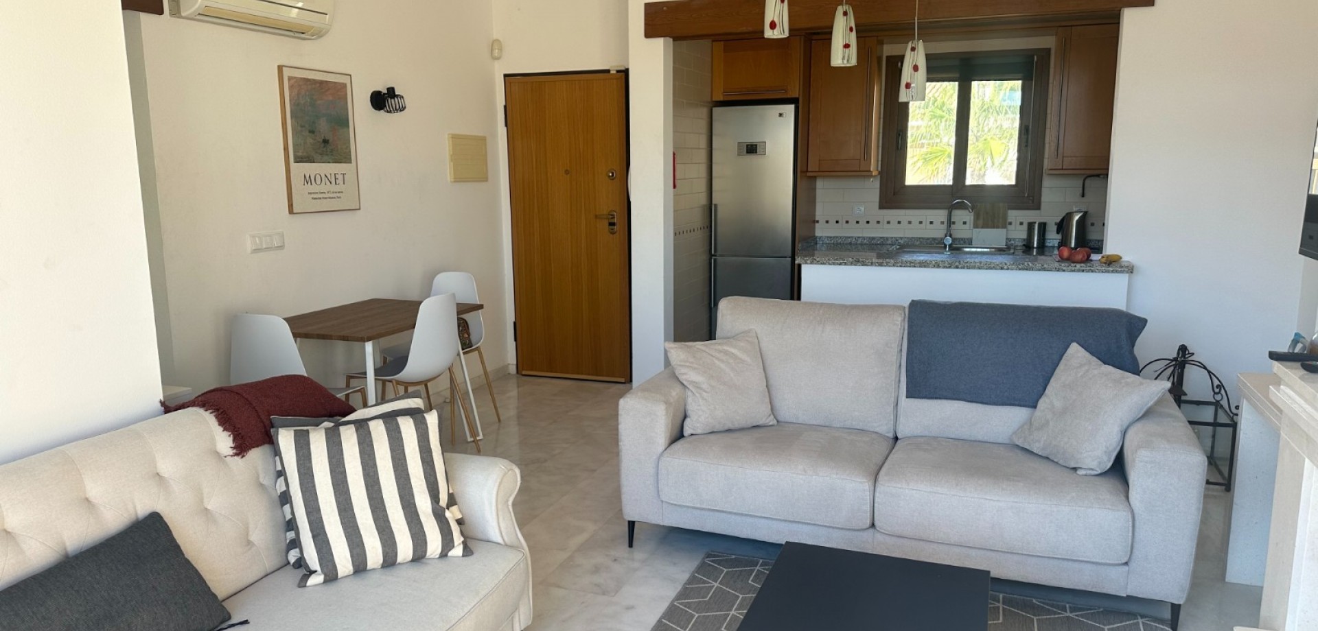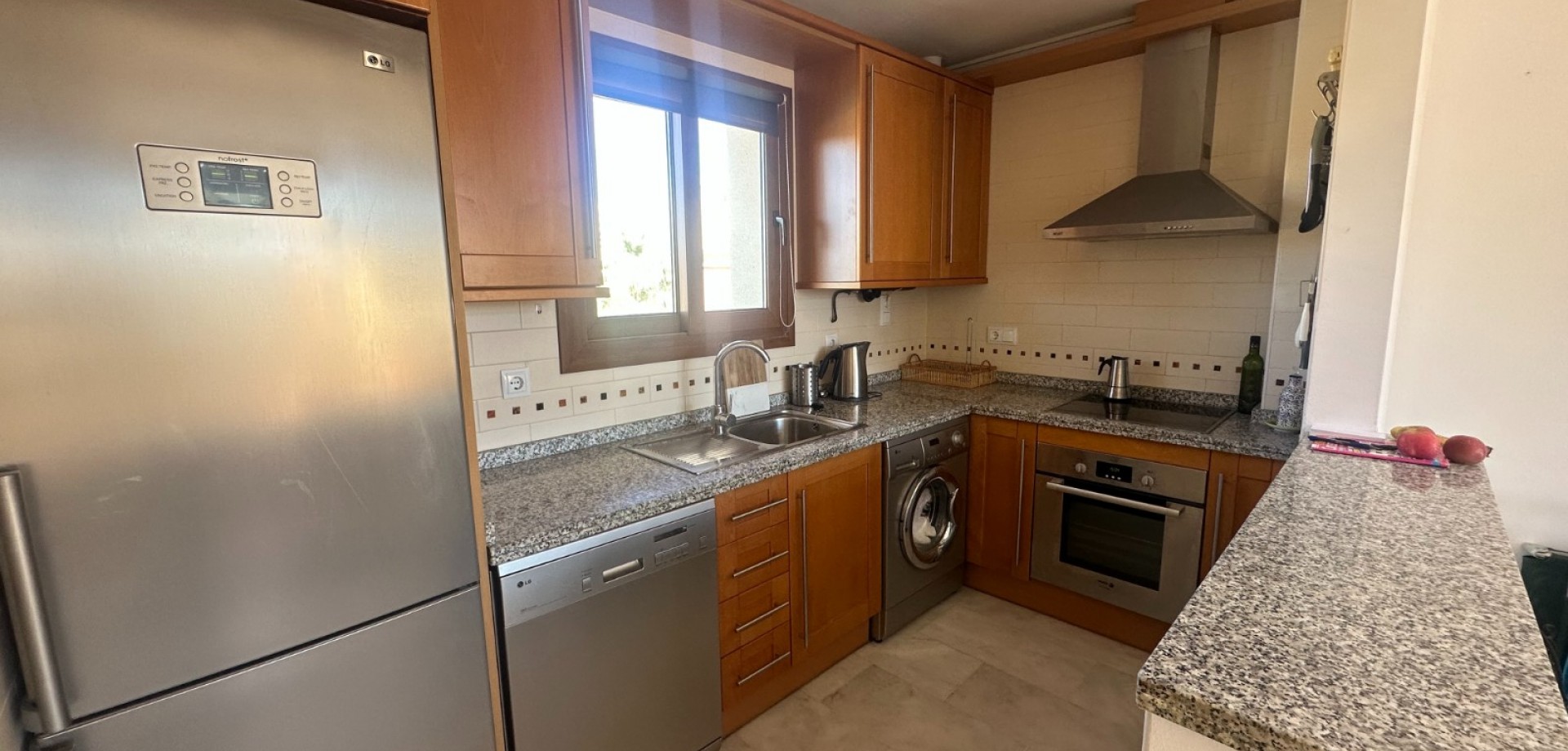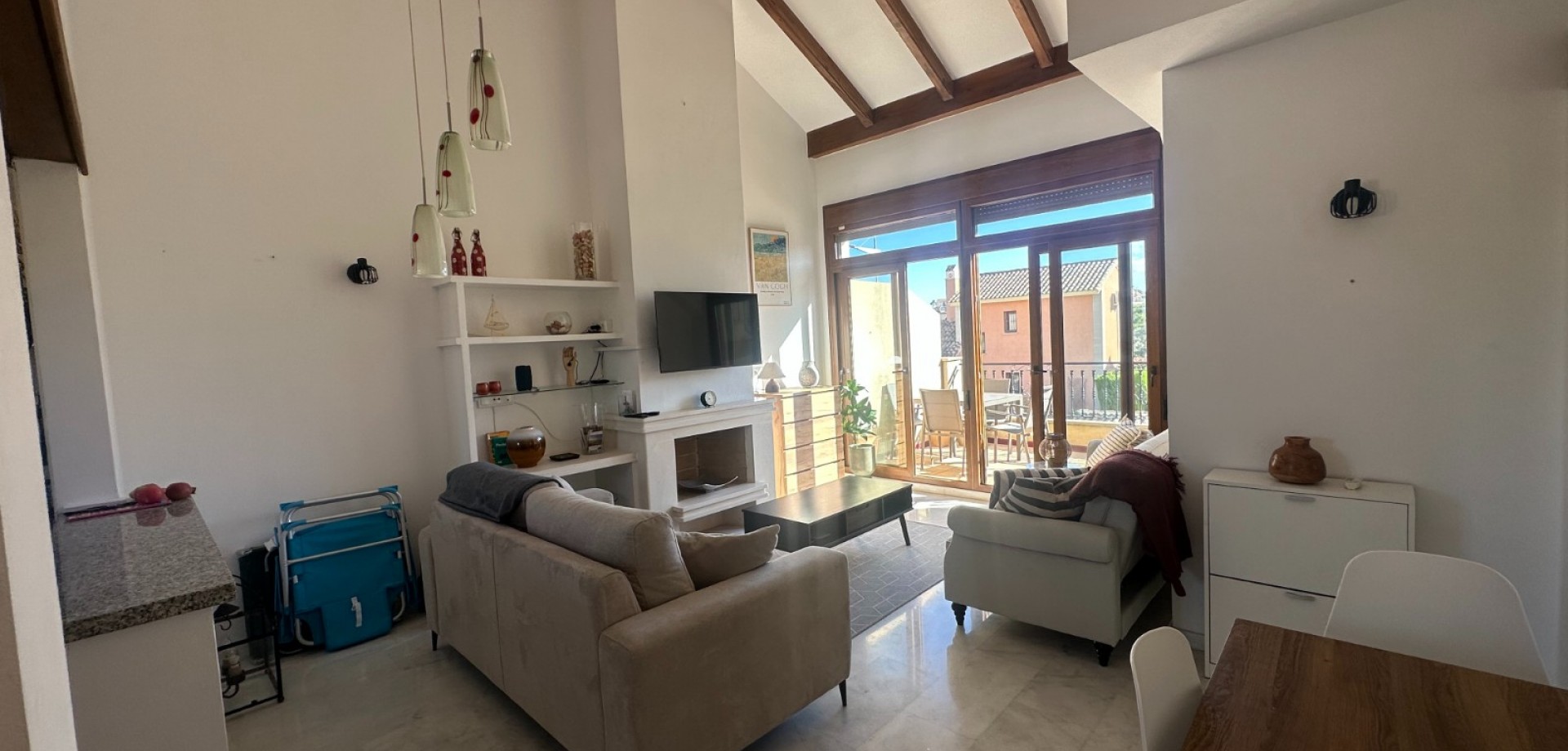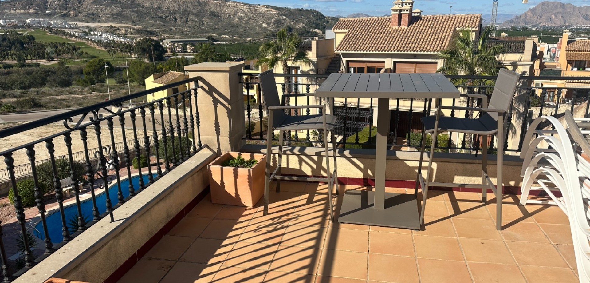 New listing !This superb top-floor 2-bedroom, 2-bathroom apartment in the sought-after La Finca Golf resort, Algorfa offers stylish living with impressive views. The home features a bright open-plan living and dining area, enhanced by a striking vaulted ceiling that creates a spacious, airy feel. From the living room, doors open onto a private terrace overlooking the communal pool, perfect for relaxing or dining outside. The master bedroom boasts its own en-suite bathroom, while the second bedroom is generously sized with access to the family bathroom. A standout feature is the private rooftop solarium, ideal for sunbathing or entertaining while enjoying panoramic mountain views. The property is sold fully furnished and includes air conditioning, making it ready to move into or rent out immediately. A fantastic opportunity in a prime golf-side location.