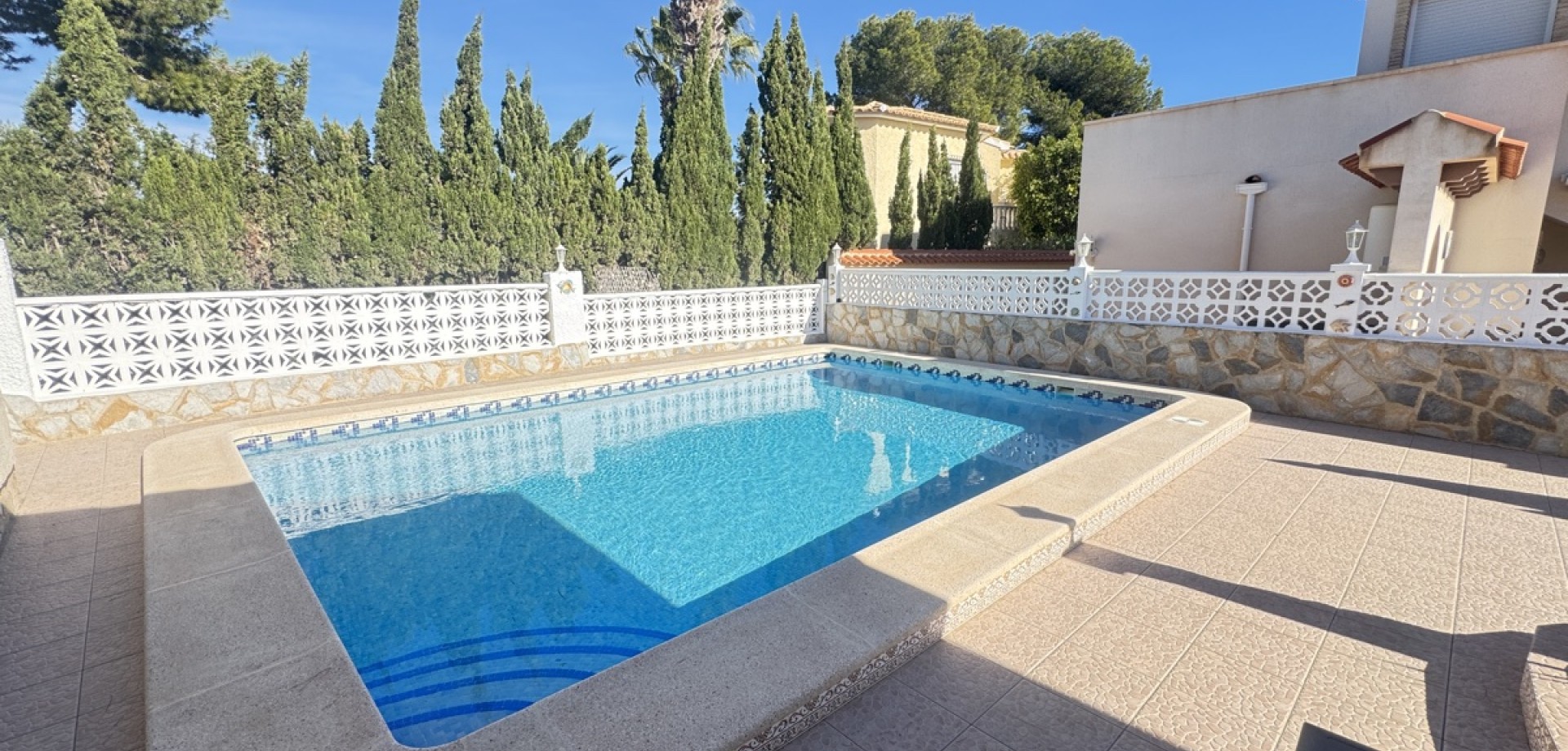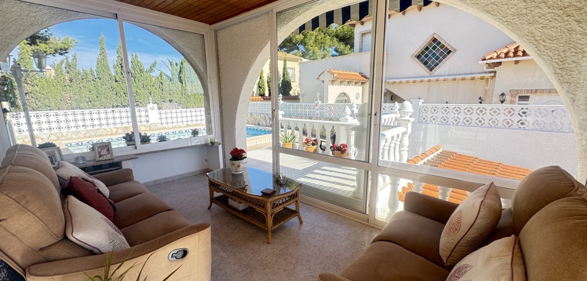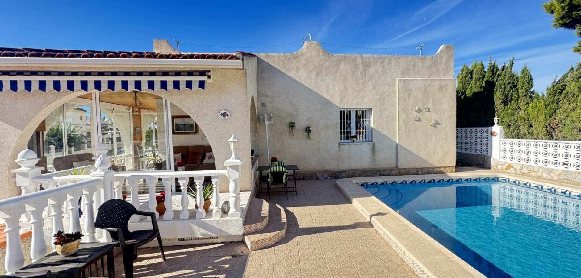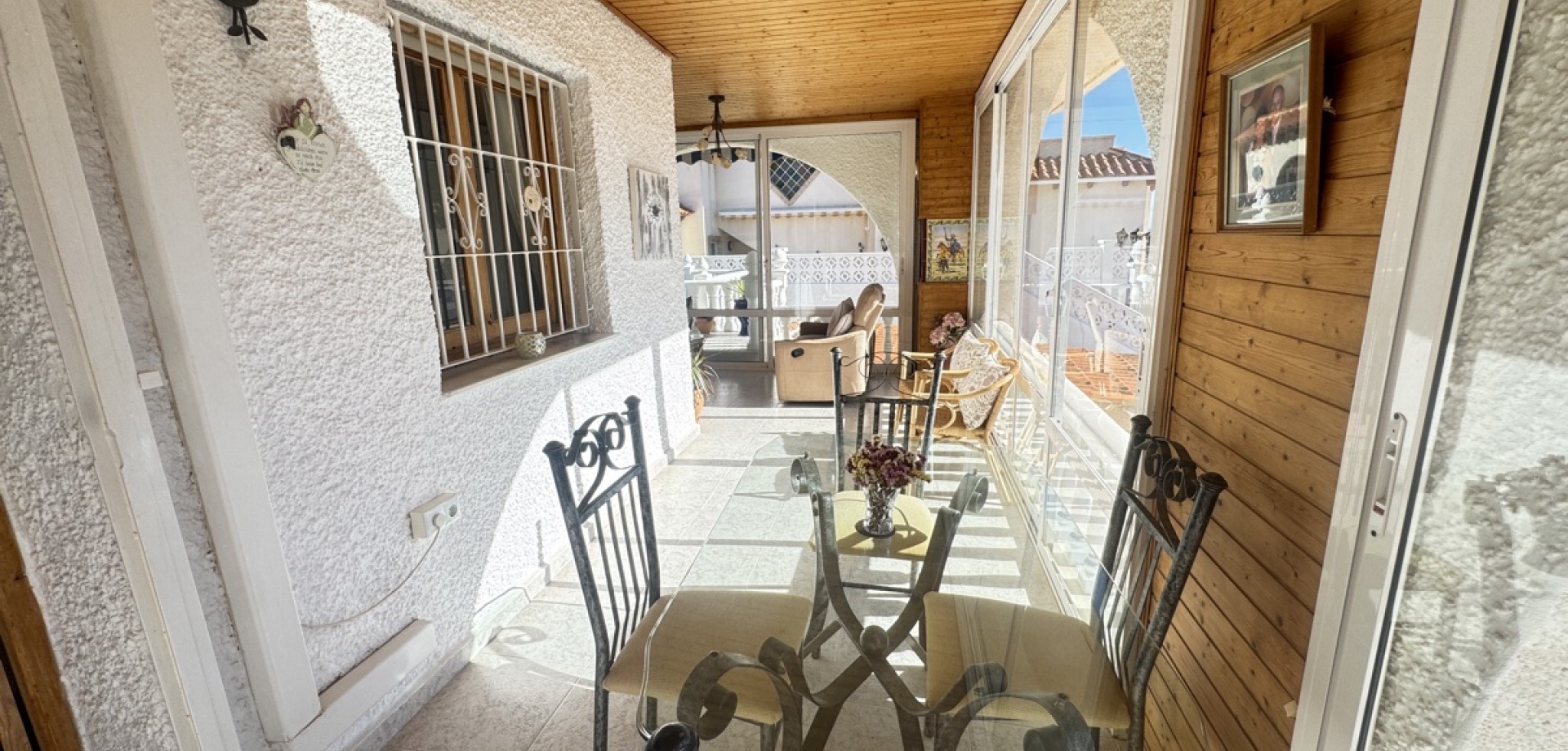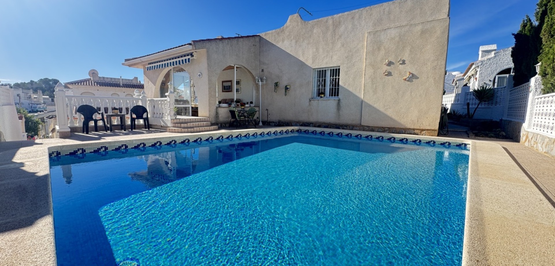Stunning detached villa with private pool, located in the sought-after Blue Lagoon area of Orihuela Costa. This beautifully presented property boasts breathtaking views of the Torrevieja coastline and Orihuela mountains. Main Floor: - 2 spacious bedrooms with en-suite bathrooms - Large lounge with open-plan kitchen - Wrap-around glazed terrace with seating areas, perfect for alfresco dining and relaxation - Natural piped gas central heating and gas boiler Downstairs: - Self-contained 1-bedroom apartment with bathroom - Various store rooms and covered outdoor kitchen area Additional Features: - Large rooftop solarium with stunning views - Private pool - 2 outside storage cupboards Ideal Location: - Blue Lagoon is a tranquil and exclusive area, known for its beautiful beaches and crystal-clear waters - Close proximity to golf courses, sports facilities, and scenic walking routes - Easy access to the main road, with links to nearby towns and cities A Rare Find: This lovely villa offers a perfect blend of comfort, convenience, and relaxation. Don't miss the opportunity to make it your home or holiday retreat! Viewing Recommended: Contact us to arrange a viewing and make this stunning villa your own.
