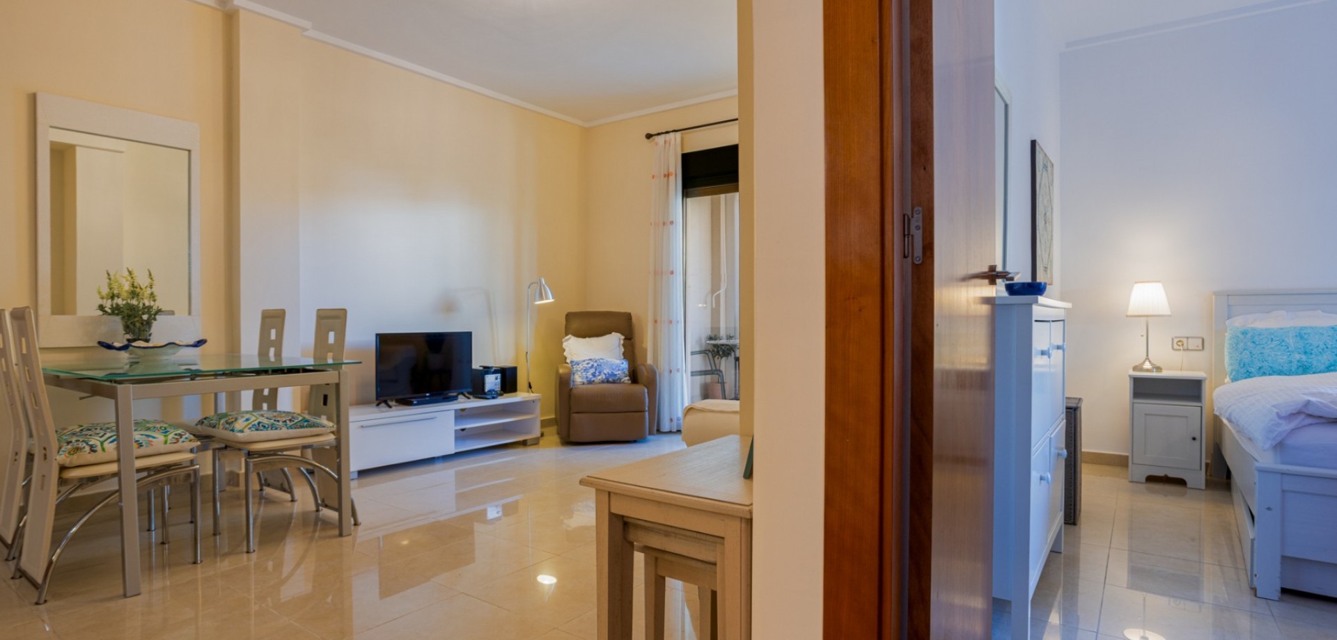 Ground floor apartment with garden and communal pool in Ciudad Quesada We present this charming ground-floor apartment, located in one of the most sought-after residential areas of Doña Pepa, in the municipality of Rojales. A perfect home for those seeking comfort, Mediterranean style, and proximity to all amenities. With a built area of 84 m², this property boasts a practical and bright layout. Upon entering the apartment, you'll find a spacious covered porch, ideal for enjoying the warm Costa Blanca climate year-round. The living area comprises a cozy living/dining room with an open-plan kitchen, fully equipped with modern appliances, creating a functional and comfortable space for daily use. The apartment features two spacious bedrooms, both with fitted wardrobes, and a fully equipped bathroom with tasteful finishes. The property is in excellent condition, ready to move into, and comes fully furnished, including all electrical appliances in the kitchen and air conditioning, for optimal comfort year-round. The terrace off the living room is equipped with vertical toldos (awnings), which provide shade in the summer and additional warmth in the cooler months. Outside, the property boasts a private garden, perfect for relaxing, sunbathing, or dining al fresco. There's also a private parking space right outside the gate. There's access to not one, but three beautiful communal swimming pools, surrounded by well-maintained green areas, perfect for relaxing and enjoying the surroundings. Unbeatable location: The property is located just 12 minutes from the beaches of Guardamar and Torrevieja, 40 minutes from Alicante airport, 5 minutes from leisure areas, restaurants and supermarkets, and 7 minutes from La Marquesa golf course, one of the most renowned in the region. This property is an excellent option for both permanent residence and holiday home, or even a great investment opportunity thanks to the high demand for holiday rentals.