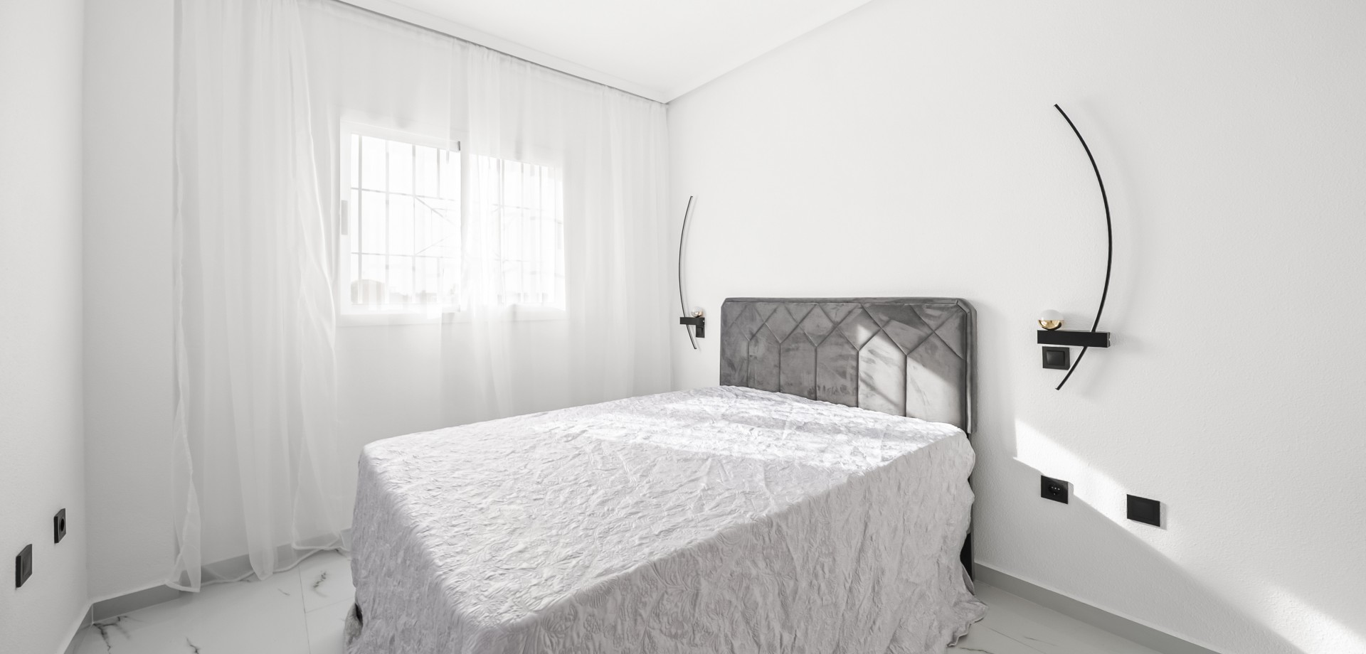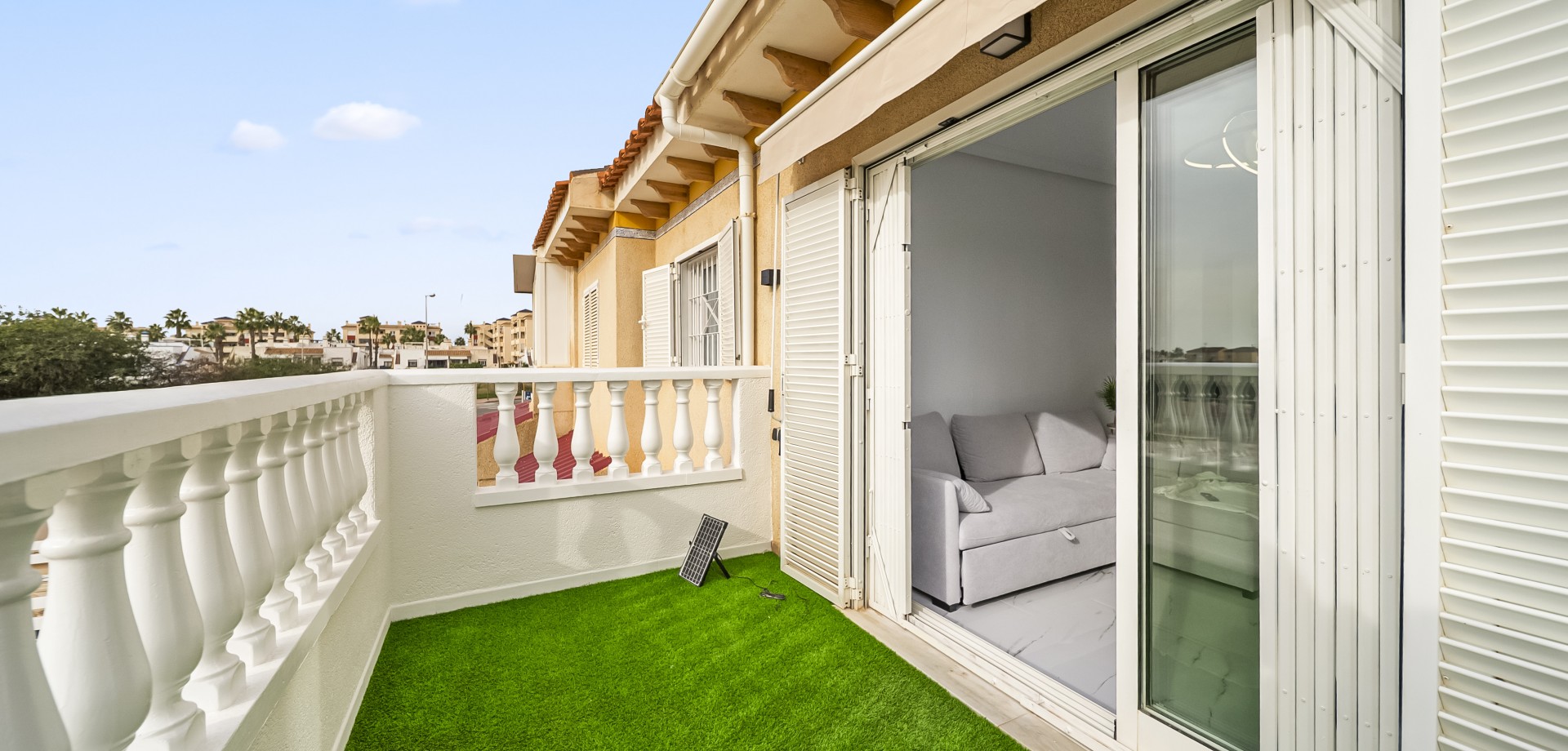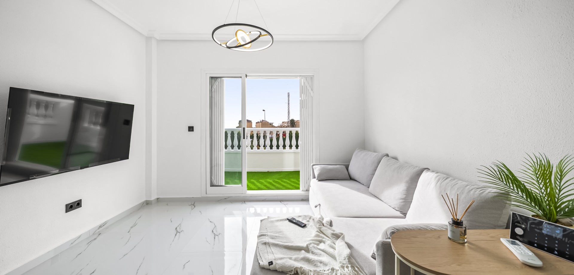 Renovated apartment with sunny terrace and sea views in Zeniamar. Fully renovated in 2025, this apartment is located on the first floor (no lift) in the Zeniamar residential complex, Playa Flamenca. It features 1 bedroom, 1 bathroom, an open-plan kitchen, and a southeast-facing terrace with sea views. Sold furnished, with storage room and access to a communal pool. Key features 1 bedroom 1 bathroom 52 m² built Open-plan kitchen Terrace with sea views First floor (no lift) Storage room Furnished Communal pool Southeast orientation Year of construction: 2001 Renovated in 2025 Annual costs IBI: €125 Community fees: €364 Location Close to all services Just minutes from supermarkets, padel courts, La Zenia Boulevard, and restaurants