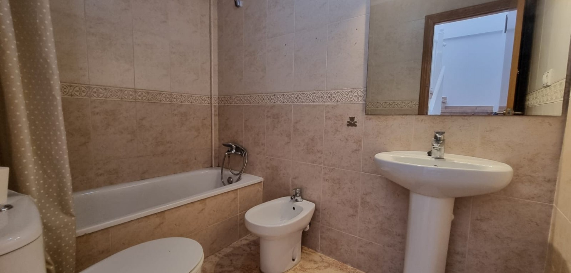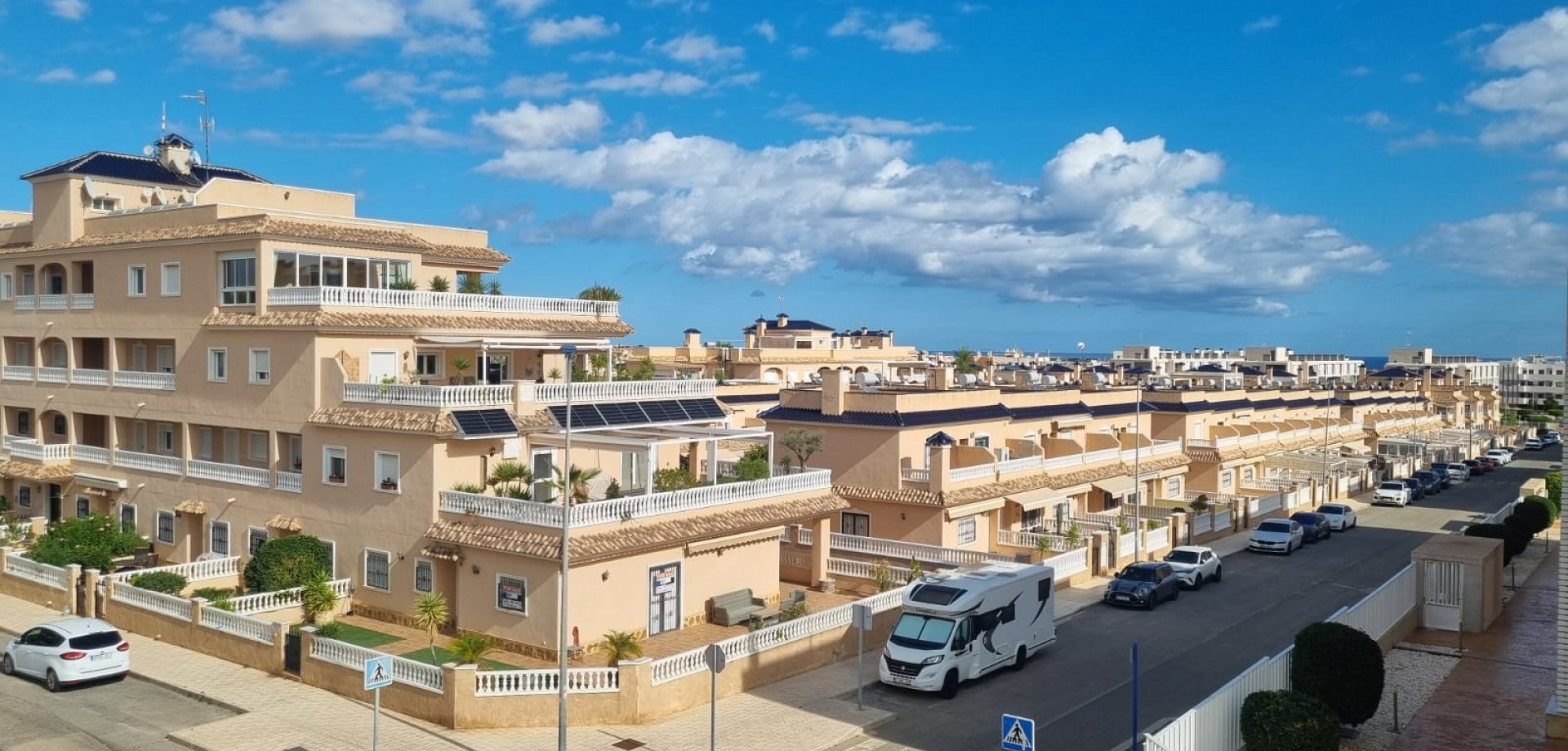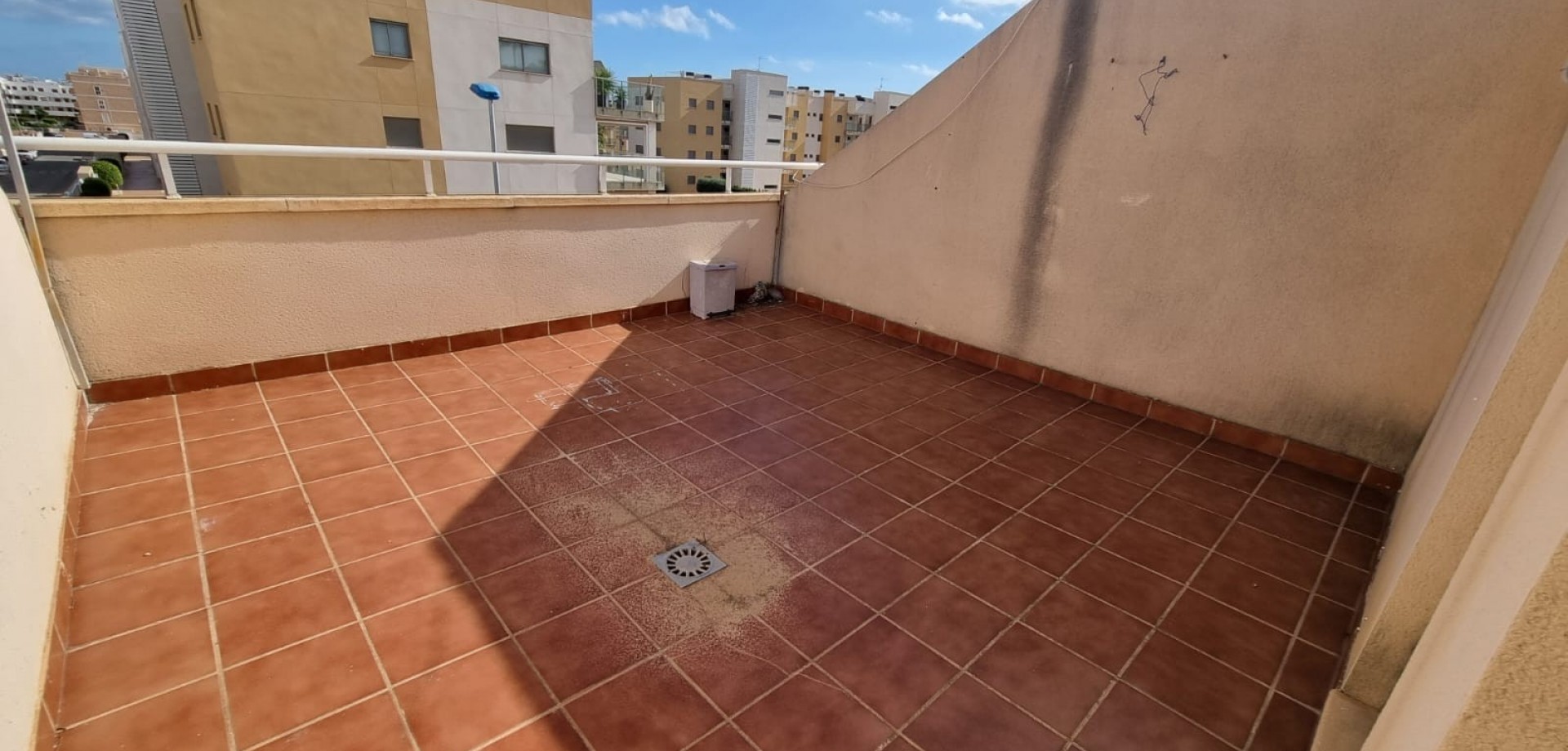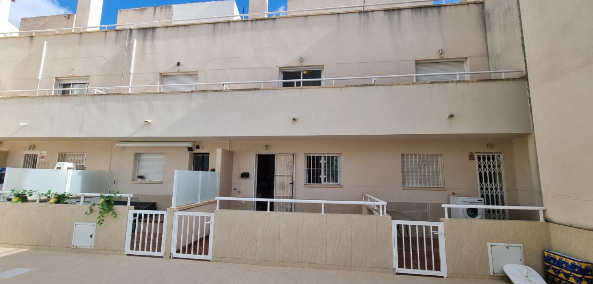 Charming 3-Bedroom Townhouse in Los Dolses – South-Facing & Move-In Ready! This charming south-facing townhouse in C/ Cilantro (Los Dolses) is the perfect home for anyone looking for comfort, natural light, and a true Mediterranean feel. On the ground floor, you’ll find a bright living and dining area, a semi-open kitchen with access to the rear terrace, and a convenient guest toilet. At the front of the property there is a spacious 25 m² terrace with room for parking. The first floor offers two bedrooms: the master bedroom features an en-suite bathroom and walk-in wardrobe, while the second bedroom has its own terrace overlooking the communal pool. Two modern bathrooms are also located on this level. The second floor leads to a beautiful private 35 m² solarium, ideal for sunbathing, relaxing, or enjoying outdoor dining. The property is part of a well-maintained residential complex with a communal swimming pool and has a total built area of 90 m². The annual IBI is €191.33 and the community fee is €620. This home is ready to move into and perfect for permanent living, holidays, or investment.