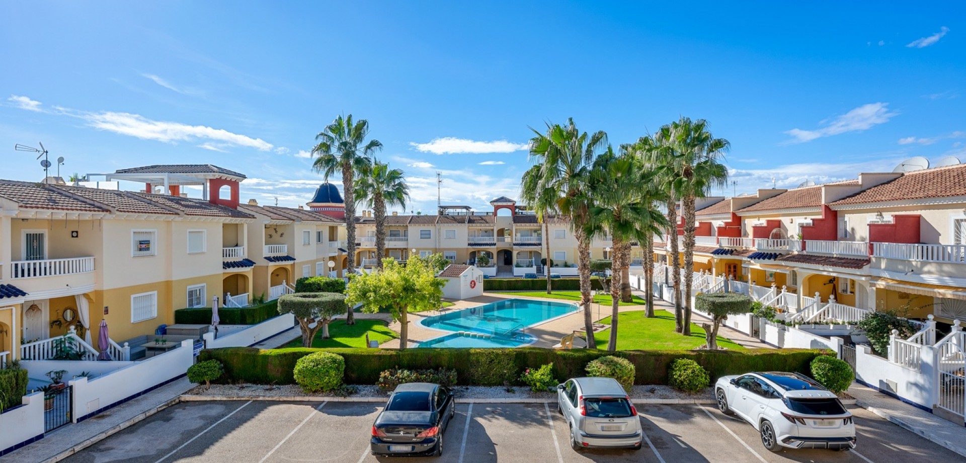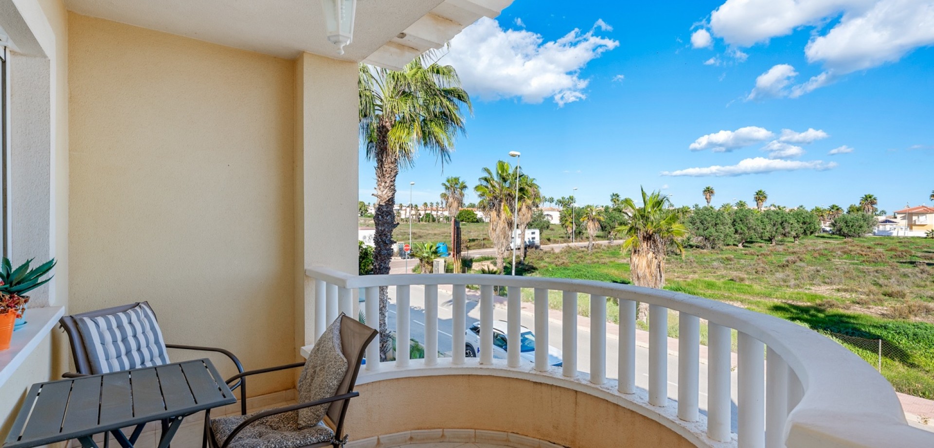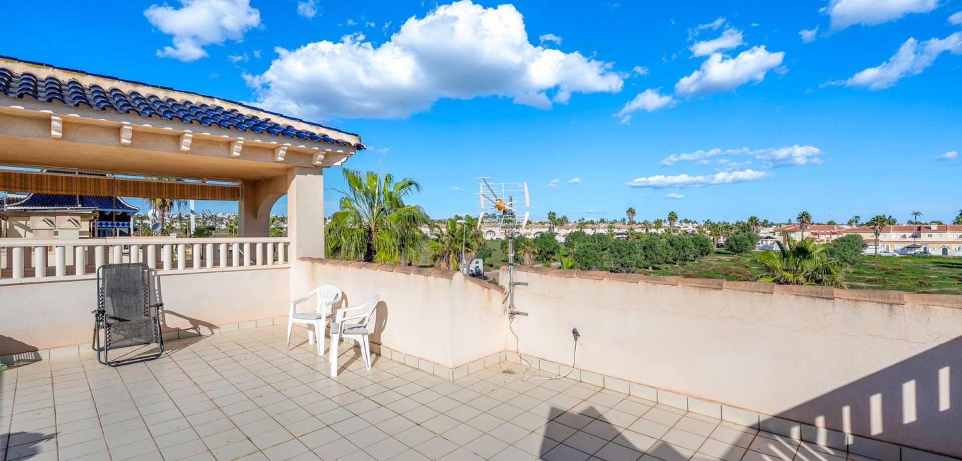 Spacious 2 bedroom top floor apartment in Ciudad Quesada. The apartment has a living area of 87 m2 and consists of 2 double bedrooms and 2 bathrooms, where one of the bathrooms is en-suite connected to the master bedroom. One bathroom has a shower and the other has a bathtub. Both bedrooms have fitted wardrobes. The apartment also consists of a spacious living and dining room, and an open plan kitchen. From the living room there is direct access to a covered terrace. Outdoor areaThe apartment has an east facing terrace with space for a small seating area. The apartment also has access to private use of a roof terrace. Here you have a lot of space for outdoor seating areas. The apartment is part of a residential complex where you can find a lovely swimming pool and parking spaces.