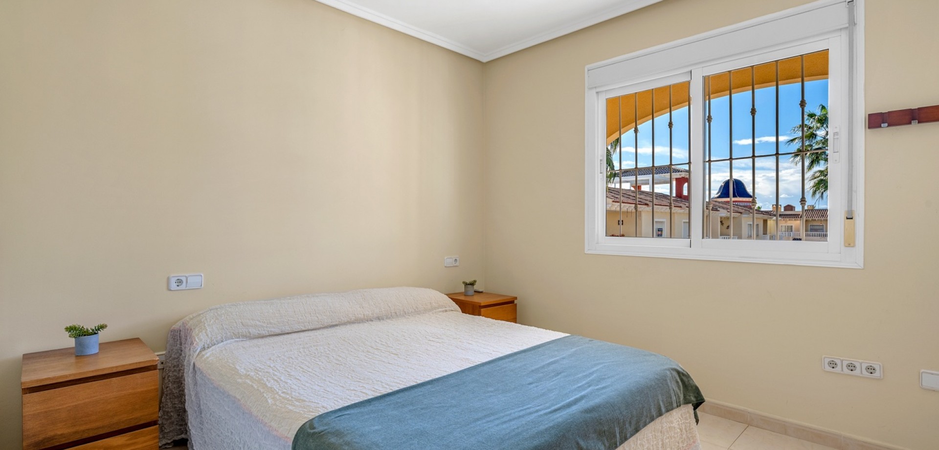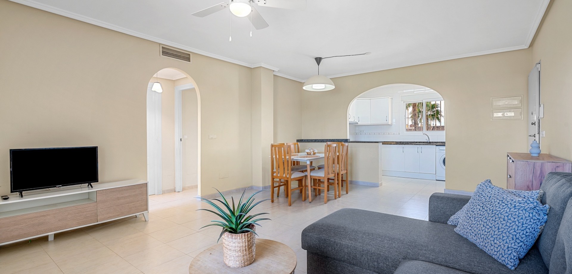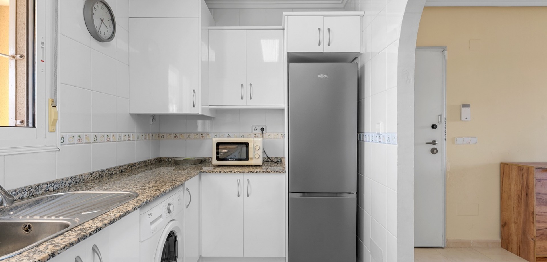 Spacious 2 bedroom top floor apartment in Ciudad Quesada. The apartment has a living area of 87 m2 and consists of 2 double bedrooms and 2 bathrooms, where one of the bathrooms is en-suite connected to the master bedroom. One bathroom has a shower and the other has a bathtub. Both bedrooms have fitted wardrobes. The apartment also consists of a spacious living and dining room, and an open plan kitchen. From the living room there is direct access to a covered terrace. Outdoor areaThe apartment has an east facing terrace with space for a small seating area. The apartment also has access to private use of a roof terrace. Here you have a lot of space for outdoor seating areas. The apartment is part of a residential complex where you can find a lovely swimming pool and parking spaces.