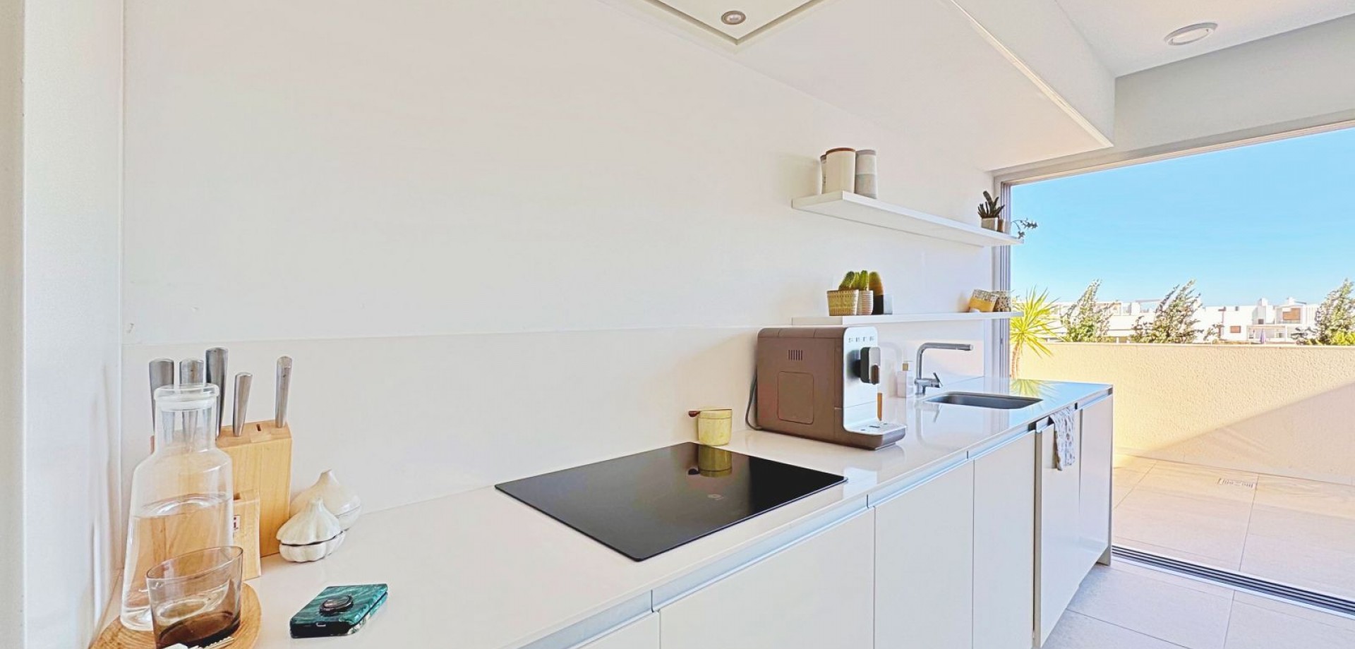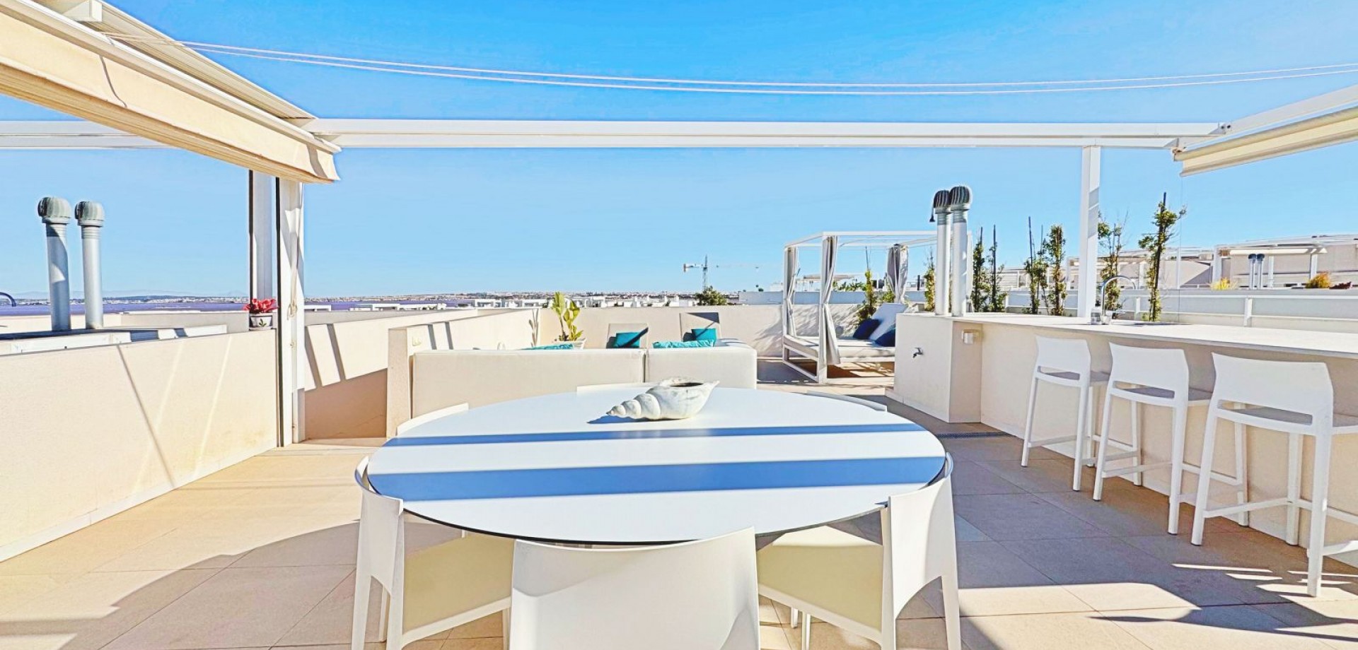 This exclusive penthouse in Mirasal, located in the prestigious Los Balcones area of Torrevieja, stands out for its contemporary design, exceptional brightness and privileged position at the highest point of the residential complex. Thanks to this elevated location, the property enjoys panoramic views over Torrevieja, the Mediterranean Sea and the iconic Pink Salt Lake, one of the most unique natural landscapes on the Costa Blanca. Inside, the penthouse offers a spacious and elegant atmosphere, with a modern open-plan kitchen and a bright living area connected to a generous terrace overlooking the infinity-style swimming pool and landscaped gardens. Large floor-to-ceiling windows create a seamless transition between indoor and outdoor spaces, enhancing the sense of openness and wellbeing. The highlight of the property is its spectacular private rooftop solarium, fully designed for year-round outdoor living. The space includes chill-out areas, an outdoor dining space, a bar area and pergolas, making it perfect for relaxing or entertaining guests. From here, the open views of the salt lake and the entire city of Torrevieja are simply extraordinary. Mirasal is known for its contemporary architecture, large green areas and impressive infinity-style pool. Its location in Los Balcones offers tranquillity, proximity to all services, quick access to sports facilities, supermarkets and natural surroundings, and is just a short drive from Torrevieja’s best beaches. A unique opportunity for those seeking a modern and exclusive penthouse with privileged views in one of the finest residential complexes on the Costa Blanca.