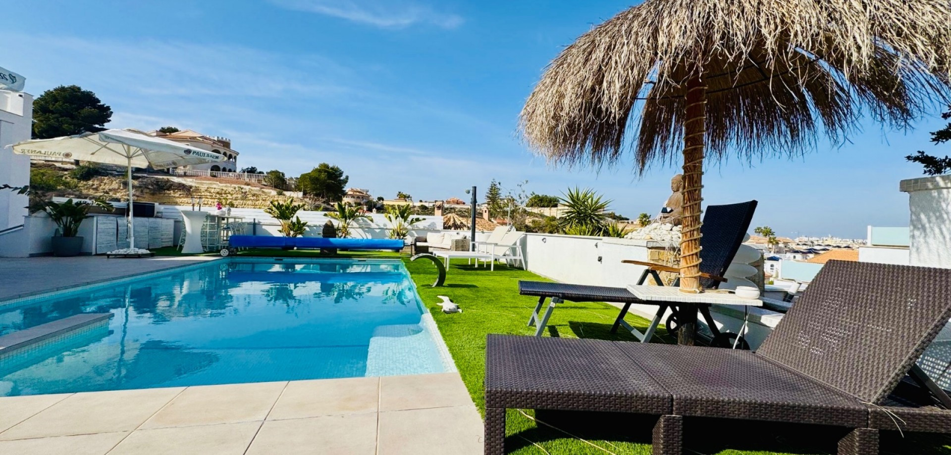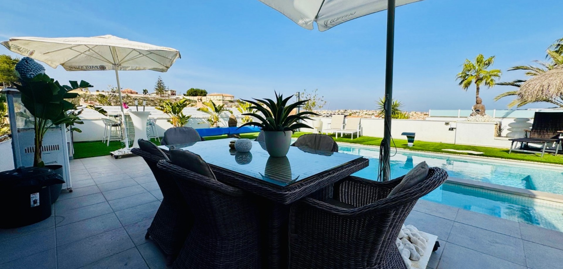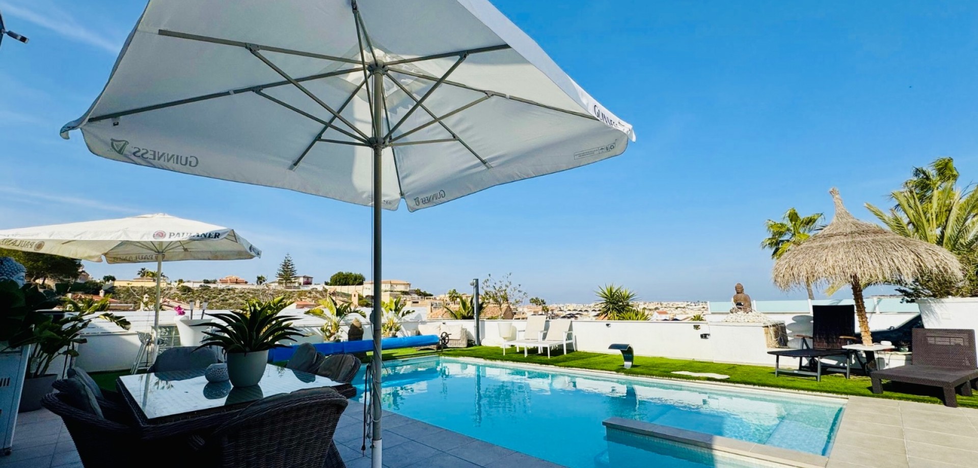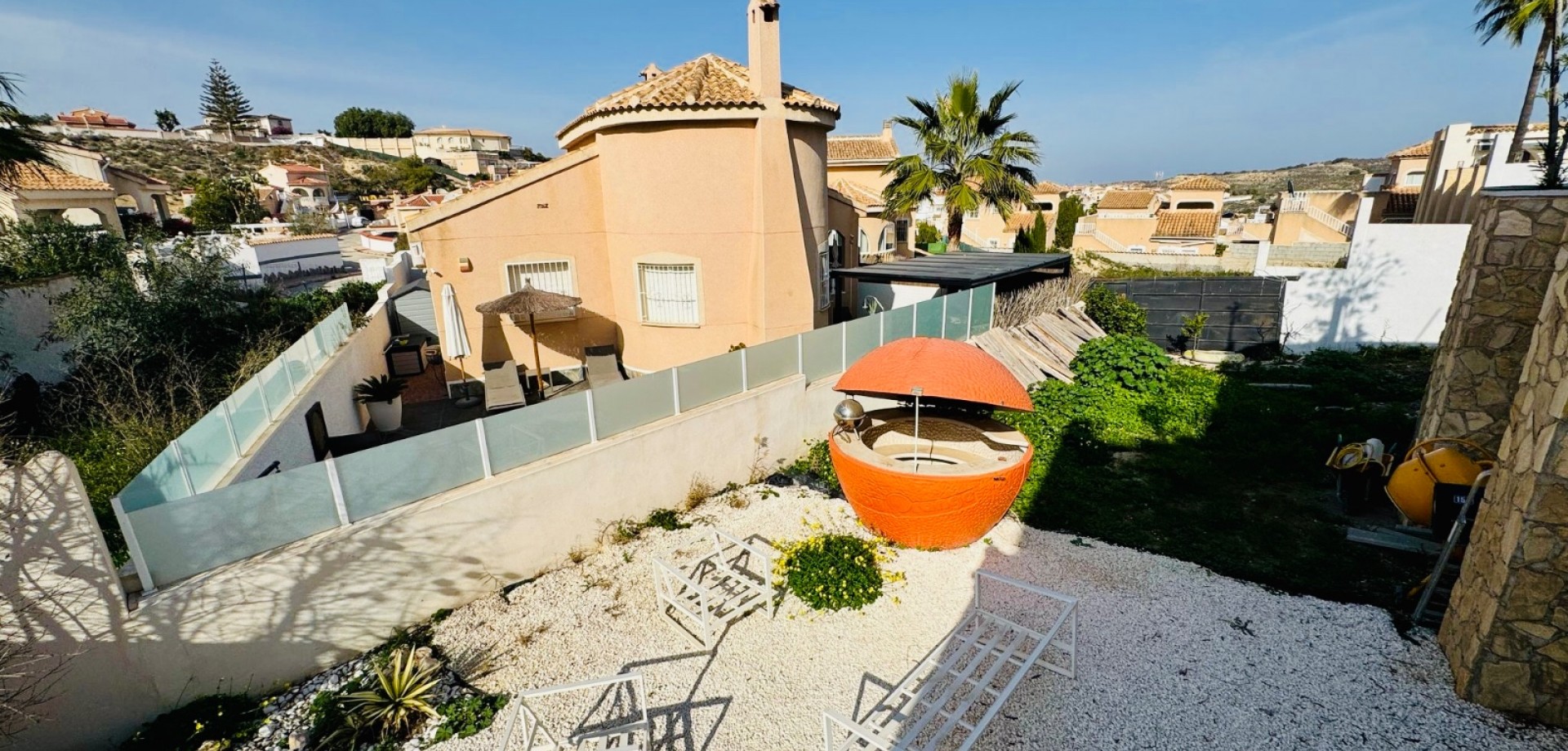 Discover this stunning 215m² premium villa, set on a 1,080m² plot in the prestigious La Marquesa Golf area. With elegant design and spacious interiors, this property offers the perfect combination of comfort, privacy, and exclusivity. Layout: Main floor: Spacious open-plan living and dining area, fully equipped kitchen, one full bathroom, one bedroom with an ensuite, and a master bedroom at the end of the hallway.Lower level: Large living space, independent kitchen, a spacious bedroom, and a full bathroom. Ideal as a separate apartment or for holiday rentals.Guest house: Located at the back of the property, featuring one bedroom and an ensuite bathroom.Second guest house/office: A separate living space with a living room, kitchen, one bedroom, and an ensuite bathroom. Outdoor Areas: Private pool with integrated jacuzziLarge 120m² solarium with panoramic viewsSpacious patio with outdoor dining areaFully landscaped garden Located in a quiet and exclusive setting, this villa is ideal as a private residence or as a high-end holiday rental investment. Contact us for more information or to arrange a viewing.