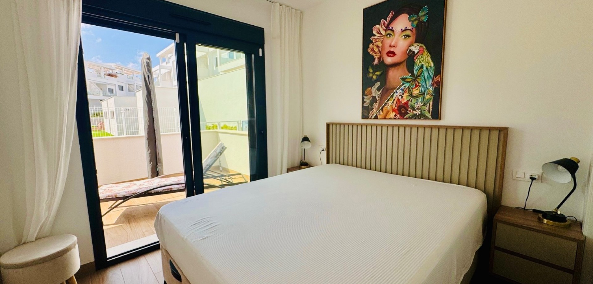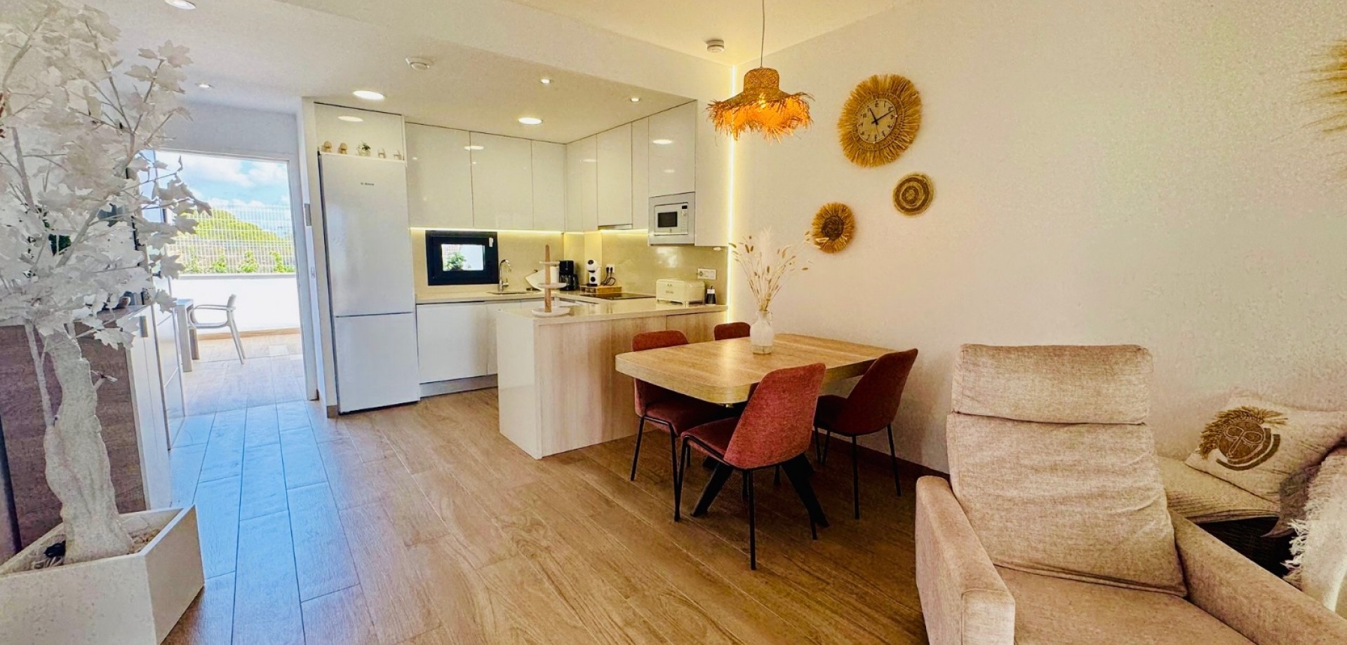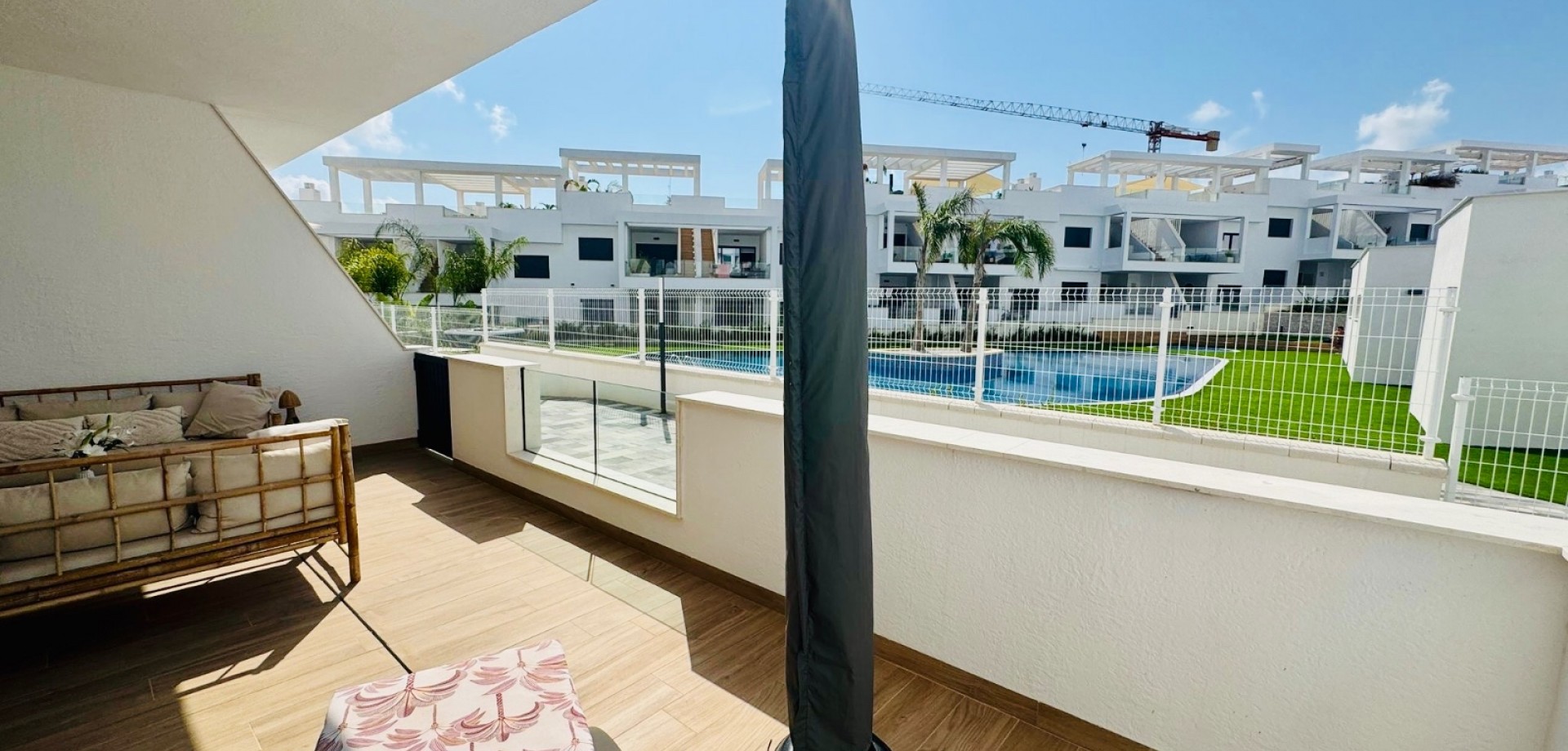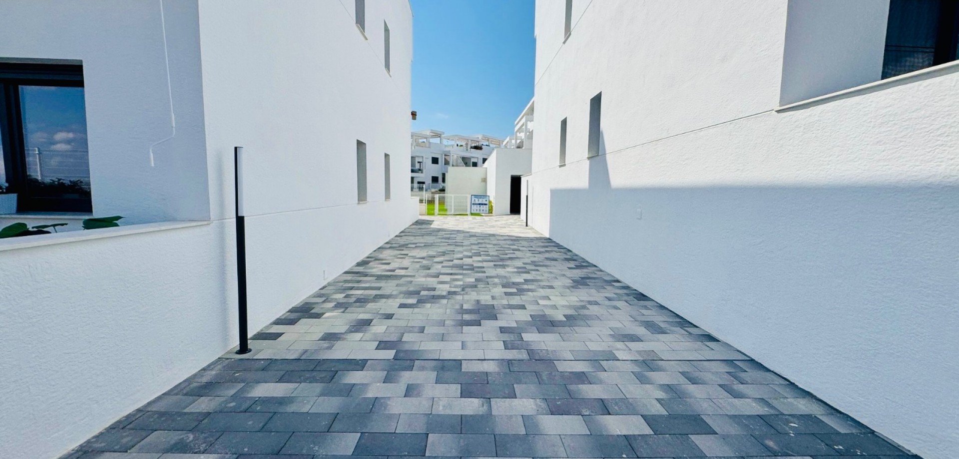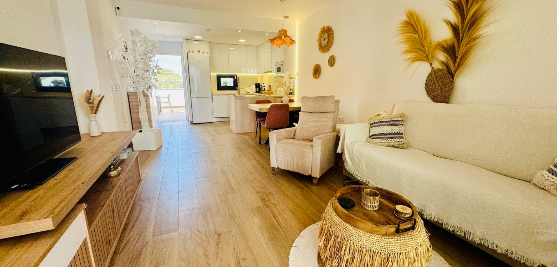 Bright South-Facing Corner Apartment with Salt Lake Views This beautifully maintained corner apartment is perfectly positioned to enjoy sunlight all year round—especially during the winter months. With its generous, south-facing terraces, residents can enjoy both sun and shade throughout the day, making it the ideal spot for relaxing or entertaining outdoors. Located in a highly accessible area with no stairs and just 12 steps from the garage to the entrance, the apartment is both convenient and comfortable. Inside, you’ll find naturally ventilated bathrooms with windows, an integrated alarm system for peace of mind, and a brand-new awning offering extra shade on sunny days. One of the standout features is the rear terrace, which boasts tranquil views of the iconic salt lakes—a serene backdrop to your daily life. As a corner unit, this apartment benefits from additional privacy, light, and space, and its original purchase price was higher than standard units in the development. With low community fees of just €40 per month and annual property tax of approximately €400, this property is not only stunning but cost-efficient too.