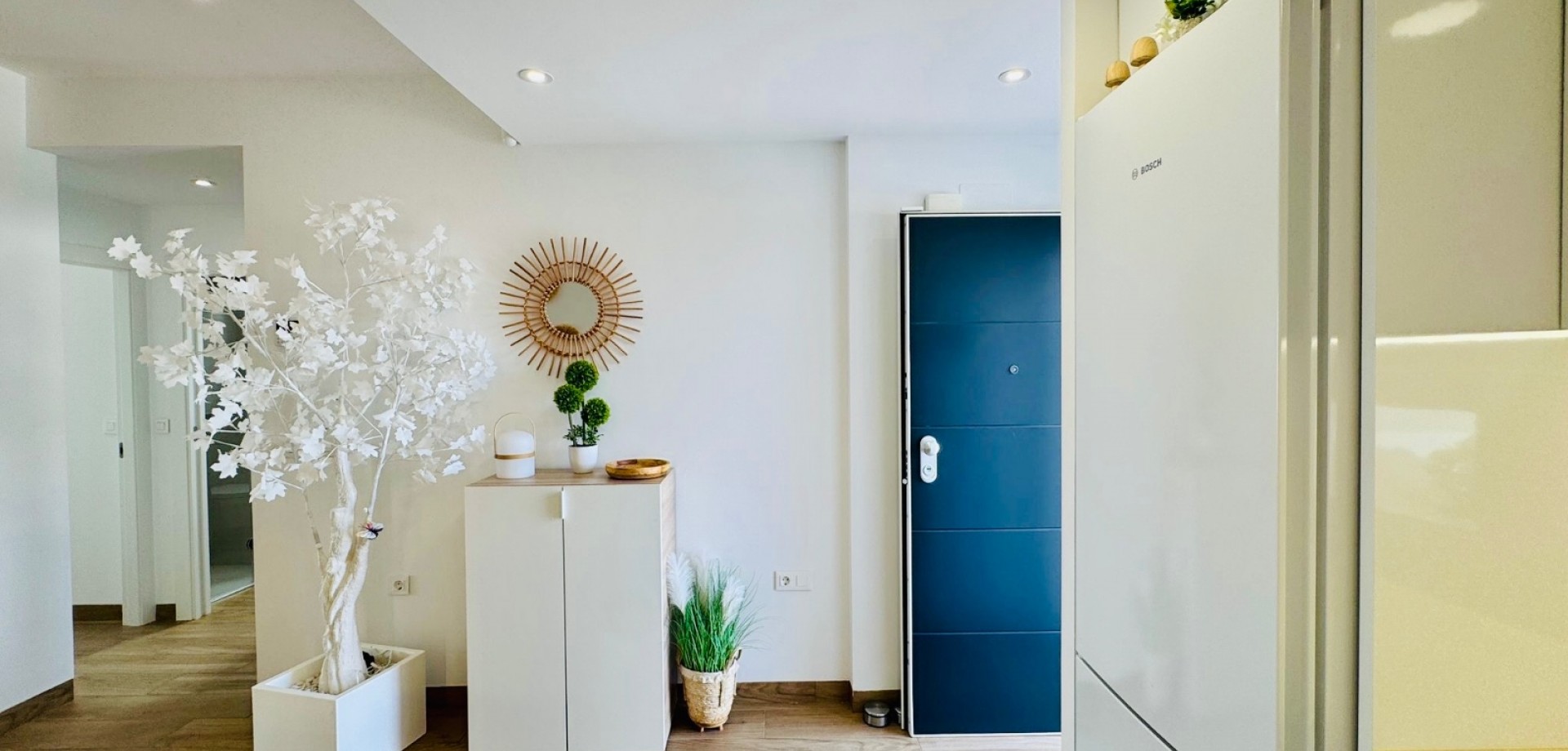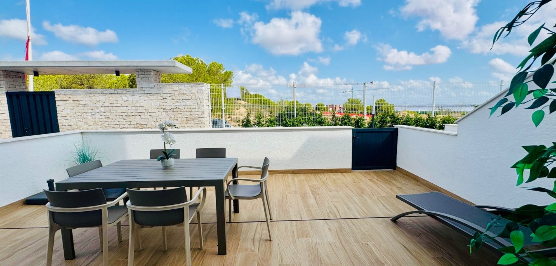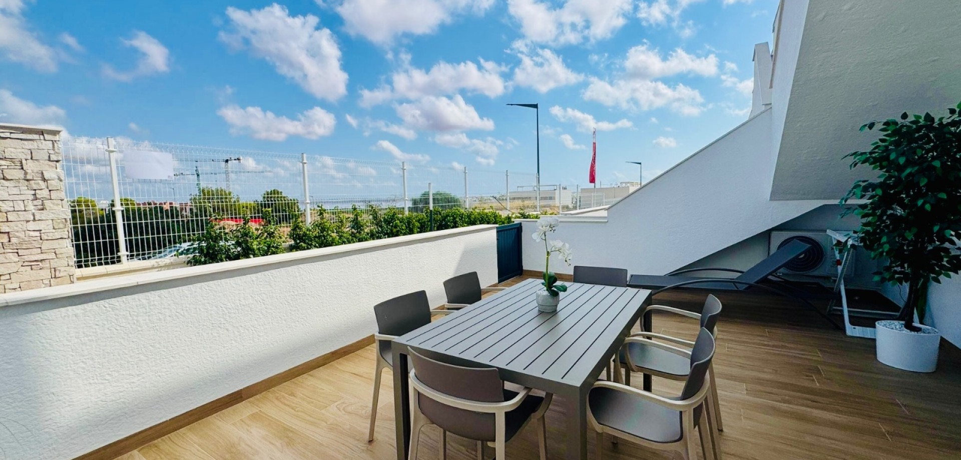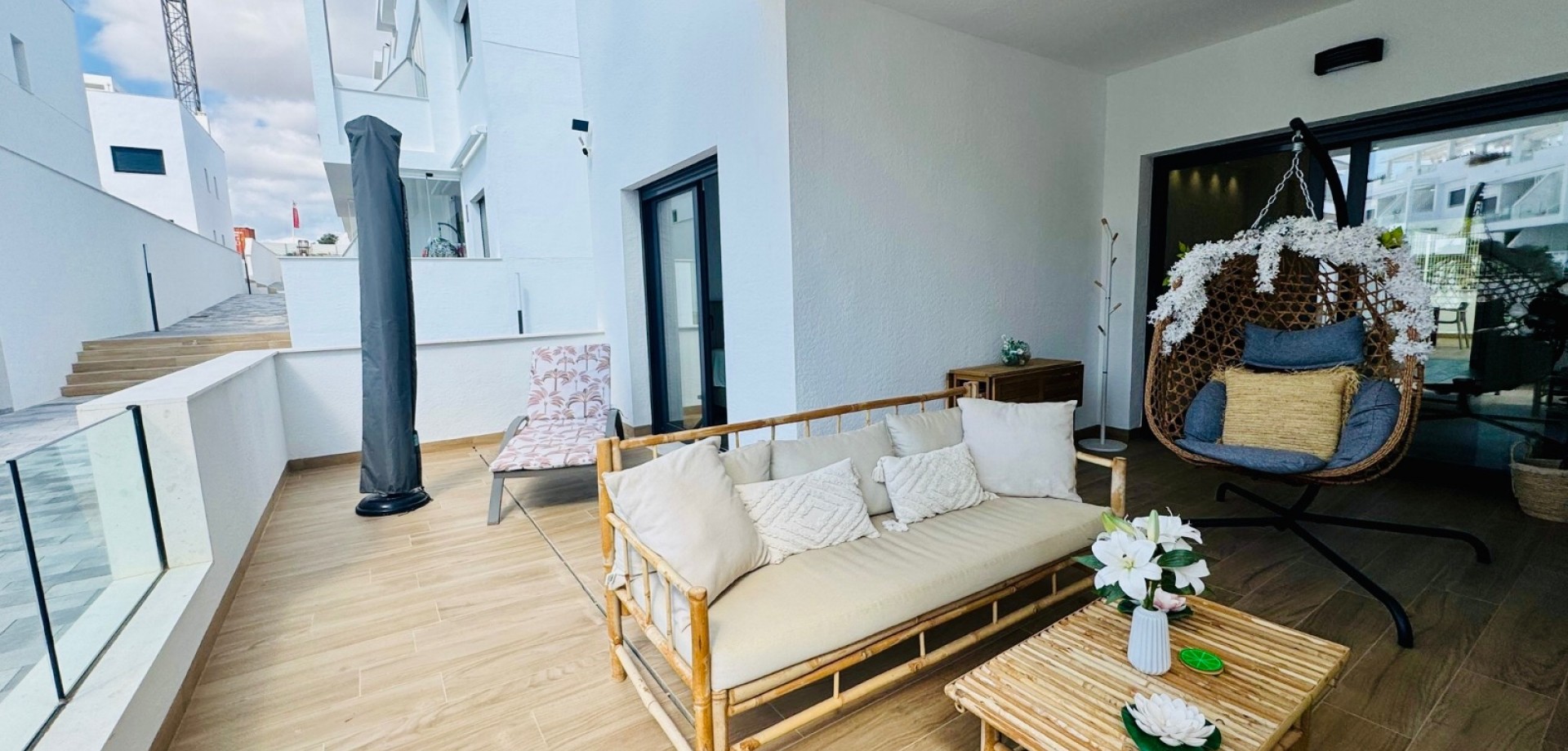 Bright South-Facing Corner Apartment with Salt Lake Views This beautifully maintained corner apartment is perfectly positioned to enjoy sunlight all year round—especially during the winter months. With its generous, south-facing terraces, residents can enjoy both sun and shade throughout the day, making it the ideal spot for relaxing or entertaining outdoors. Located in a highly accessible area with no stairs and just 12 steps from the garage to the entrance, the apartment is both convenient and comfortable. Inside, you’ll find naturally ventilated bathrooms with windows, an integrated alarm system for peace of mind, and a brand-new awning offering extra shade on sunny days. One of the standout features is the rear terrace, which boasts tranquil views of the iconic salt lakes—a serene backdrop to your daily life. As a corner unit, this apartment benefits from additional privacy, light, and space, and its original purchase price was higher than standard units in the development. With low community fees of just €40 per month and annual property tax of approximately €400, this property is not only stunning but cost-efficient too.