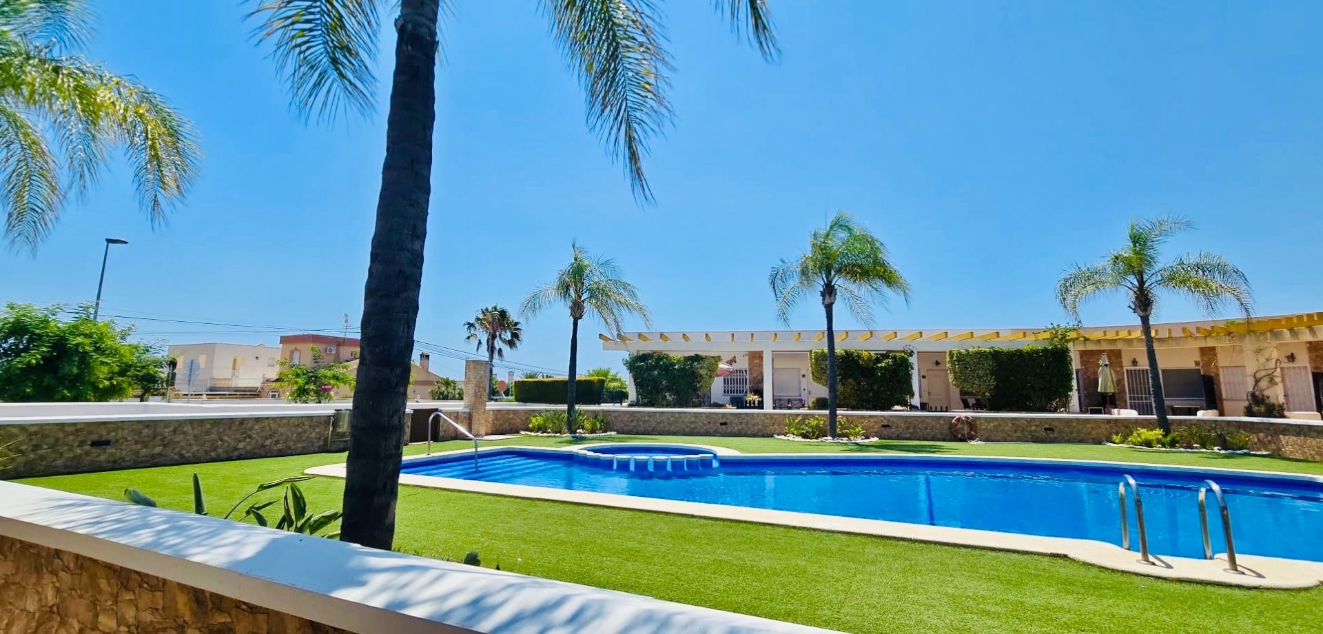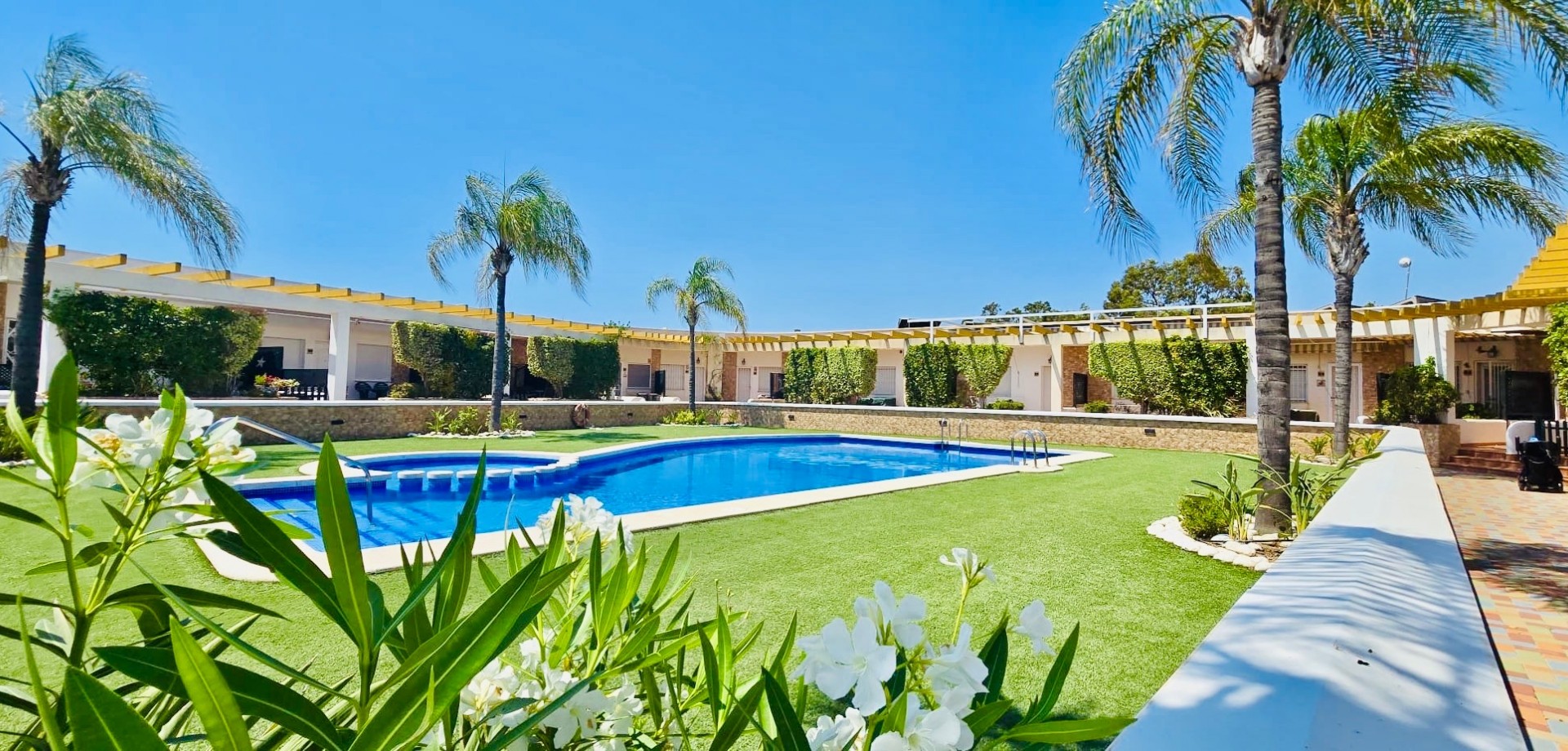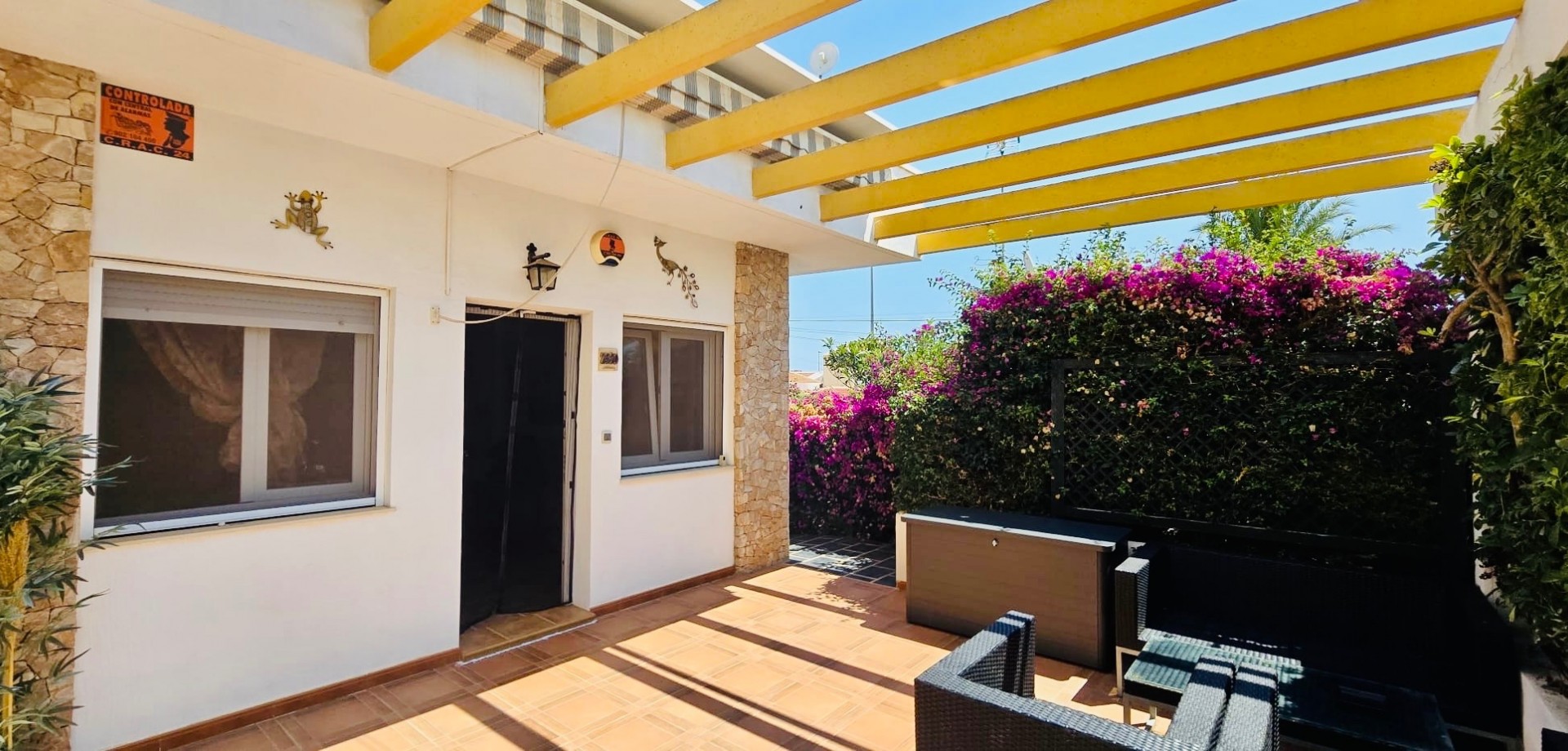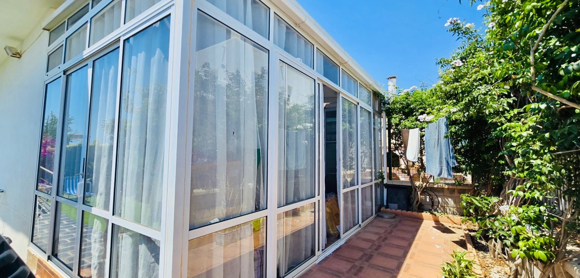This beautiful one-level townhouse is for sale in one of the most peaceful and sought-after areas, just 800 meters from the sea. It's the perfect option for a permanent residence, holiday home, or as a high-potential rental investment. With 80 m² of built area (70 m² usable) on a spacious 215 m² plot, the property offers a functional layout and is in excellent condition. It features 2 bedrooms with built-in wardrobes, 1 full bathroom, an independent kitchen, and a bright living-dining room with direct access to the terrace and private garden – ideal for enjoying the Mediterranean climate all year round. Additional features include ducted air conditioning, a private parking space included in the price, and access to a communal swimming pool, perfect for relaxing in a green, park-filled setting. The property is south-facing, ensuring plenty of natural light. Located in a quiet area yet well connected, with supermarkets, restaurants, pharmacies, public transport, and all daily services within walking distance. The house is free of debts, mortgages, or tenants, making it ready for immediate transfer to the new owner. A unique opportunity to live near the sea, surrounded by nature and peace, without giving up the comfort of nearby urban life.