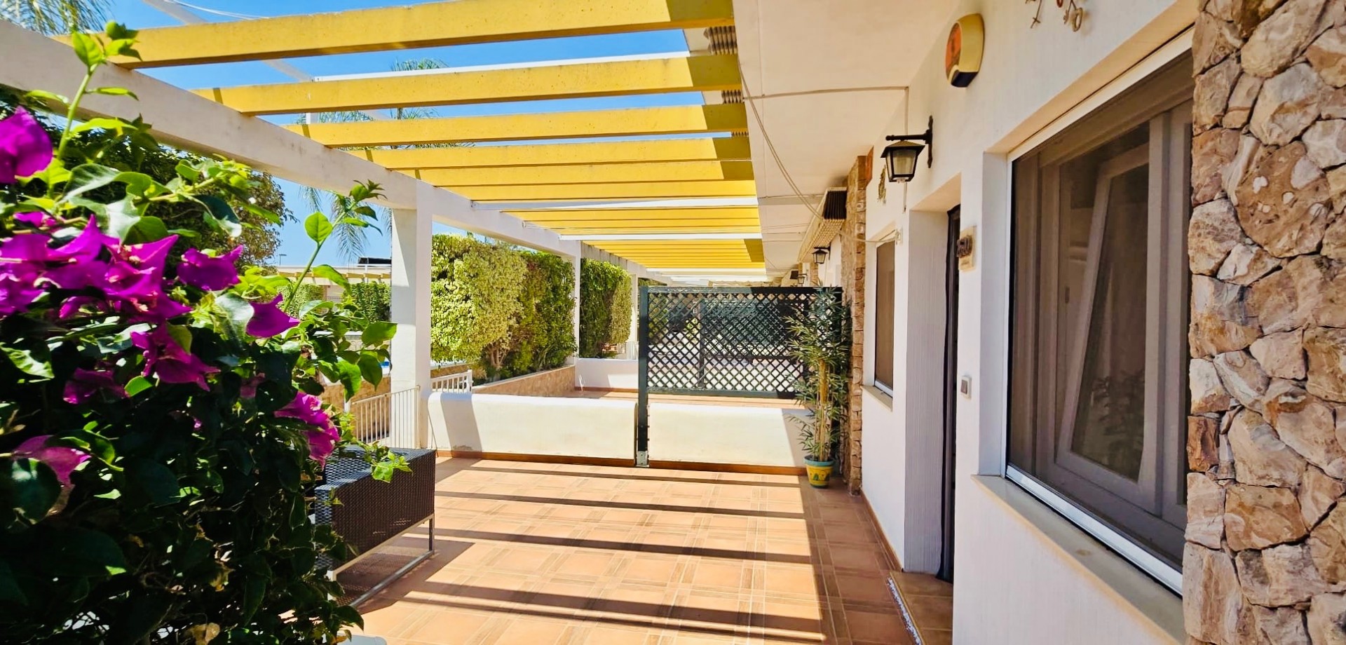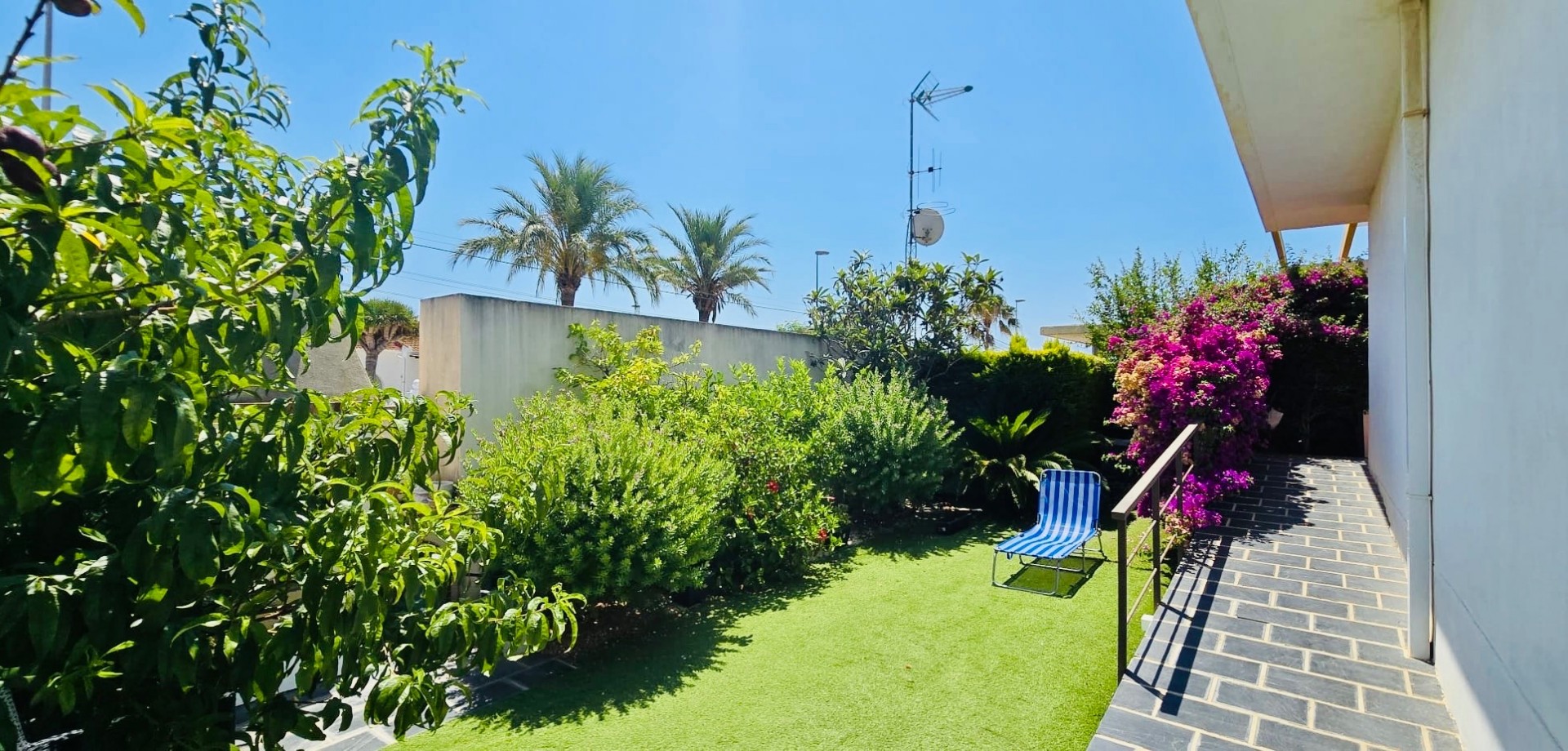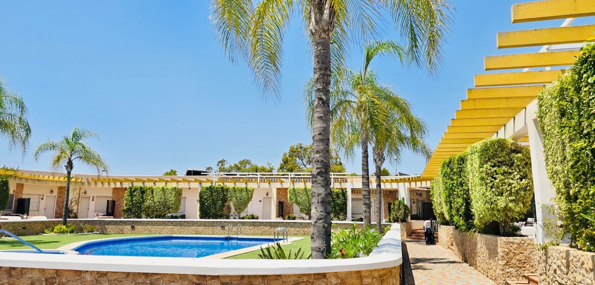 This beautiful one-level townhouse is for sale in one of the most peaceful and sought-after areas, just 800 meters from the sea. It's the perfect option for a permanent residence, holiday home, or as a high-potential rental investment. With 80 m² of built area (70 m² usable) on a spacious 215 m² plot, the property offers a functional layout and is in excellent condition. It features 2 bedrooms with built-in wardrobes, 1 full bathroom, an independent kitchen, and a bright living-dining room with direct access to the terrace and private garden – ideal for enjoying the Mediterranean climate all year round. Additional features include ducted air conditioning, a private parking space included in the price, and access to a communal swimming pool, perfect for relaxing in a green, park-filled setting. The property is south-facing, ensuring plenty of natural light. Located in a quiet area yet well connected, with supermarkets, restaurants, pharmacies, public transport, and all daily services within walking distance. The house is free of debts, mortgages, or tenants, making it ready for immediate transfer to the new owner. A unique opportunity to live near the sea, surrounded by nature and peace, without giving up the comfort of nearby urban life.