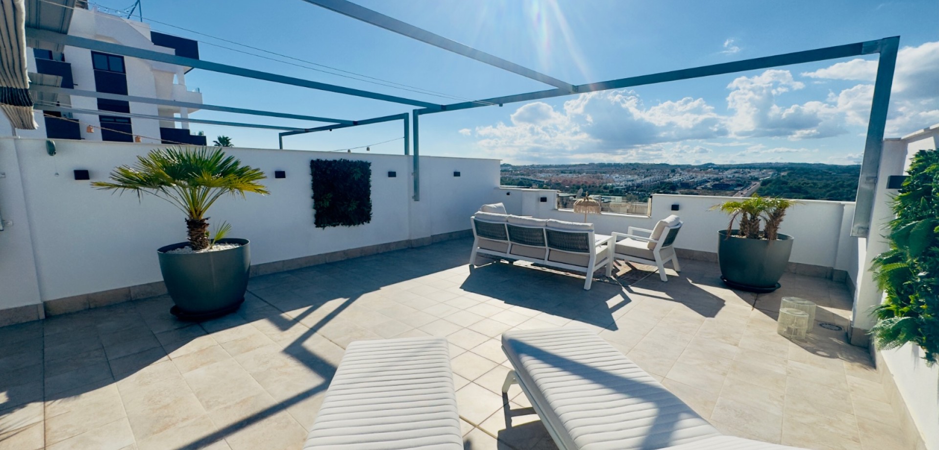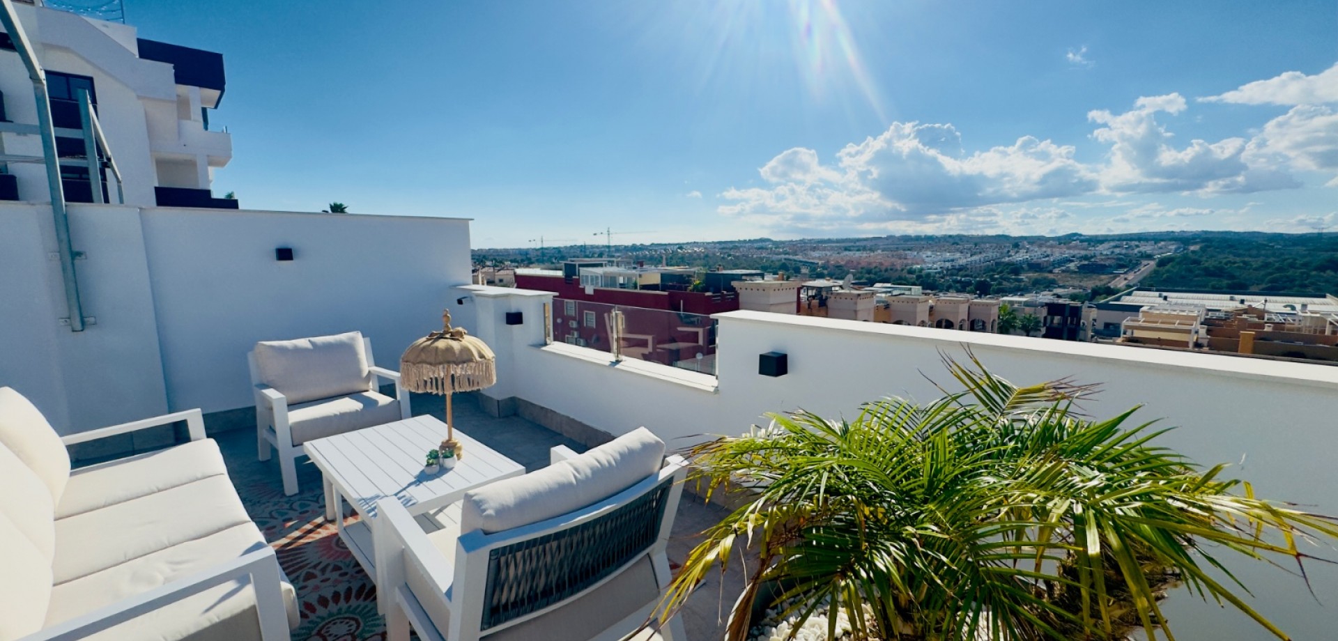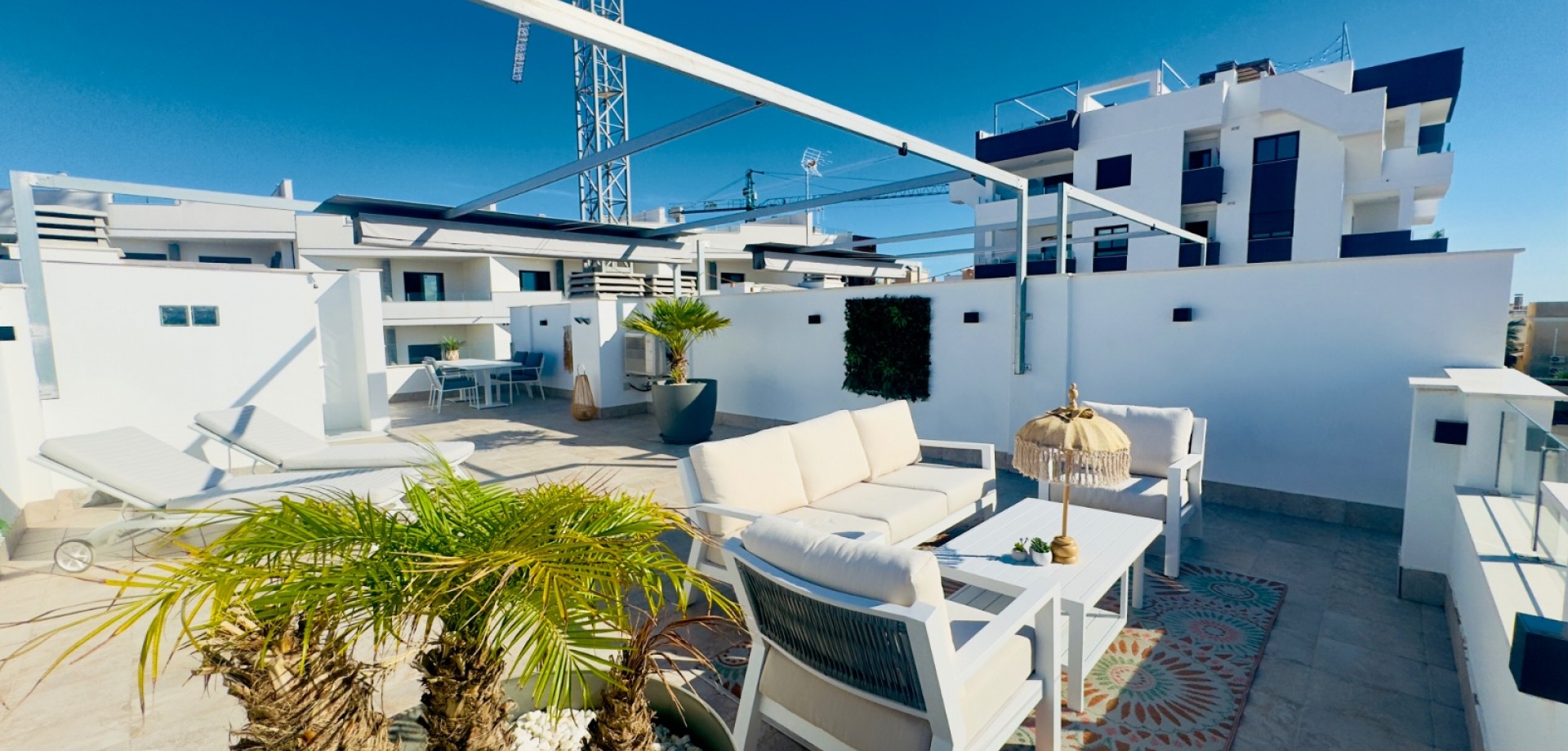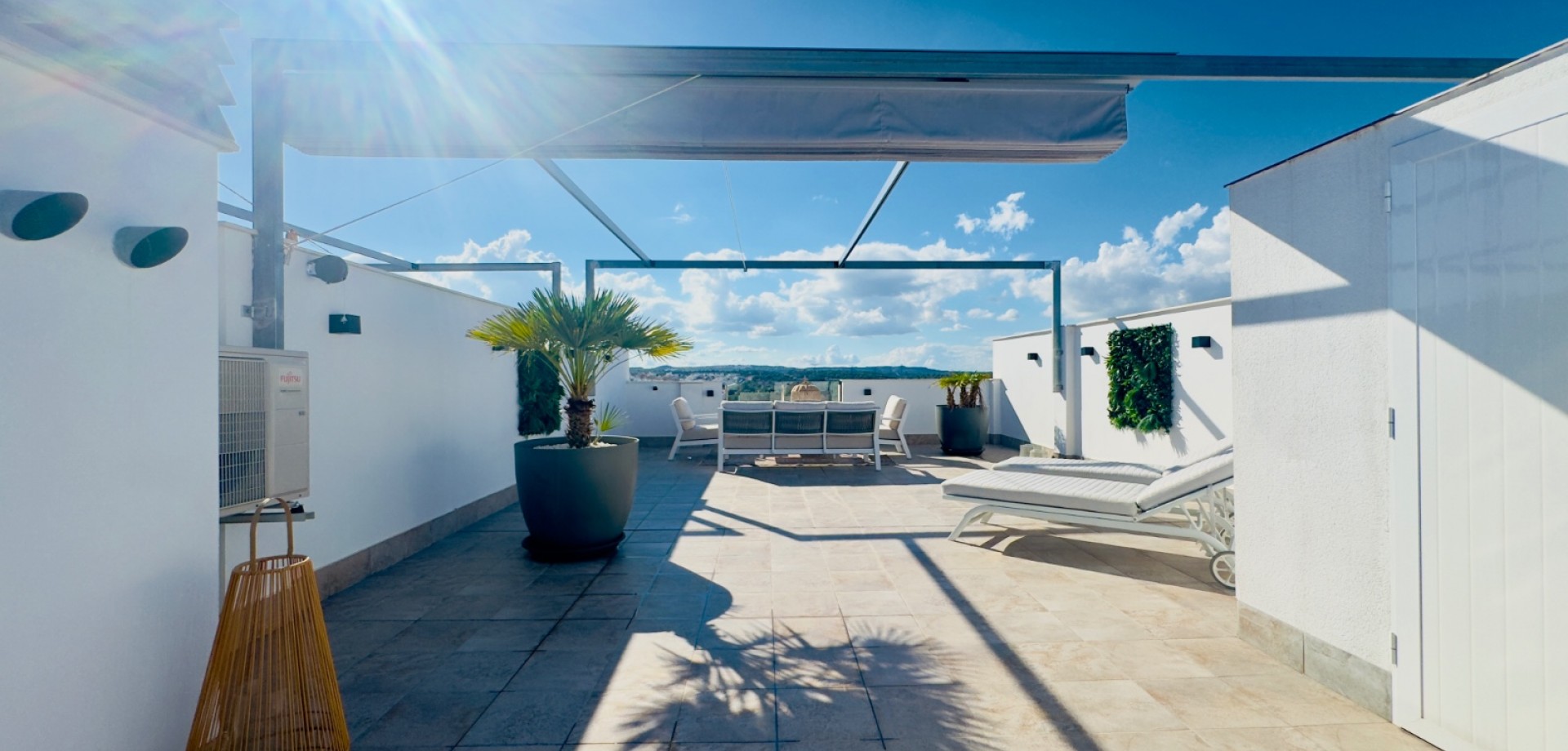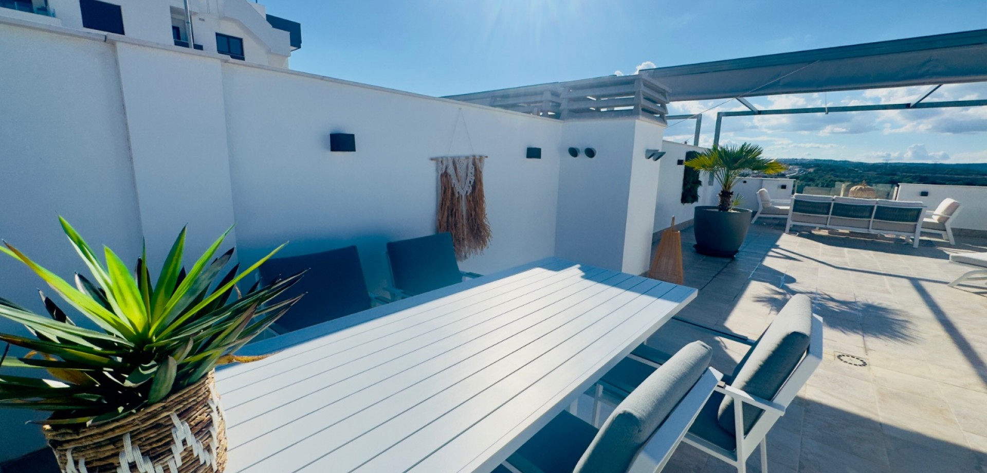 This appealing penthouse offers a perfect combination of modern design, comfort, and a privileged location in the sought-after area of Orihuela Costa. Situated in a well-maintained and secure community, this property presents an excellent option as a permanent residence, holiday home, or investment for vacation rentals. With a built area of 78 m², the apartment features two spacious bedrooms and two full bathrooms, one of which is en suite in the master bedroom. All spaces are carefully furnished and decorated in a contemporary, cozy style, ready to move in from day one. The open-plan layout of the living room, dining area, and kitchen creates a wide and bright environment, ideal for relaxing or enjoying family moments. The kitchen is fully equipped and integrates perfectly with the social area of the home. Comfort is guaranteed year-round thanks to air conditioning installed in every room. In addition, the west-facing orientation allows for spectacular sunsets from the private terraces. One of the major attractions of this home is its impressive private solarium of 78 m², an ideal space to enjoy the Mediterranean climate. This outdoor area has an exterior shower, storage space, and plenty of room to create a relaxation area, outdoor dining, or even a chill-out corner. The property also includes a private parking space within the community grounds. Among the communal areas, you can enjoy a large community pool surrounded by green areas, a well-equipped gym, a shared working space, and even a ping-pong table for leisure moments. The location is unbeatable: just a few minutes’ walk from bars, cafés and restaurants; only 5 minutes on foot from the Aldi supermarket; and 3 minutes by car from the beaches of Punta Prima. Everything you need is within reach, without giving up the tranquility and privacy this home offers. A unique property that combines style, functionality, and location. Perfect for those seeking quality of life on the Costa Blanca.