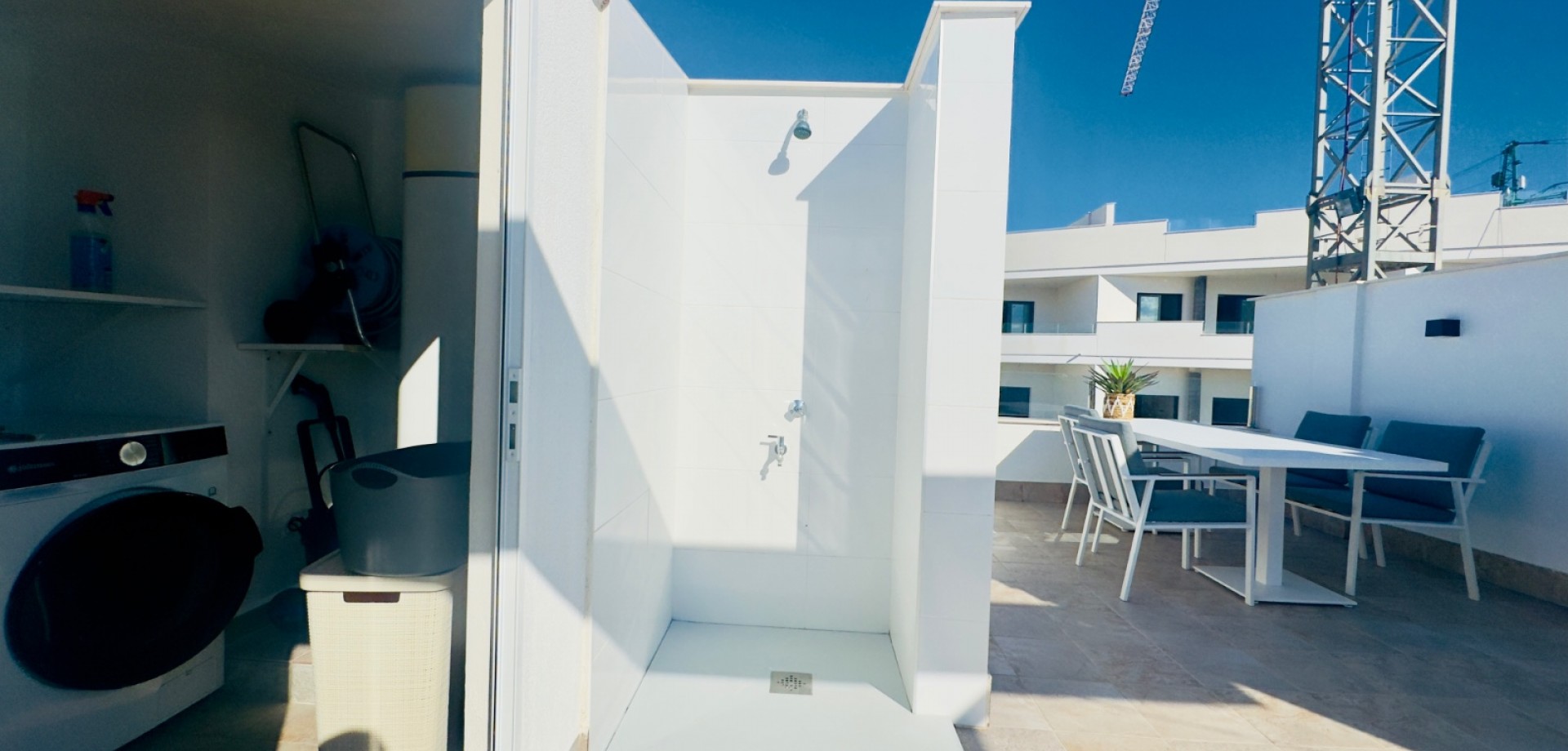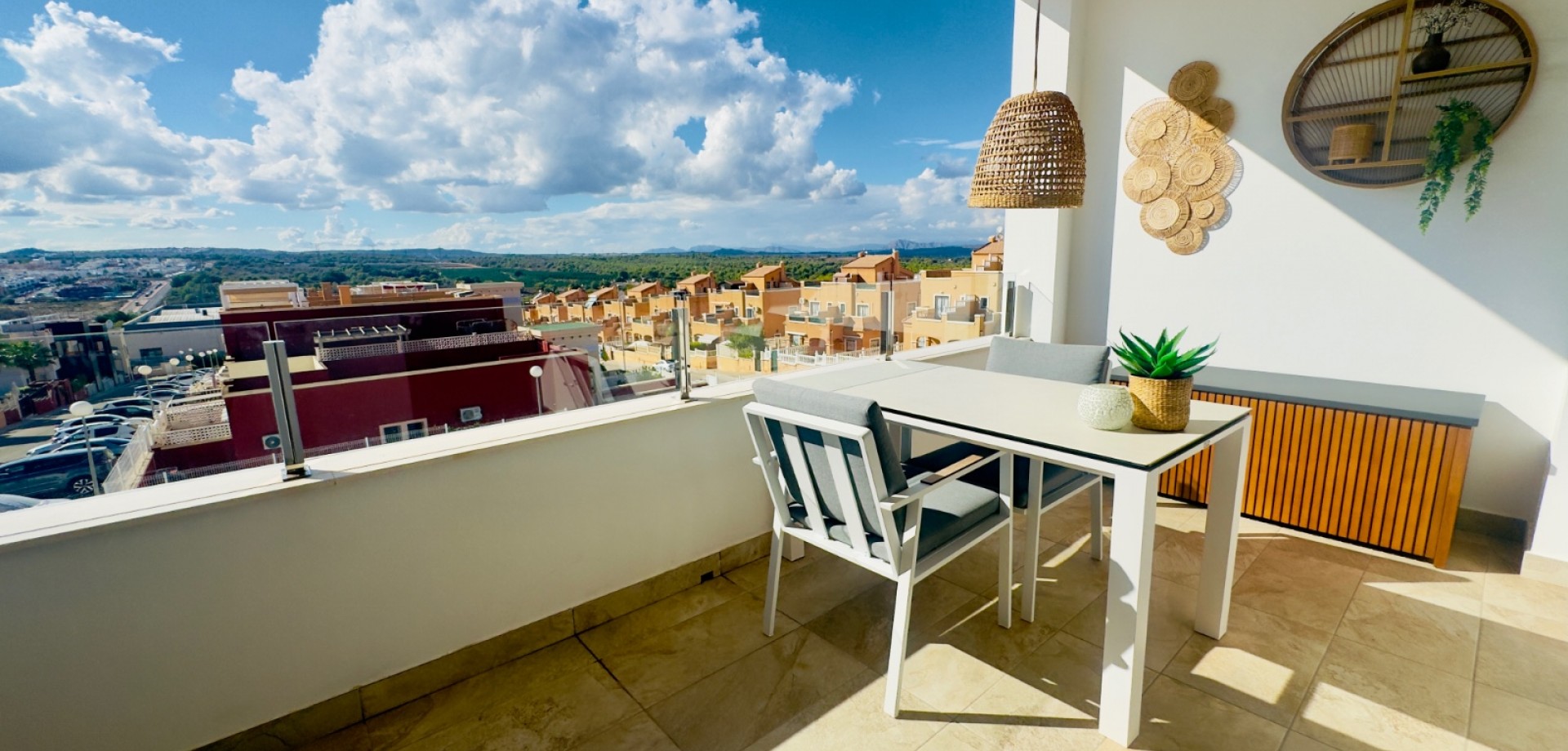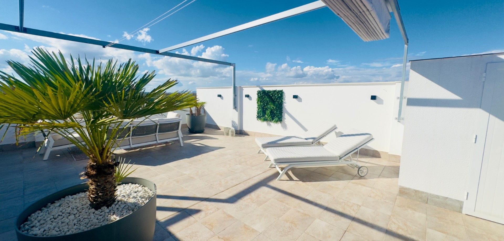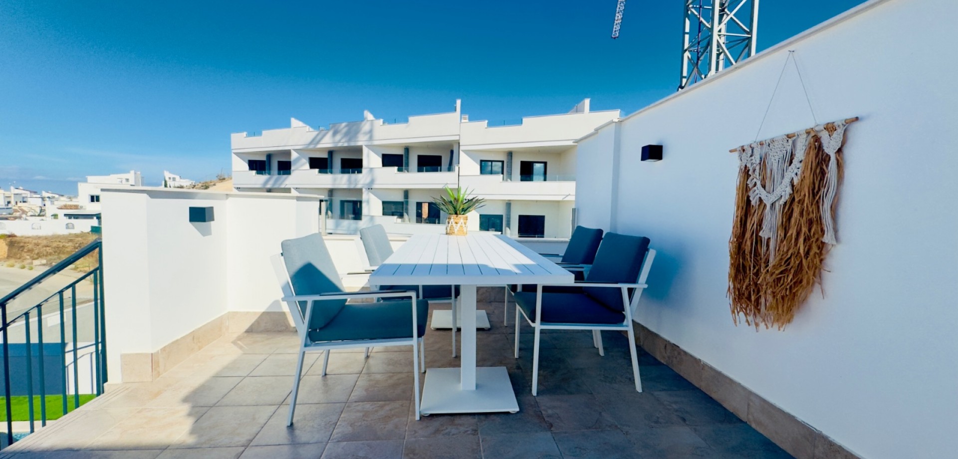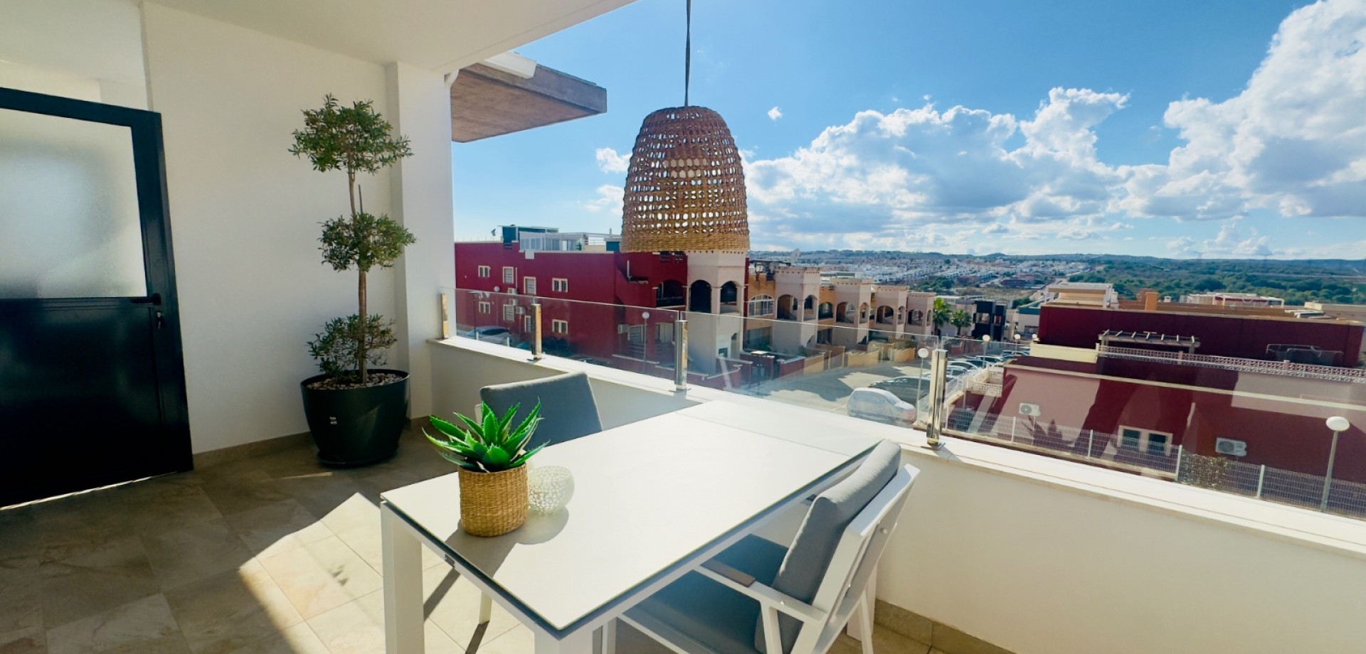 This appealing penthouse offers a perfect combination of modern design, comfort, and a privileged location in the sought-after area of Orihuela Costa. Situated in a well-maintained and secure community, this property presents an excellent option as a permanent residence, holiday home, or investment for vacation rentals. With a built area of 78 m², the apartment features two spacious bedrooms and two full bathrooms, one of which is en suite in the master bedroom. All spaces are carefully furnished and decorated in a contemporary, cozy style, ready to move in from day one. The open-plan layout of the living room, dining area, and kitchen creates a wide and bright environment, ideal for relaxing or enjoying family moments. The kitchen is fully equipped and integrates perfectly with the social area of the home. Comfort is guaranteed year-round thanks to air conditioning installed in every room. In addition, the west-facing orientation allows for spectacular sunsets from the private terraces. One of the major attractions of this home is its impressive private solarium of 78 m², an ideal space to enjoy the Mediterranean climate. This outdoor area has an exterior shower, storage space, and plenty of room to create a relaxation area, outdoor dining, or even a chill-out corner. The property also includes a private parking space within the community grounds. Among the communal areas, you can enjoy a large community pool surrounded by green areas, a well-equipped gym, a shared working space, and even a ping-pong table for leisure moments. The location is unbeatable: just a few minutes’ walk from bars, cafés and restaurants; only 5 minutes on foot from the Aldi supermarket; and 3 minutes by car from the beaches of Punta Prima. Everything you need is within reach, without giving up the tranquility and privacy this home offers. A unique property that combines style, functionality, and location. Perfect for those seeking quality of life on the Costa Blanca.