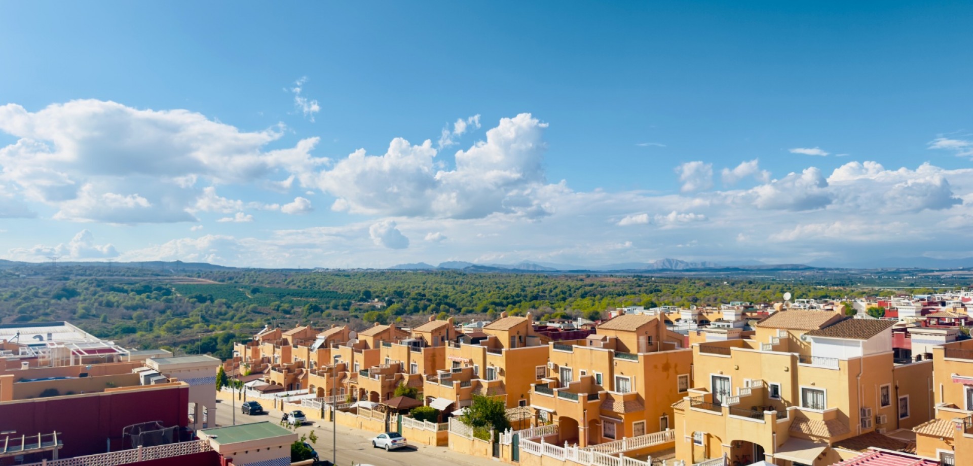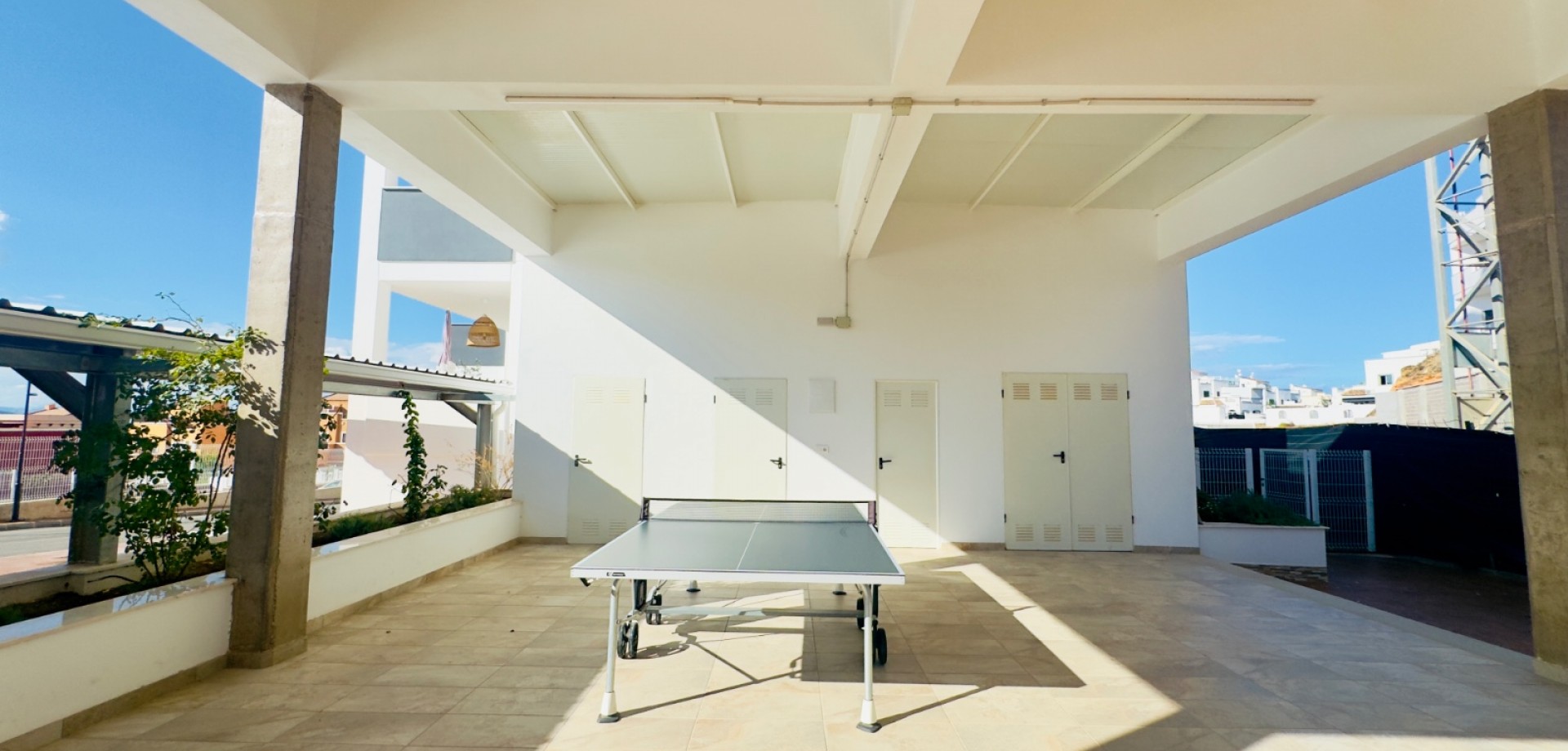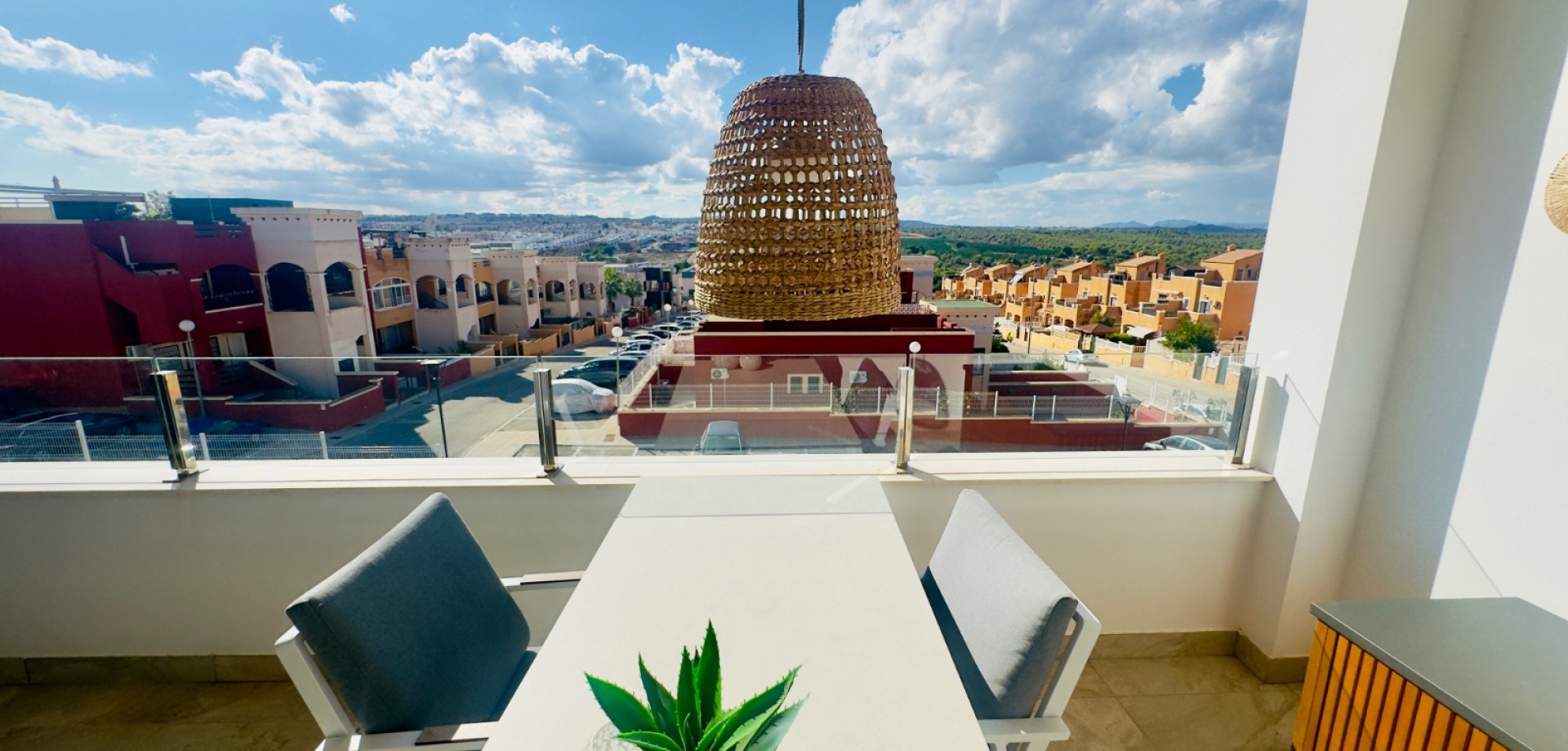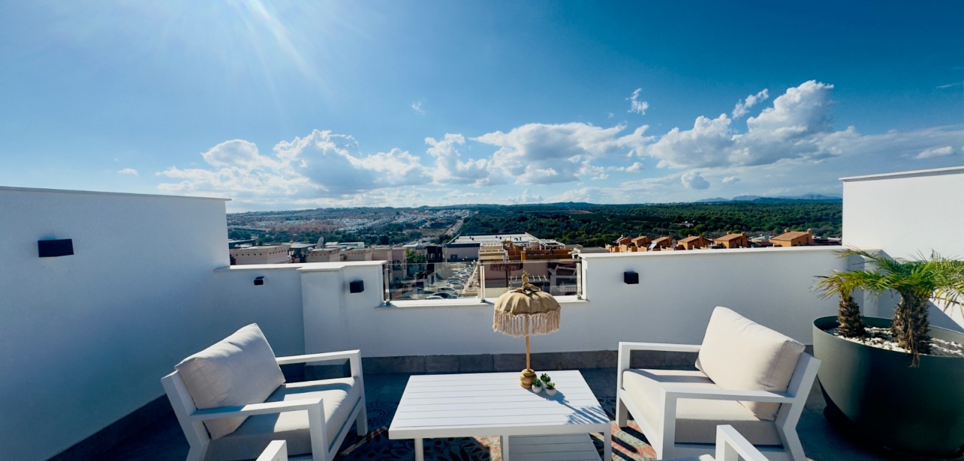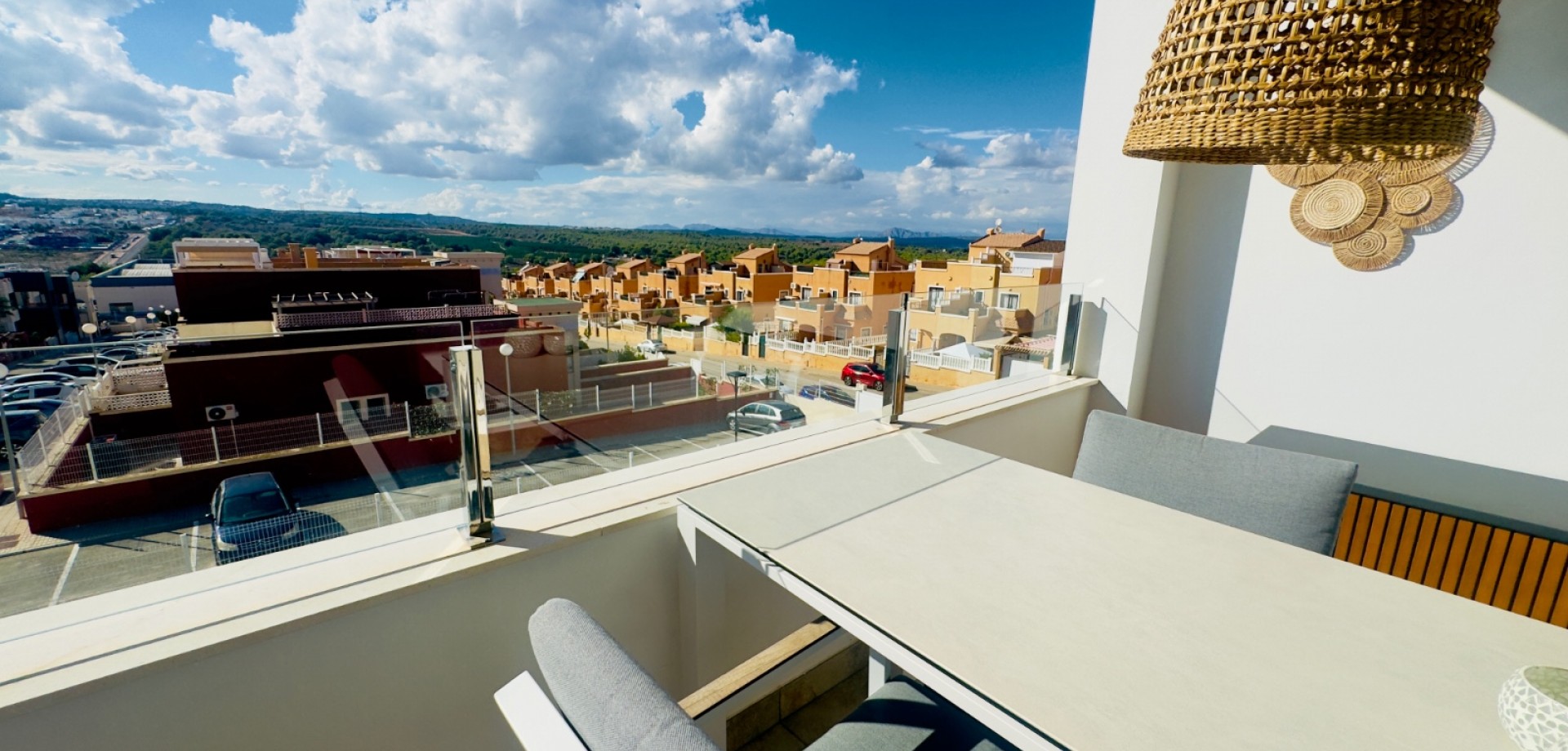 This appealing penthouse offers a perfect combination of modern design, comfort, and a privileged location in the sought-after area of Orihuela Costa. Situated in a well-maintained and secure community, this property presents an excellent option as a permanent residence, holiday home, or investment for vacation rentals. With a built area of 78 m², the apartment features two spacious bedrooms and two full bathrooms, one of which is en suite in the master bedroom. All spaces are carefully furnished and decorated in a contemporary, cozy style, ready to move in from day one. The open-plan layout of the living room, dining area, and kitchen creates a wide and bright environment, ideal for relaxing or enjoying family moments. The kitchen is fully equipped and integrates perfectly with the social area of the home. Comfort is guaranteed year-round thanks to air conditioning installed in every room. In addition, the west-facing orientation allows for spectacular sunsets from the private terraces. One of the major attractions of this home is its impressive private solarium of 78 m², an ideal space to enjoy the Mediterranean climate. This outdoor area has an exterior shower, storage space, and plenty of room to create a relaxation area, outdoor dining, or even a chill-out corner. The property also includes a private parking space within the community grounds. Among the communal areas, you can enjoy a large community pool surrounded by green areas, a well-equipped gym, a shared working space, and even a ping-pong table for leisure moments. The location is unbeatable: just a few minutes’ walk from bars, cafés and restaurants; only 5 minutes on foot from the Aldi supermarket; and 3 minutes by car from the beaches of Punta Prima. Everything you need is within reach, without giving up the tranquility and privacy this home offers. A unique property that combines style, functionality, and location. Perfect for those seeking quality of life on the Costa Blanca.