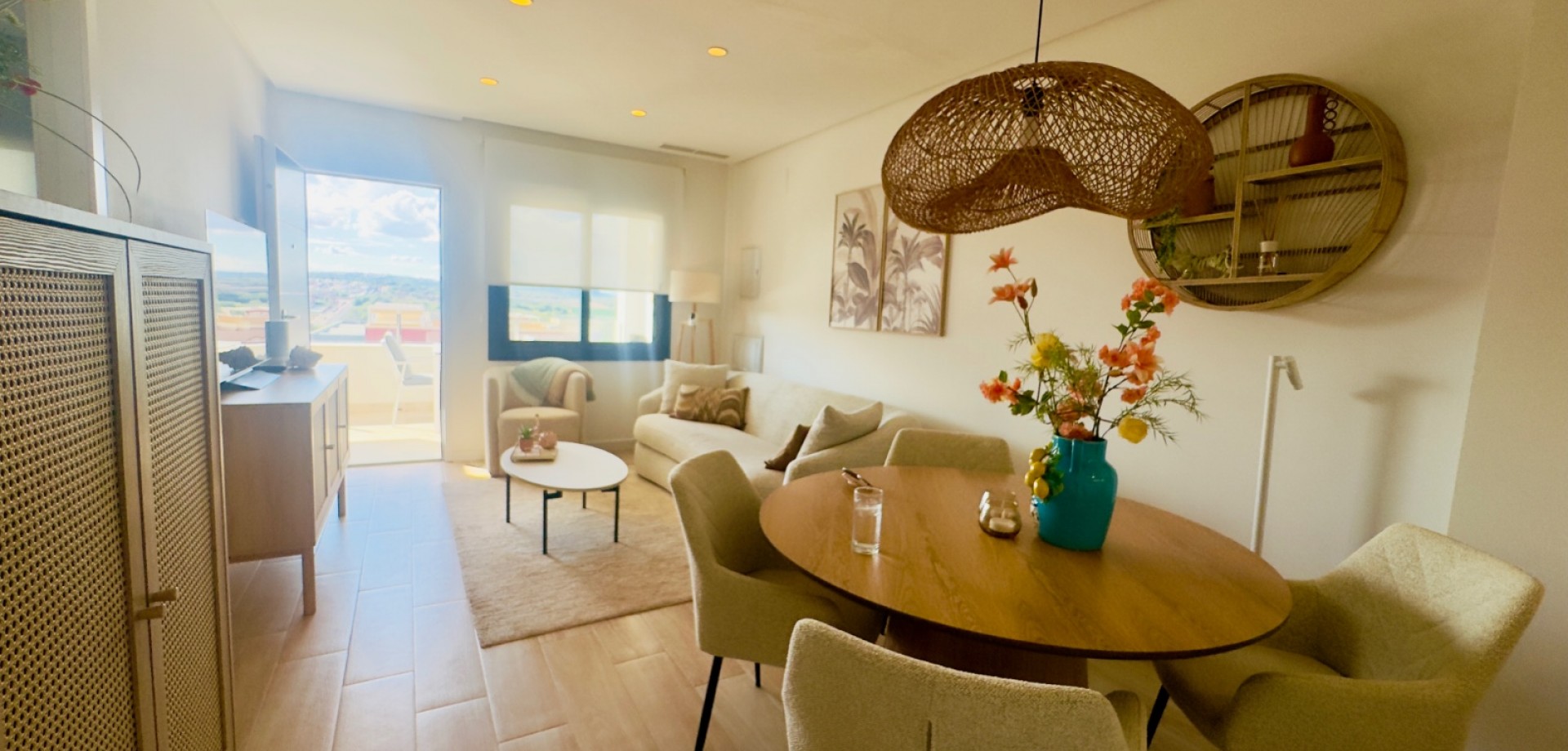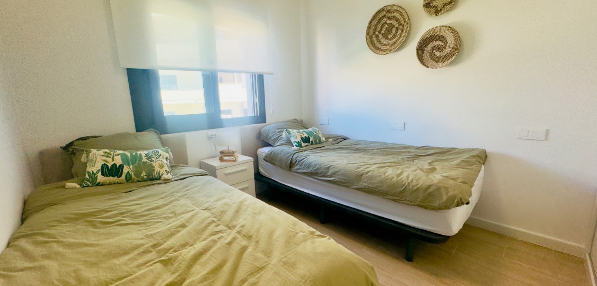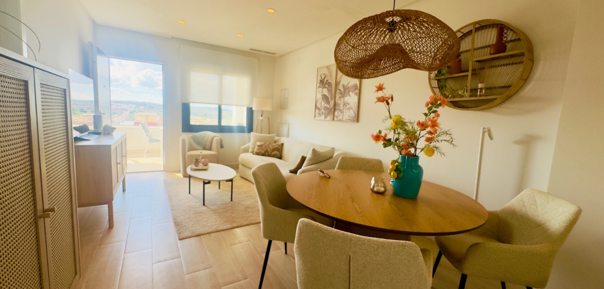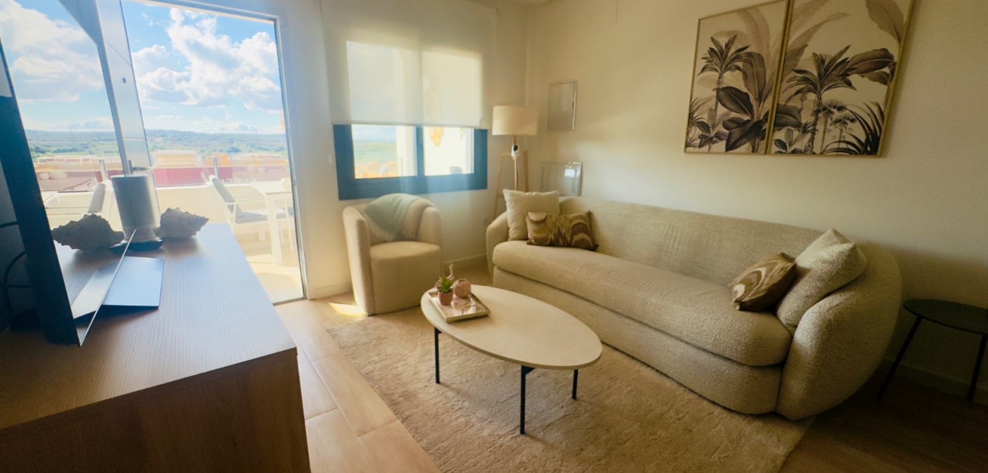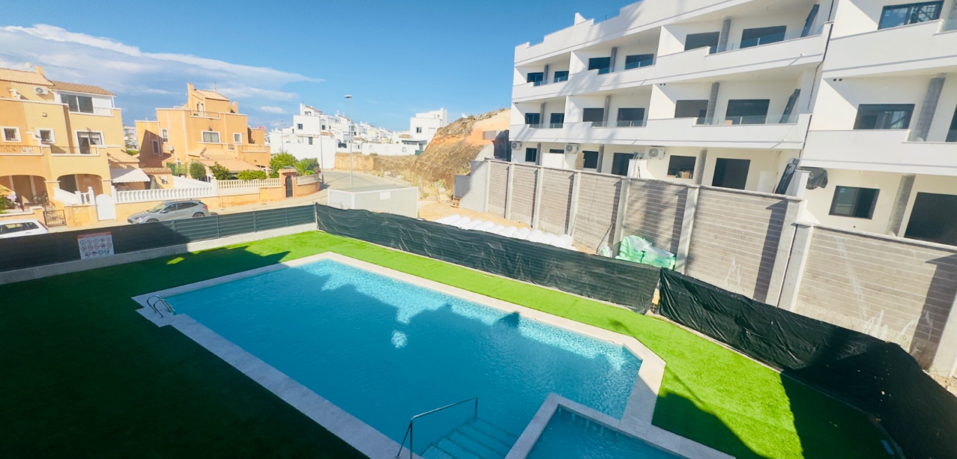 This appealing penthouse offers a perfect combination of modern design, comfort, and a privileged location in the sought-after area of Orihuela Costa. Situated in a well-maintained and secure community, this property presents an excellent option as a permanent residence, holiday home, or investment for vacation rentals. With a built area of 78 m², the apartment features two spacious bedrooms and two full bathrooms, one of which is en suite in the master bedroom. All spaces are carefully furnished and decorated in a contemporary, cozy style, ready to move in from day one. The open-plan layout of the living room, dining area, and kitchen creates a wide and bright environment, ideal for relaxing or enjoying family moments. The kitchen is fully equipped and integrates perfectly with the social area of the home. Comfort is guaranteed year-round thanks to air conditioning installed in every room. In addition, the west-facing orientation allows for spectacular sunsets from the private terraces. One of the major attractions of this home is its impressive private solarium of 78 m², an ideal space to enjoy the Mediterranean climate. This outdoor area has an exterior shower, storage space, and plenty of room to create a relaxation area, outdoor dining, or even a chill-out corner. The property also includes a private parking space within the community grounds. Among the communal areas, you can enjoy a large community pool surrounded by green areas, a well-equipped gym, a shared working space, and even a ping-pong table for leisure moments. The location is unbeatable: just a few minutes’ walk from bars, cafés and restaurants; only 5 minutes on foot from the Aldi supermarket; and 3 minutes by car from the beaches of Punta Prima. Everything you need is within reach, without giving up the tranquility and privacy this home offers. A unique property that combines style, functionality, and location. Perfect for those seeking quality of life on the Costa Blanca.